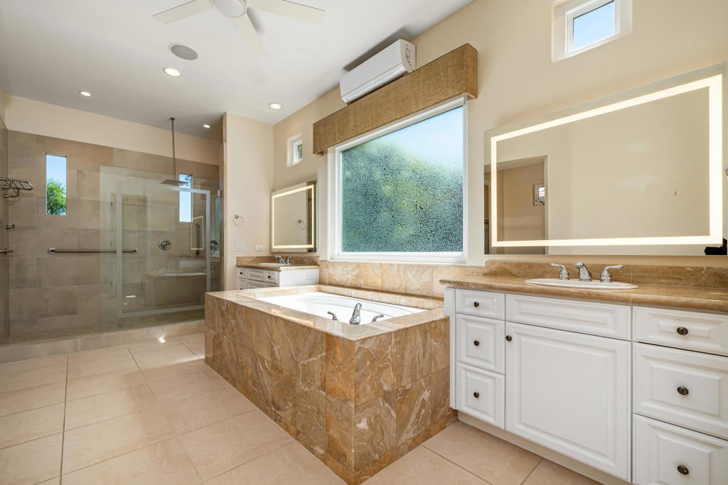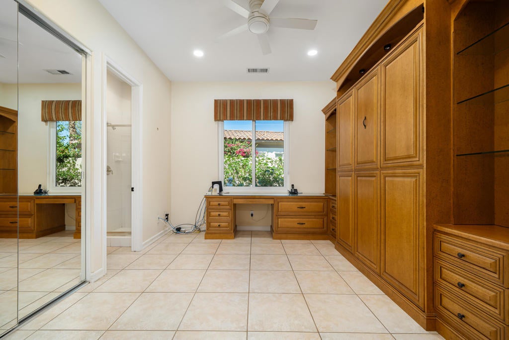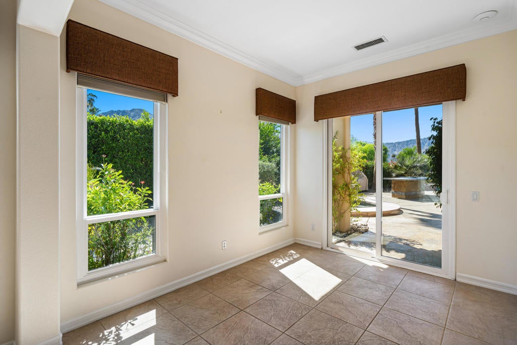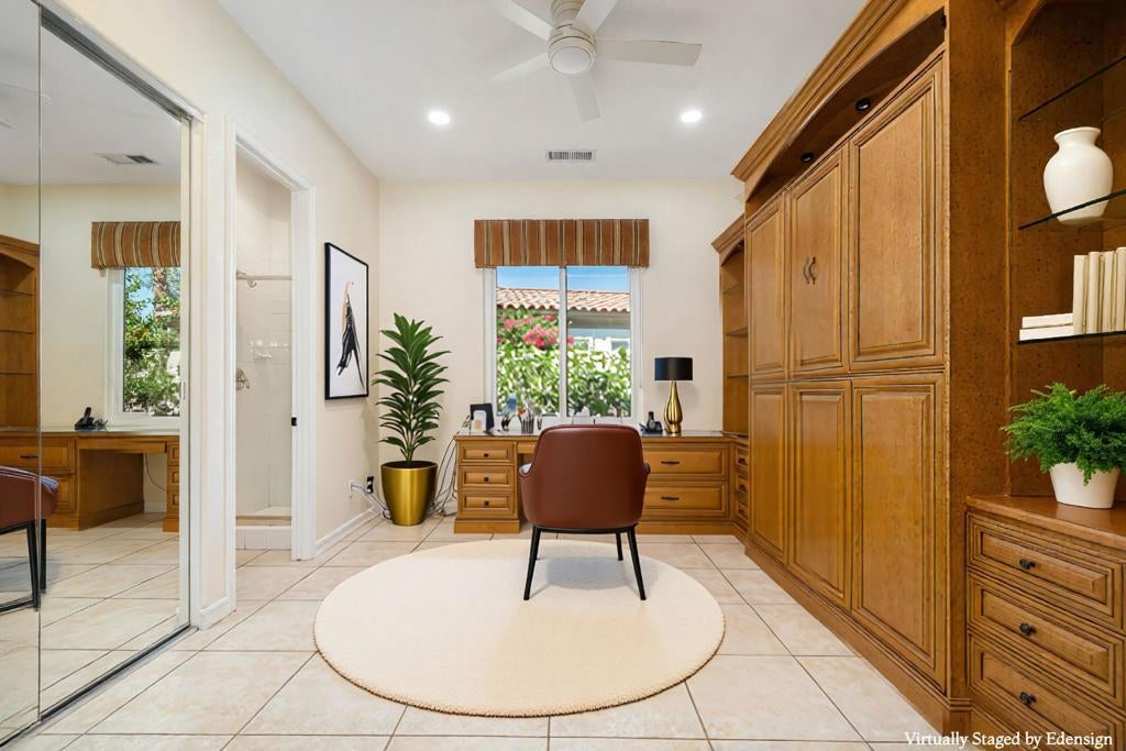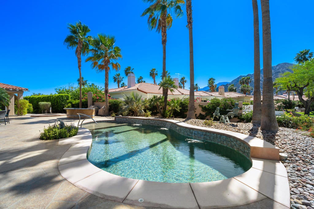 Perfectly positioned within The Citrus Club, this beautifully upgraded Trovita 2 residence offers refined desert living on an oversized 13,000+ square foot premium lot. Enjoy your morning coffee on your expansive patio with sweeping double fairway views and panoramic vistas of the Santa Rosa Mountains. At the heart of the home, a custom-renovated kitchen with stainless steel appliances and a walk-in pantry opens to the family room, while a wall of glass sliders invites the outdoors in. Designed with comfort and flexibility in mind, each bedroom offers its own en suite bath, ideal for visiting guests. The third guest bedroom is currently configured as an office with a built-in workspace. The property has been meticulously maintained and boasts remote controlled window coverings and exterior retractable awnings. The formal living and dining area feature a custom built-in, temperature-controlled wine cabinet. Multiple seating and gathering areas create the perfect environment for hosting friends or simply enjoying the peaceful desert surroundings. Enjoy your private gazebo in the afternoons or take in the sunset by your firepit in the evenings overlooking both the 13th and 14th fairways of the Pete Dye designed golf course. A rare opportunity to own one of the most desirable view properties in The Citrus. Close proximity to the Desert International Horse Park, SilverRock Golf Course, Old Town La Quinta, El Dorado and Empire Polo, Thermal Race Track, Thermal Airport and more. HOA inc cable/wifi, front landscaping, 24/7 guard gate.