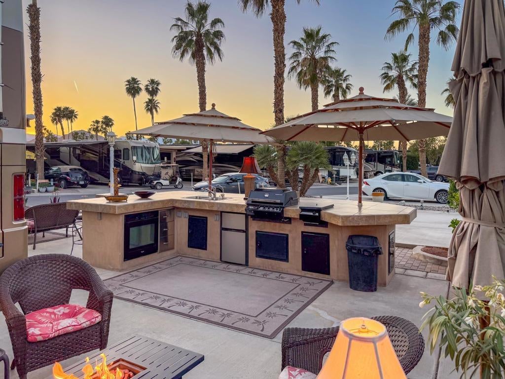 Welcome to another exceptional opportunity at Outdoor Resort Indio, one of the premier Class A motorcoach resorts in the Coachella Valley. Designed with entertaining and comfort in mind, this lot centers around a gazebo with shades and a newer top, creating a comfortable outdoor living space throughout the desert season.The medium-sized outdoor kitchen is thoughtfully equipped with an electric stove, refrigerator, built-in BBQ, two-burner cooktop, garbage disposal, and hot water sink, along with two additional freestanding bar refrigerators -- ideal for hosting gatherings. Seating is abundant and inviting, including a dining table with six red-cushioned chairs, a fire table surrounded by four wicker chairs, two wicker loveseats with matching coffee tables, round and square bar stools, and additional glass end tables to complete the entertaining setup.Practical features include a water softener, a large storage shed, two plastic storage bins, and even a golf cart with cover included for easy access around the resort. Located just a short walk to a satellite pool with hot tub and sauna, this lot offers the perfect blend of relaxation, convenience, and vibrant resort living at Outdoor Resort Indio.Outdoor Resort Indio is a Class A only RV resort