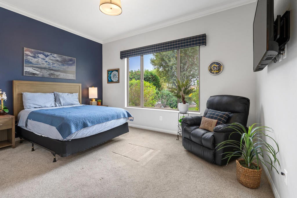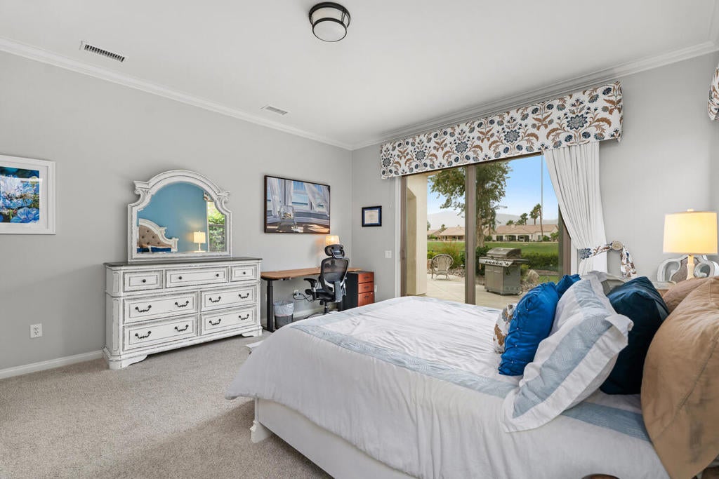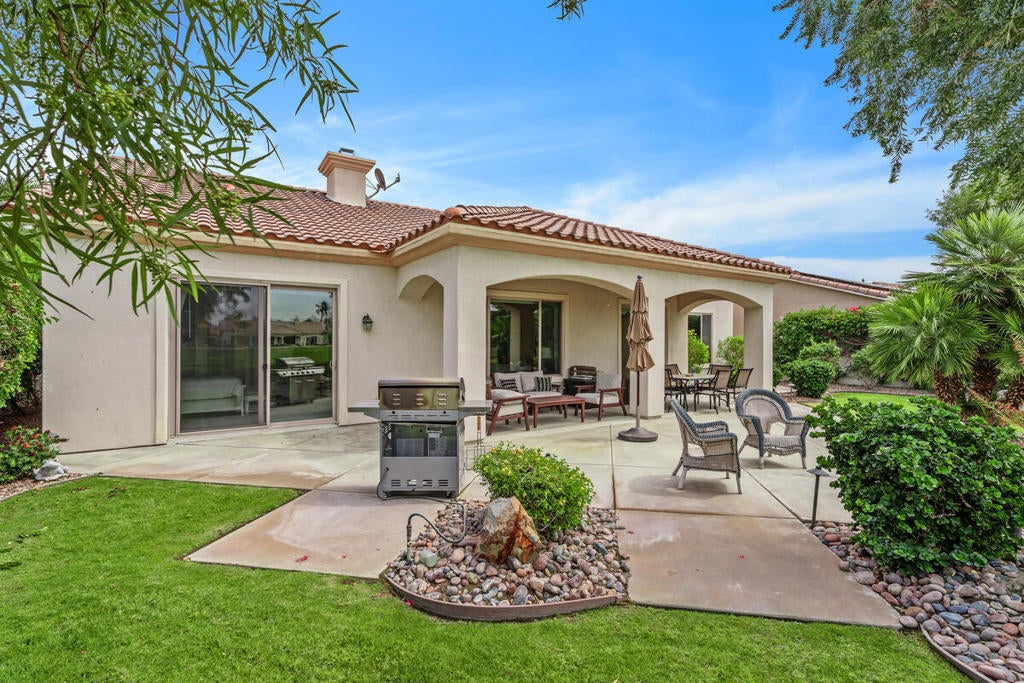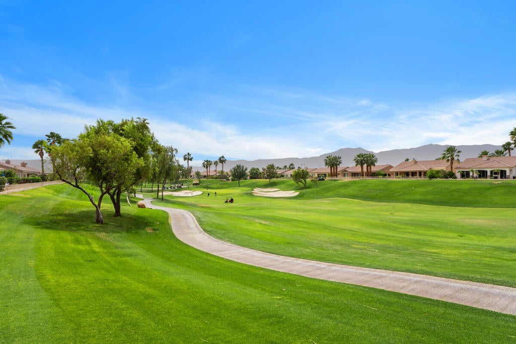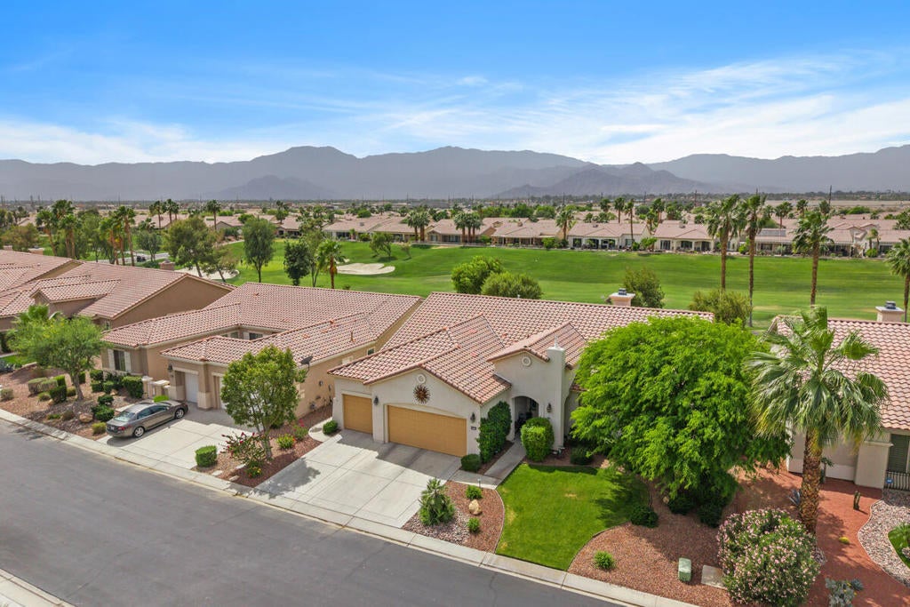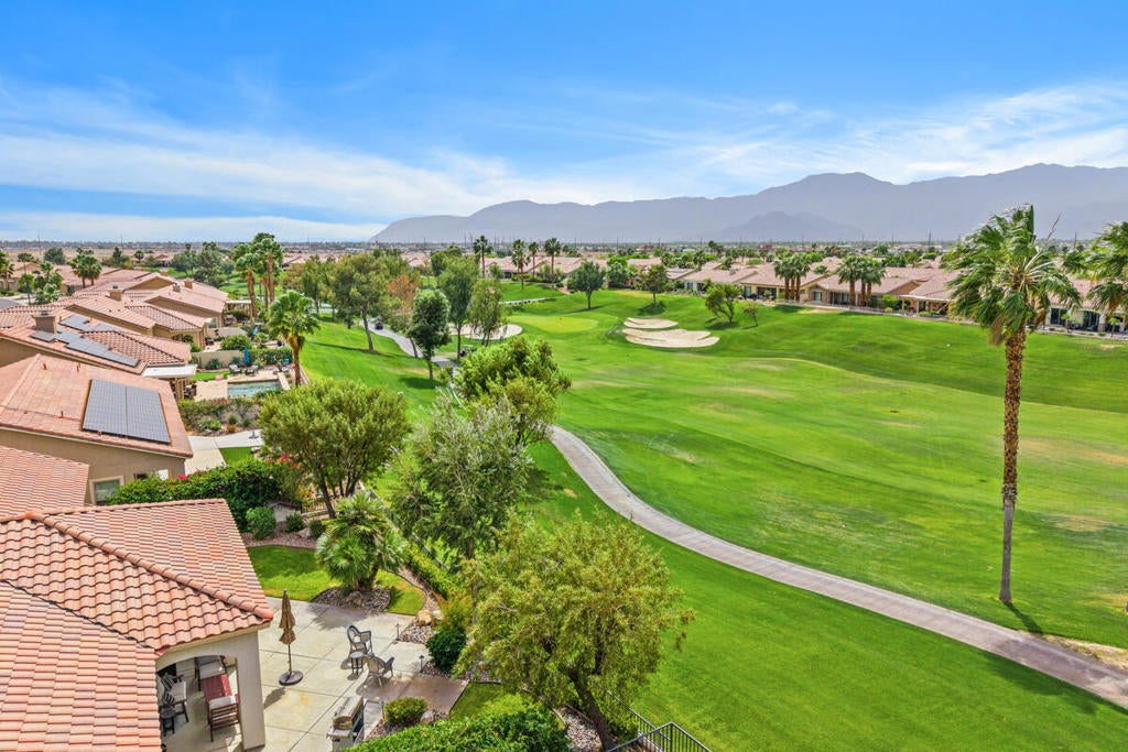 Presenting a rare chance to own the highly sought after San Rafael model ideally situated on the golf course with a spacious, south-facing lot. This exceptional home features three full bedrooms, an additional office or den, two and a half bathrooms, and a FULL 3-CAR GARAGE to accommodate all your needs. Enjoy breathtaking sunsets from the oversized backyard, which features both water and panoramic views of the magnificent Santa Rosa mountain range. The outdoor space is perfect for relaxing or entertaining, offering an unmatched setting within the community. The home is thoughtfully updated with a modern kitchen featuring QUARTZ COUNTERTOPS and newer appliances. Additional highlights include a 2019 HVAC system for year-round comfort, a mini-split AC unit in the garage, a NEW LG washer and dryer, as well as an extra refrigerator and upright freezer in the garage. The garage also offers new cabinetry and overhead storage, while the bedrooms are fitted with NEW carpeting. The sale includes NEW patio furniture and a golf cart equipped with NEW batteries. Enhanced with numerous technology advancements, such as smart home switches, automated blinds, and a surround sound system, ensuring both comfort and convenience for modern living. PRIME LOCATION. Location is key--this property is just a five-minute walk from the main Montecito Clubhouse, making it easy to enjoy the community's extensive amenities. RESORT STYLE LIVING-Sun City Shadow Hills is a renowned 55+ active adult community known for its vibrant atmosphere and exceptional resort-style amenities. Residents enjoy access to two expansive clubhouses, each equipped with state-of-the-art fitness centers, indoor and outdoor pools, relaxing spas, and a robust calendar of classes and events. The community features two meticulously maintained championship golf courses, as well as courts for tennis and pickleball. Social clubs abound, catering to a wide range of interests including arts and crafts, travel, and dining. Additional recreational opportunities include Pickleball, Tennis, bocce, billiards, and participation in over 50 different social clubs, ensuring an active and fulfilling lifestyles for all residents.