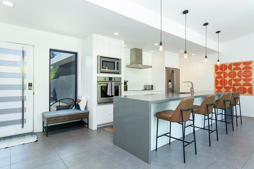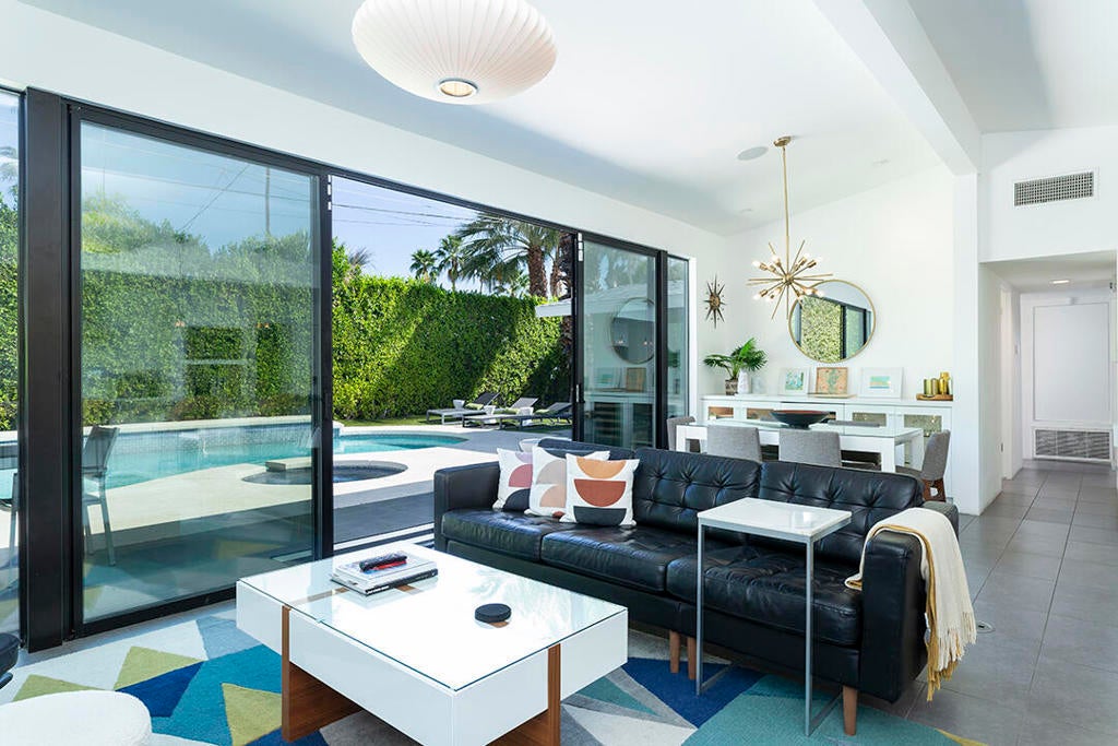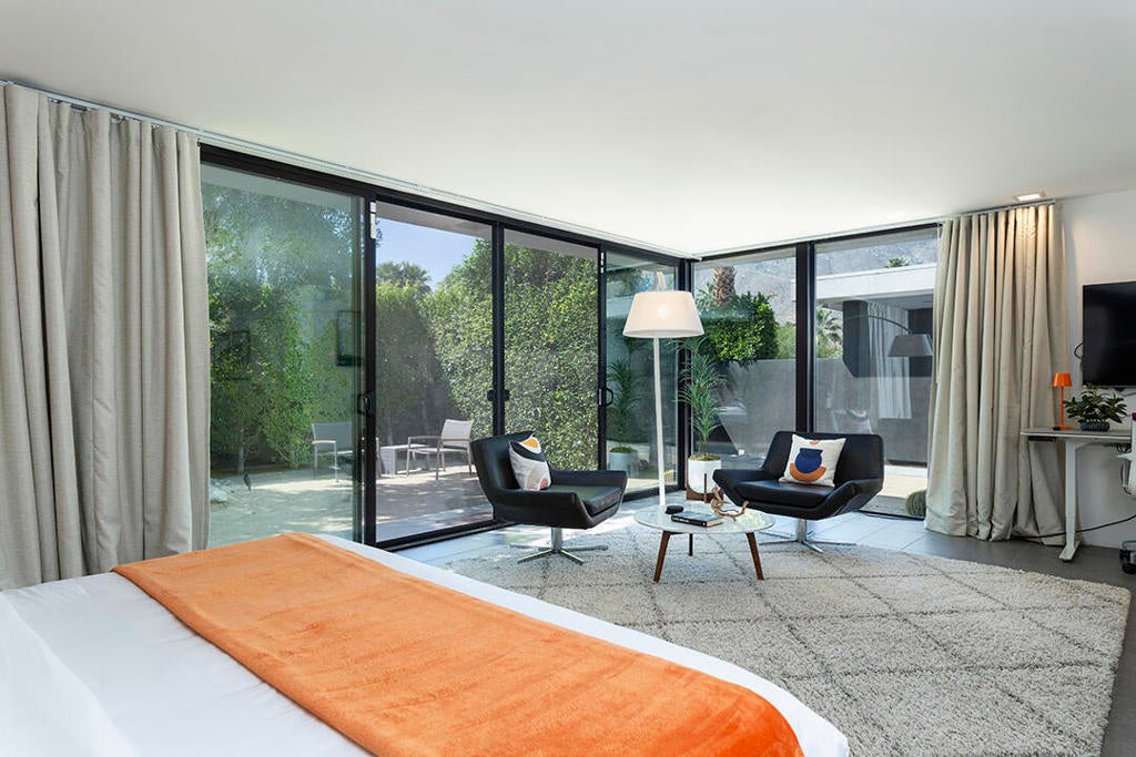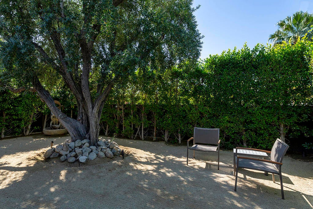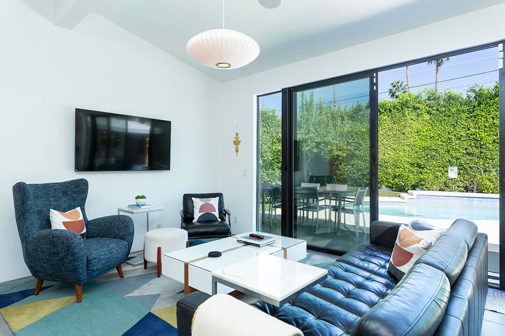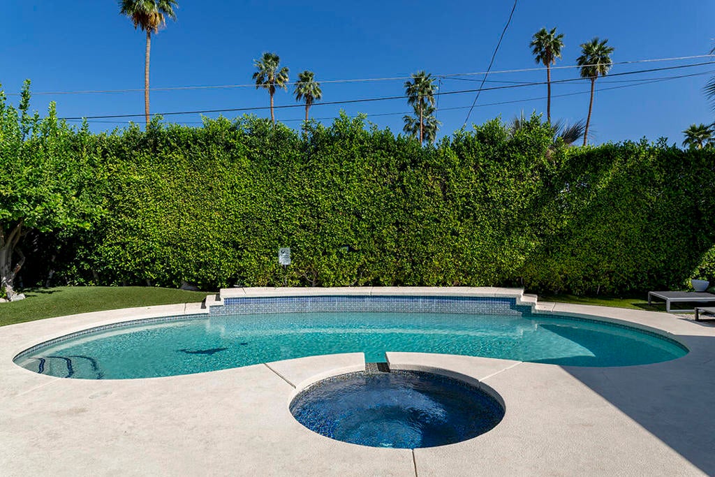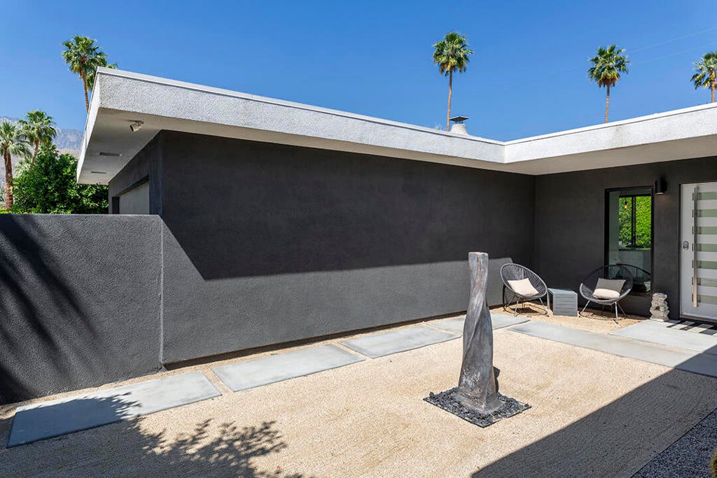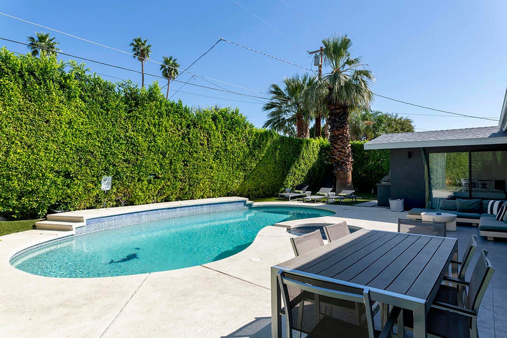 Located just blocks from downtown Palm Springs in Movie Colony East, this 3-bedroom, 3-bath modern California ranch home was taken down to the studs and beautifully remodeled in 2018 by Thomas Troy Home. Thoughtfully redesigned for today's lifestyle, the home features designer finishes, updated windows, and an open floor plan centered around seamless indoor-outdoor living. A standout feature is the spacious owner's retreat, complete with a spa-inspired bath and dramatic corner walls of glass framing the mountain views.The heart of the home is the expansive great room, where the kitchen, dining area, and living room flow together around a generous dine-in prep island. Updated windows and sliding glass doors fill the space with light and open directly to the resort-style backyard, where lush hedging, generous hardscape, artificial turf, and a sparkling pool and spa create the perfect Palm Springs setting for relaxing or entertaining.The primary suite opens directly to the front private courtyard and features a beautifully finished spa-like bath with floating vanities and refined contemporary finishes. A rear guest suite enjoys its own stylish bath and direct access to the pool area, while the third bedroom is privately positioned near the guest bath.Beyond its design and amenities, the home offers an exceptional sense of privacy. Once you enter through the front courtyard gate to the beautifully landscaped front courtyard centered around an art-deco fountain, you can completely escape the world beyond. Additional highlights include owned solar installed in 2022, a two-car garage, newer HVAC, fire pit and outdoor grilling station, as well as a strong rental potential with Movie Colony East's junior permit allowing up to six short-term rentals per year. Main HVAC installed 2021 and new mini split system installed in 2024 Dining room bar area has wine refrigerator Fire pit in side yard Back wall of pool has spill over fountain Built-in BBQ/grilling station Furniture available outside of escrow per inventory