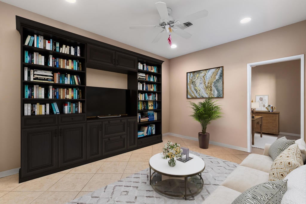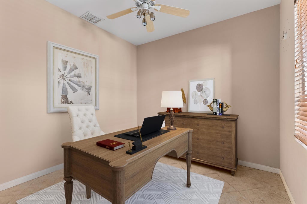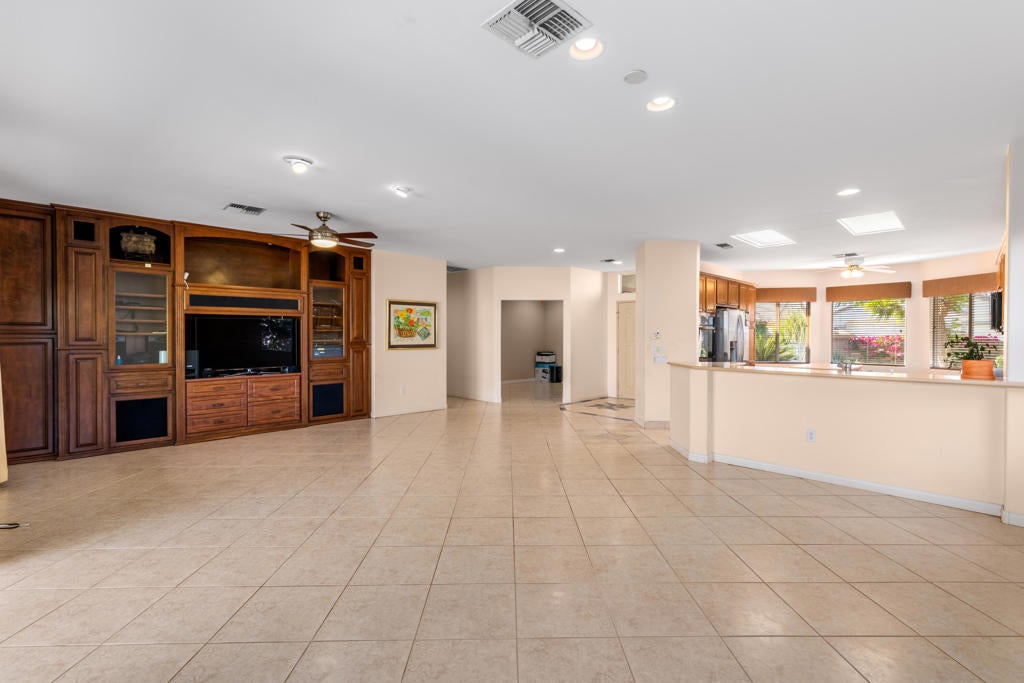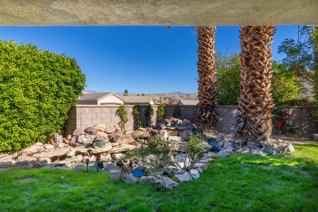 Welcome to this beautifully situated north-facing 2408 sq ft St. Croix + Saltillo-tiled Casita w/ large entertaining patio inside the courtyard. This 3bedroom, 3 bath home has a spacious eat-in kitchen with stainless steel appliances. Other features include built-in shelving in the living room and den, plus an office or hobby room. Also, there are 2 walk in closets in the primary bedroom. Large golf cart garage + storage. Backyard has inviting water feature and mountain views . This park-like lot is over 9,000 sq ft and is total desert serene living!