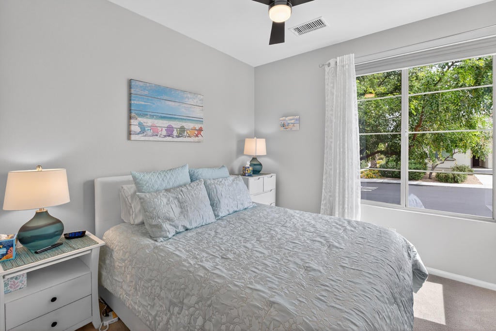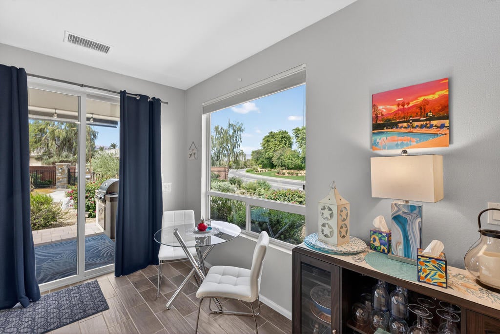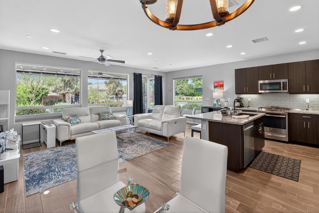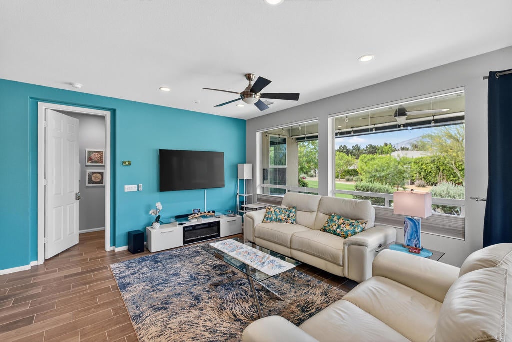 Located in Trilogy at the Polo Club, this clean, bright and thoughtfully upgraded Aria plan offers an efficient 2-bedroom, 2-bath layout with smart use of space, just a short walk from the state-of-the-art clubhouse. The open living area flows into a spacious kitchen with a large center island, upgraded cabinetry, GE appliances, and updated fixtures--creating a comfortable setting for both everyday living and entertaining.Recent upgrades include a newly installed HVAC system paired with a whole-home surge protector, enhancing both efficiency and protection for the home's electrical systems and major appliances. West-facing exposure fills the home with natural light while capturing beautiful Santa Rosa Mountain views.Step outside to a covered paver patio with a built-in BBQ and ceiling fan--an ideal space to relax and enjoy desert sunsets. An added benefit is that the HOA maintains both the front and backyard landscaping, allowing for a low-maintenance lifestyle and more time to enjoy the home and community.Additional highlights include an insulated, air-conditioned garage with epoxy floors and custom cabinetry. The nearby clubhouse offers an exceptional lineup of amenities, including tennis and pickleball courts, a fitness center, resort and lap pools, a restaurant and bar (June Hills Table), meeting rooms, artisan studios, bocce ball, billiards, poker tables, a putting green, and more.The current owner holds an active club membership, which may be transferred--presenting a valuable opportunity compared to purchasing a new membership.