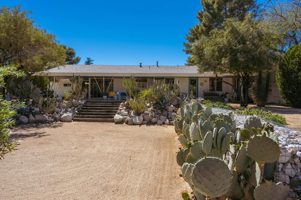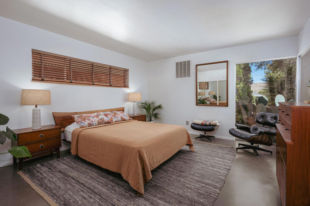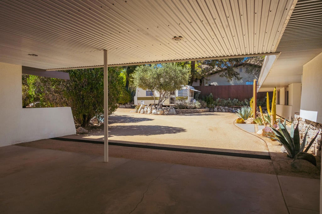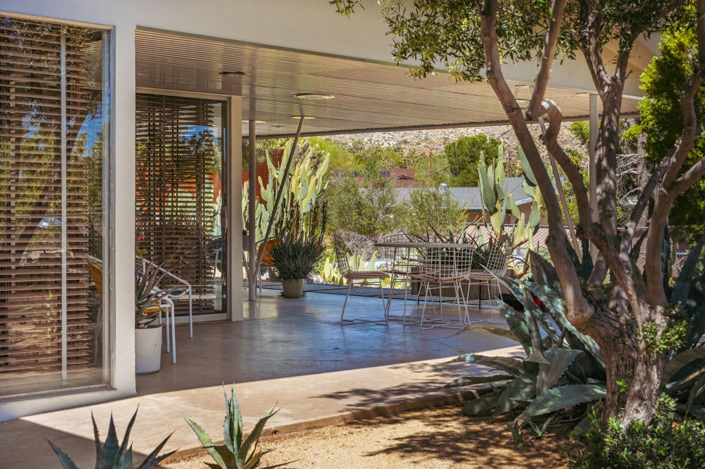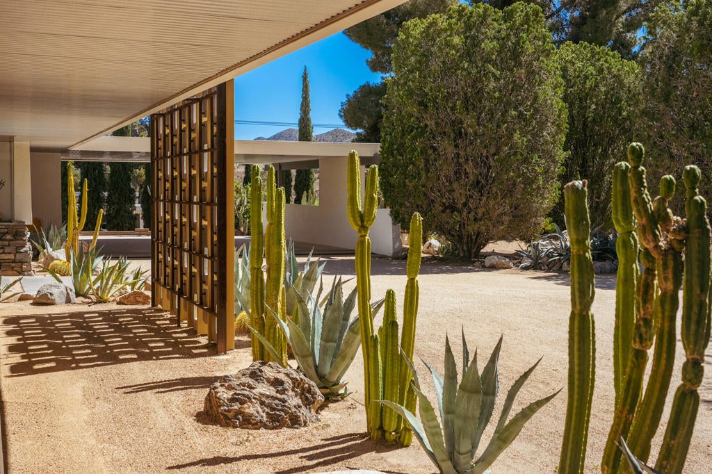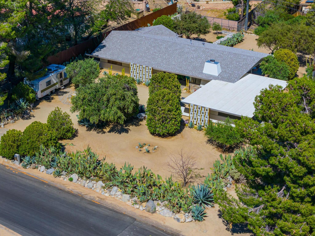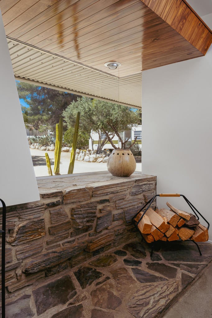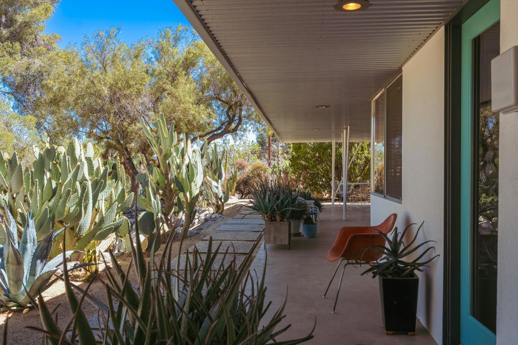 Set within Yucca Valley's coveted Country Club enclave, this 1961 ranch is a private, design-led retreat, meticulously restored over 22 years by a master craftsman. The quality of execution is exceptional, with custom kitchen cabinetry, polished concrete floors throughout, multiple pocket doors, and a striking stone fireplace that brings warmth and sculptural presence to the living space.The home feels intentional, refined, and deeply livable throughout. An oversized patio with a 5+ foot metal-clad overhang extends the living experience outward, creating an effortless connection to the surrounding desert. Thoughtful improvements continue throughout, including an office, dedicated laundry with Etchwood cabinetry, a pegboard buffet in the breakfast area, beautifully finished baths, and curated landscaping designed for privacy, beauty, and calm.Originally the fourth home built in the neighborhood by noted high desert architect Arthur Edward Gerpheide, the property carries meaningful architectural provenance. Outside, two custom hand-poured concrete replicas of the original wood screens add another layer of craftsmanship and character, while mature desert plantings deepen the sense of seclusion. Meticulously maintained and exceptionally executed, this is a rare offering where craftsmanship, history, and quiet design integrity come together in a truly special desert setting.