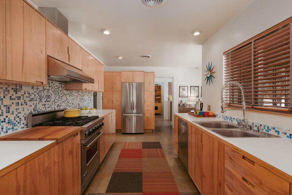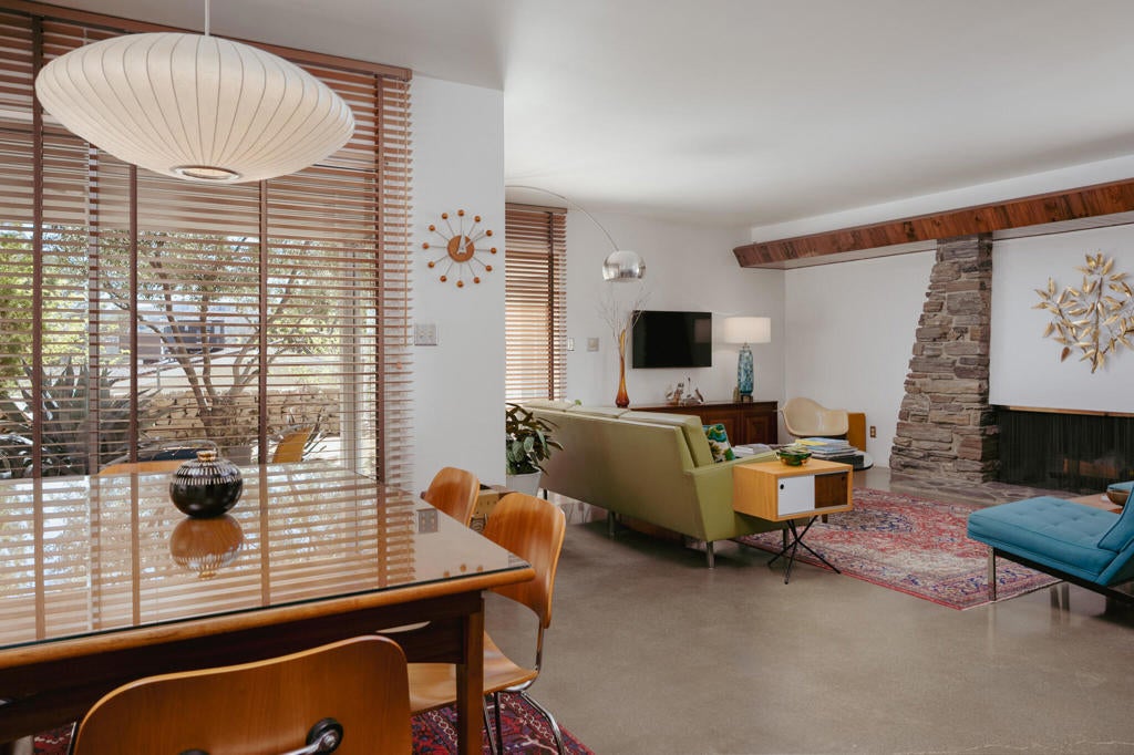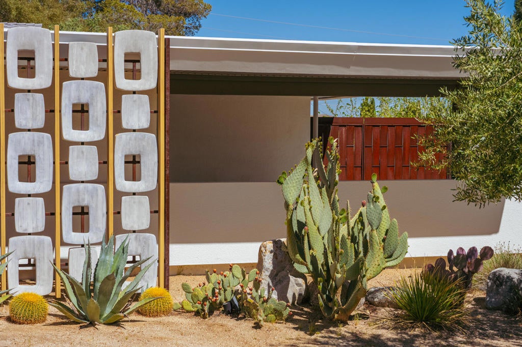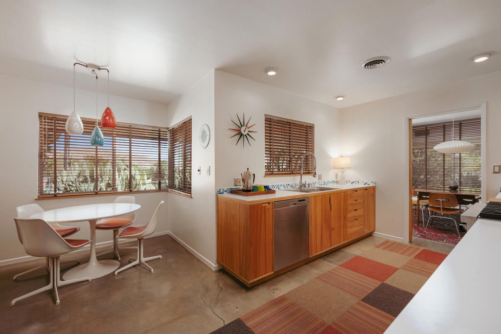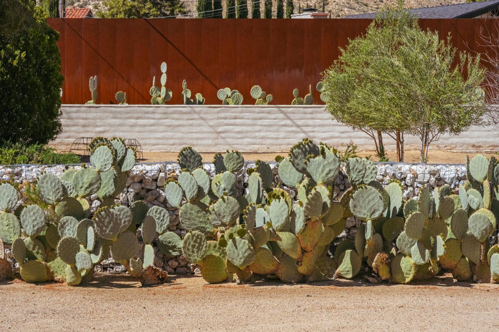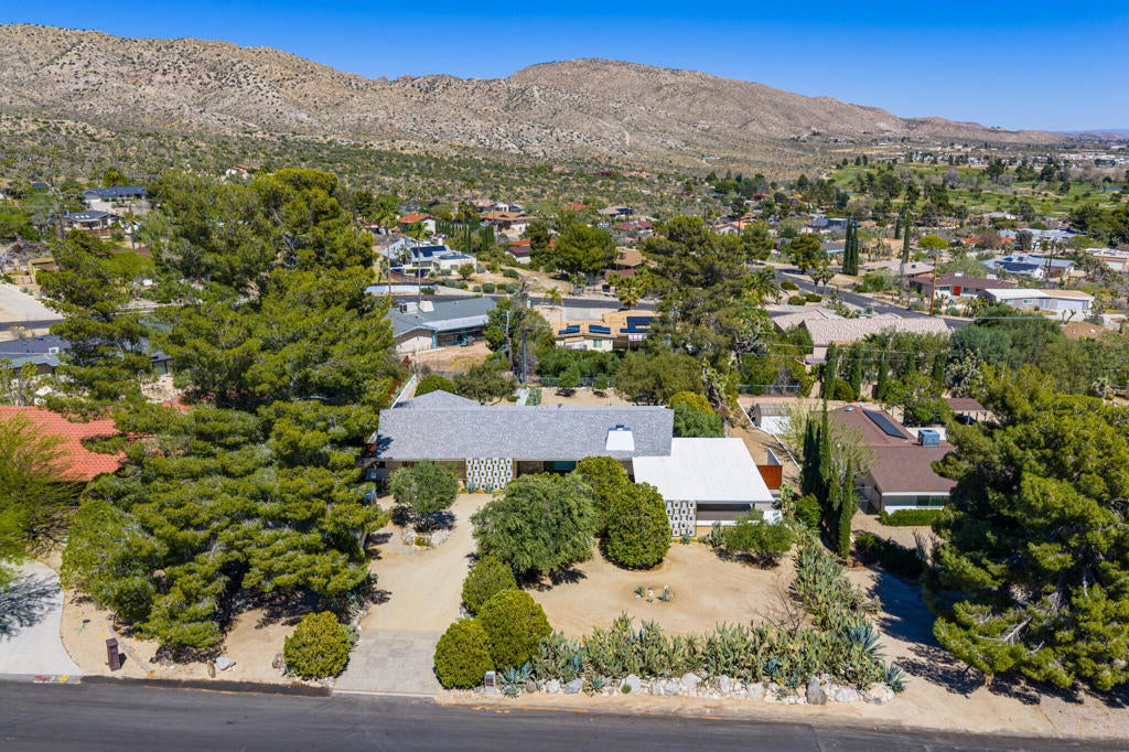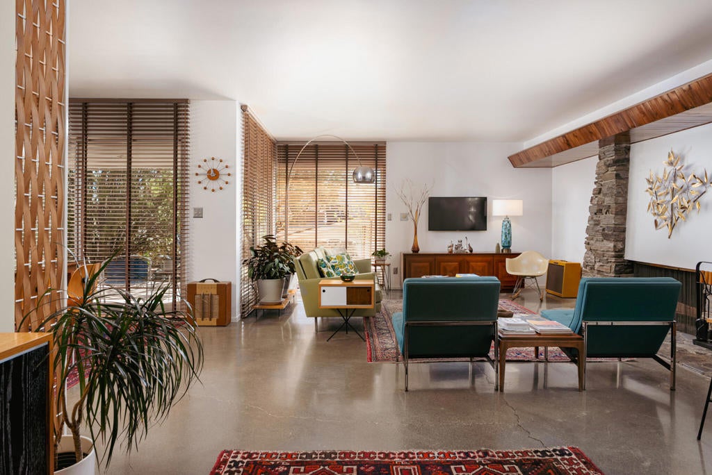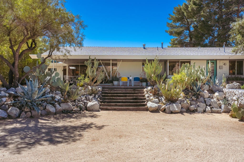 Set within Yucca Valley's coveted Country Club enclave, this 1961 ranch is a private, design-led retreat, meticulously restored over 22 years by a master craftsman. The quality of execution is exceptional, with custom kitchen cabinetry, polished concrete floors throughout, multiple pocket doors, and a striking stone fireplace that brings warmth and sculptural presence to the living space.The home feels intentional, refined, and deeply livable throughout. An oversized patio with a 5+ foot metal-clad overhang extends the living experience outward, creating an effortless connection to the surrounding desert. Thoughtful improvements continue throughout, including an office, dedicated laundry with Etchwood cabinetry, a pegboard buffet in the breakfast area, beautifully finished baths, and curated landscaping designed for privacy, beauty, and calm.Originally the fourth home built in the neighborhood by noted high desert architect Arthur Edward Gerpheide, the property carries meaningful architectural provenance. Outside, two custom hand-poured concrete replicas of the original wood screens add another layer of craftsmanship and character, while mature desert plantings deepen the sense of seclusion. Meticulously maintained and exceptionally executed, this is a rare offering where craftsmanship, history, and quiet design integrity come together in a truly special desert setting.