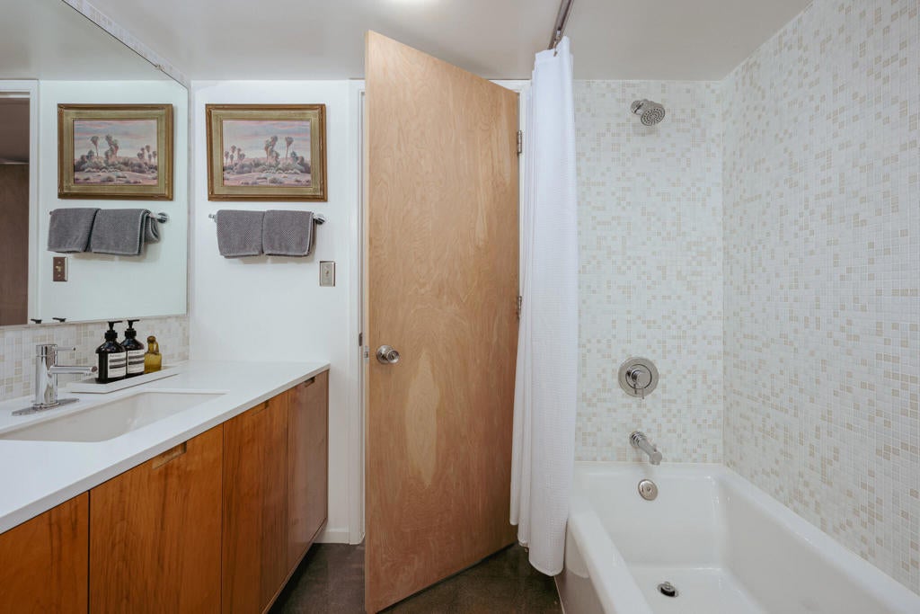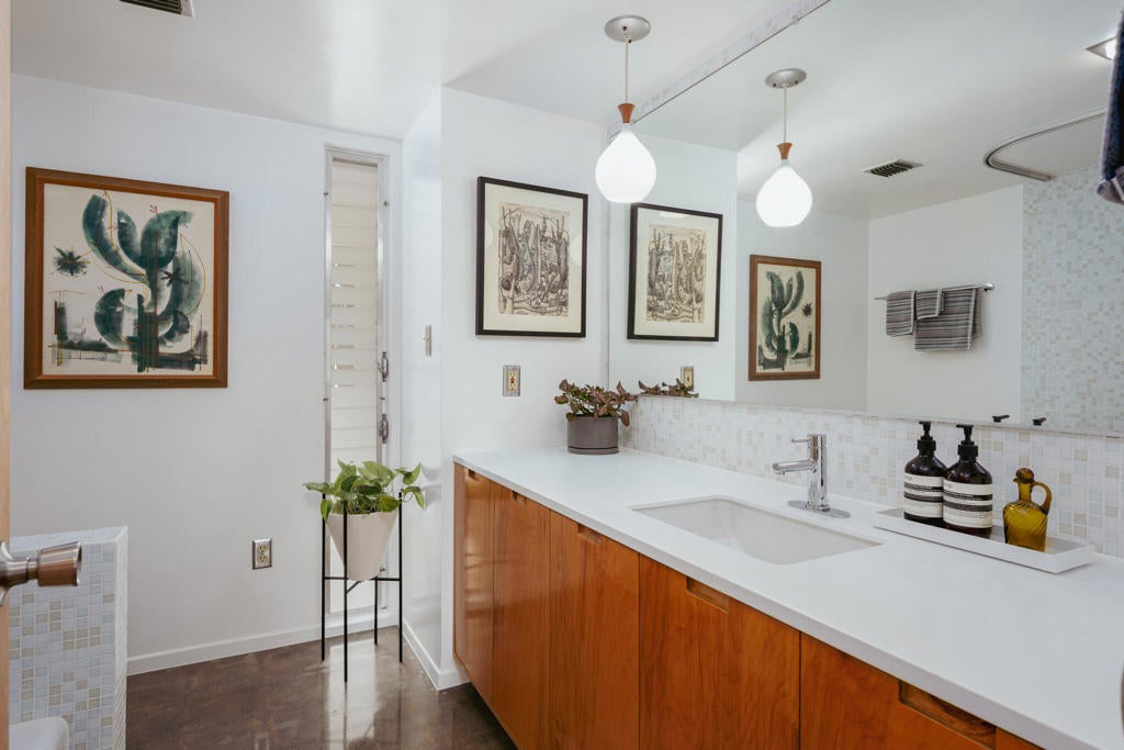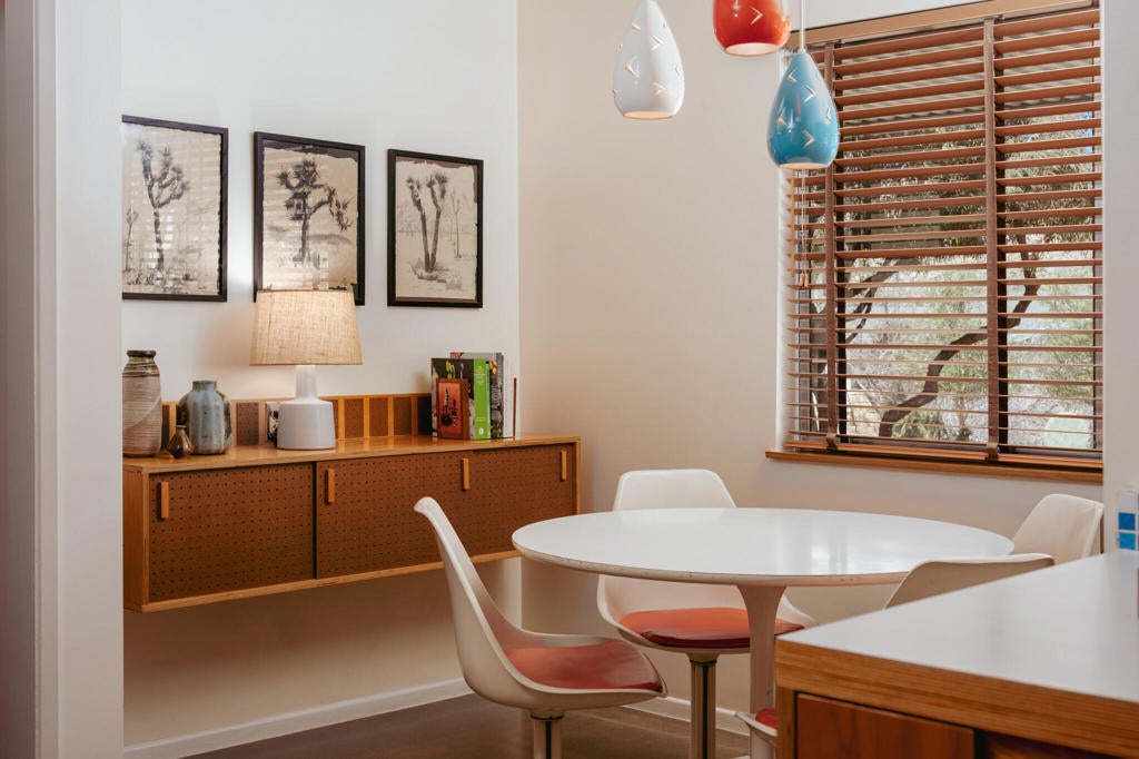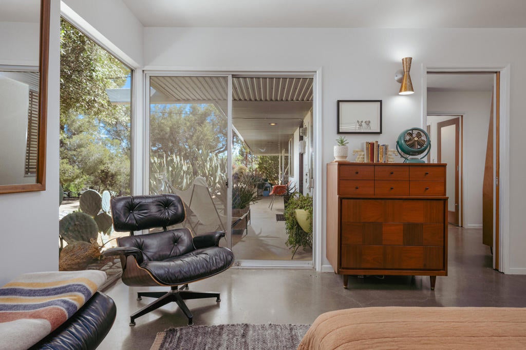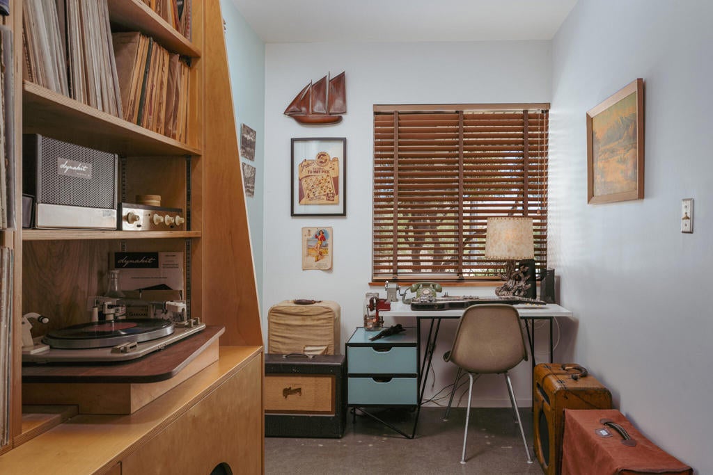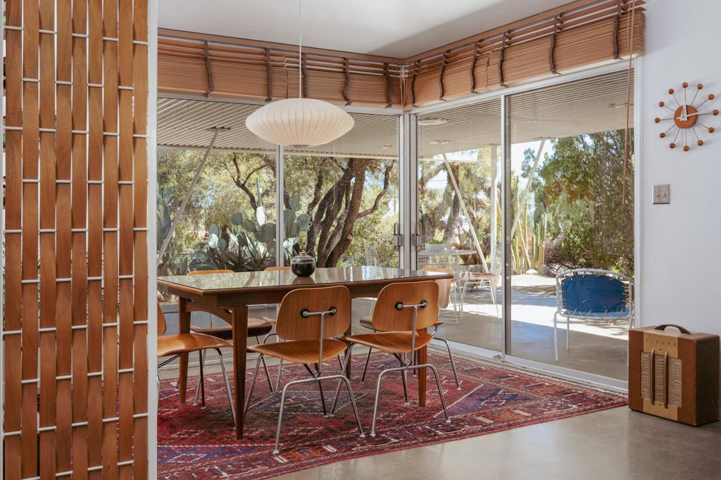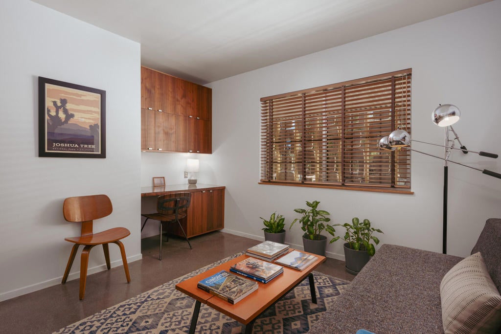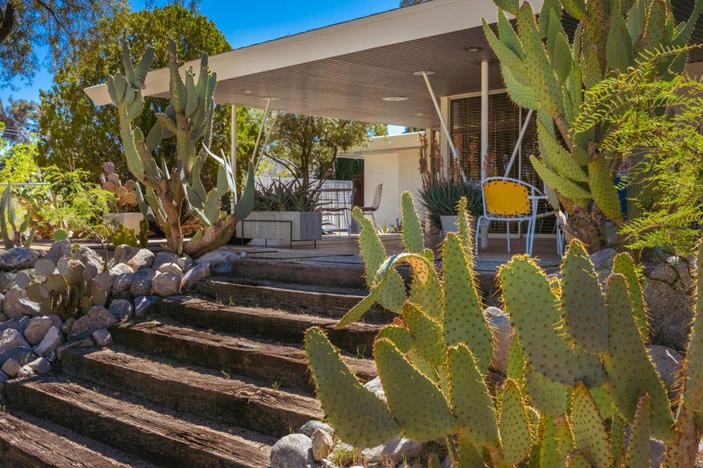 Set within Yucca Valley's coveted Country Club enclave, this 1961 ranch is a private, design-led retreat, meticulously restored over 22 years by a master craftsman. The quality of execution is exceptional, with custom kitchen cabinetry, polished concrete floors throughout, multiple pocket doors, and a striking stone fireplace that brings warmth and sculptural presence to the living space.The home feels intentional, refined, and deeply livable throughout. An oversized patio with a 5+ foot metal-clad overhang extends the living experience outward, creating an effortless connection to the surrounding desert. Thoughtful improvements continue throughout, including an office, dedicated laundry with Etchwood cabinetry, a pegboard buffet in the breakfast area, beautifully finished baths, and curated landscaping designed for privacy, beauty, and calm.Originally the fourth home built in the neighborhood by noted high desert architect Arthur Edward Gerpheide, the property carries meaningful architectural provenance. Outside, two custom hand-poured concrete replicas of the original wood screens add another layer of craftsmanship and character, while mature desert plantings deepen the sense of seclusion. Meticulously maintained and exceptionally executed, this is a rare offering where craftsmanship, history, and quiet design integrity come together in a truly special desert setting.