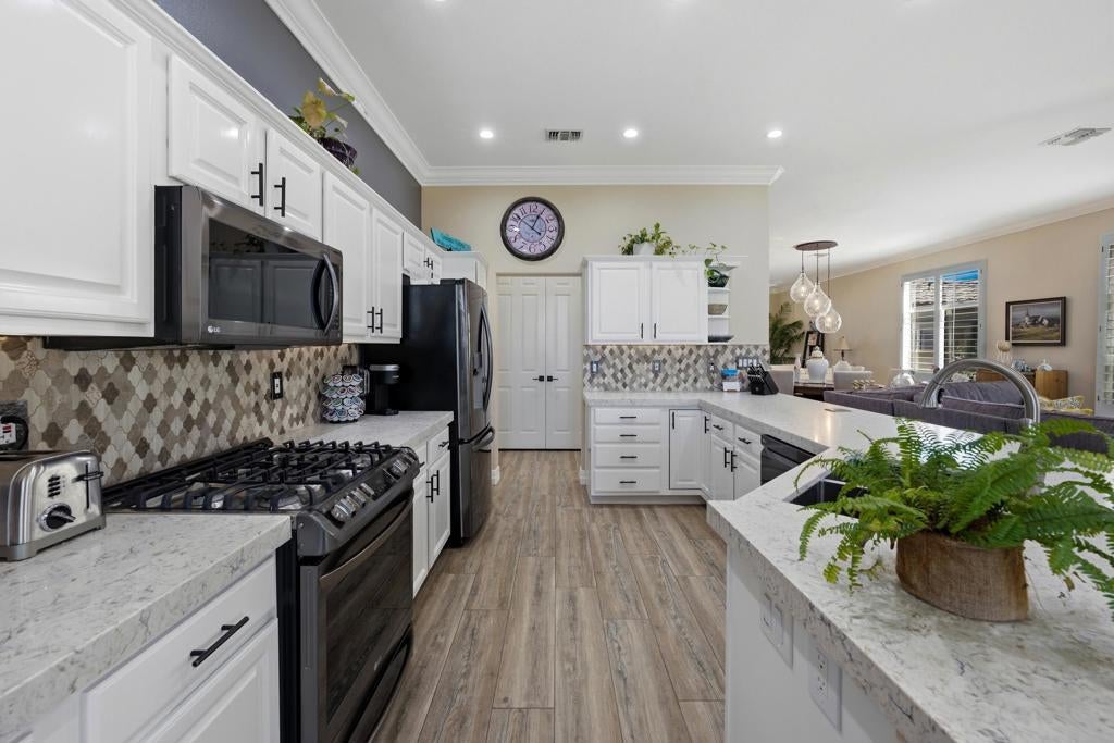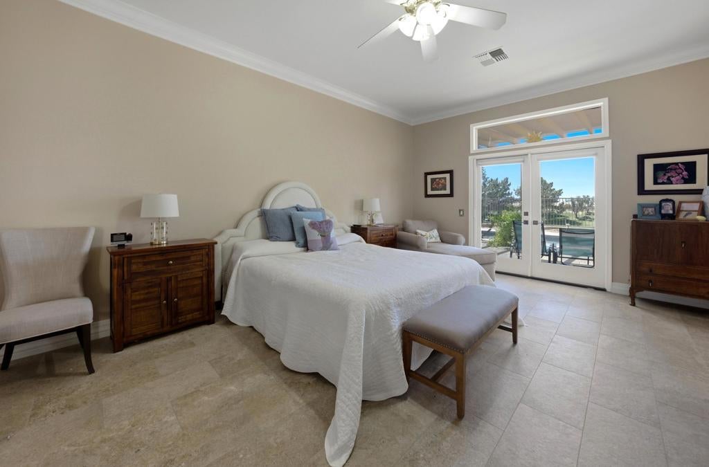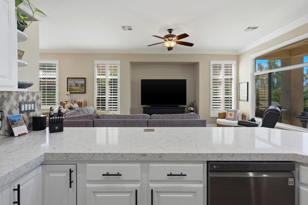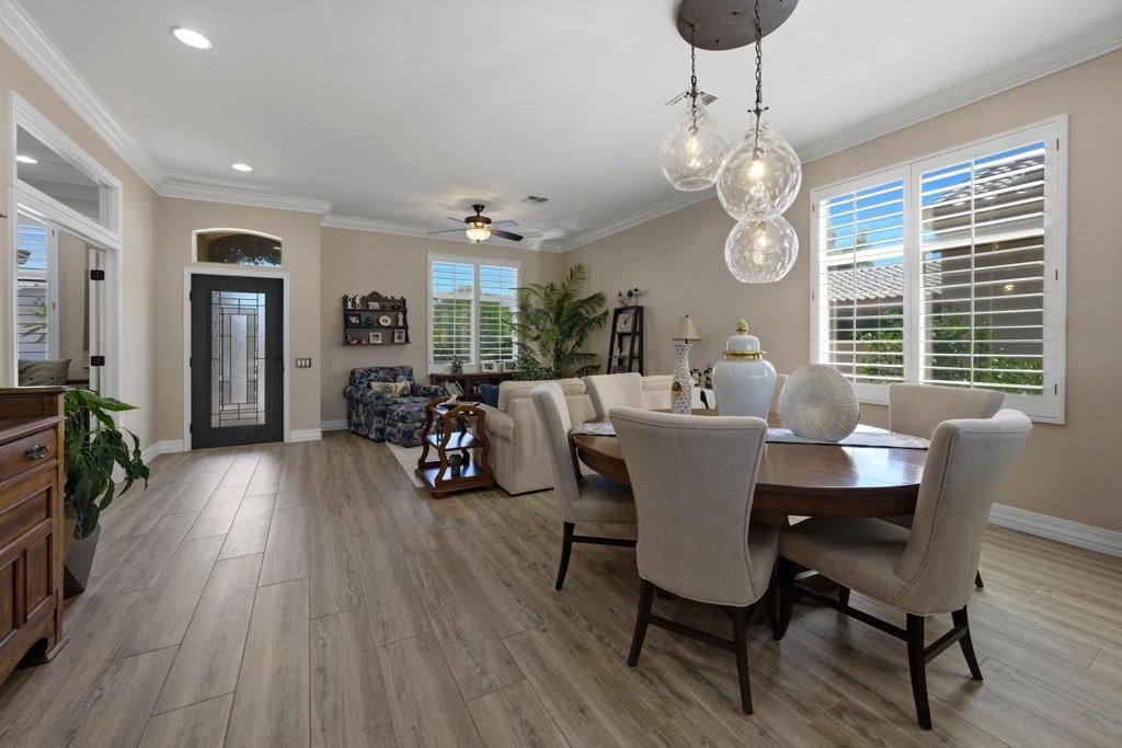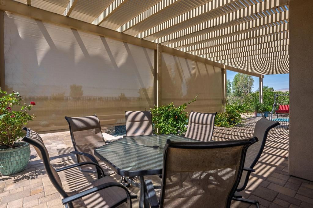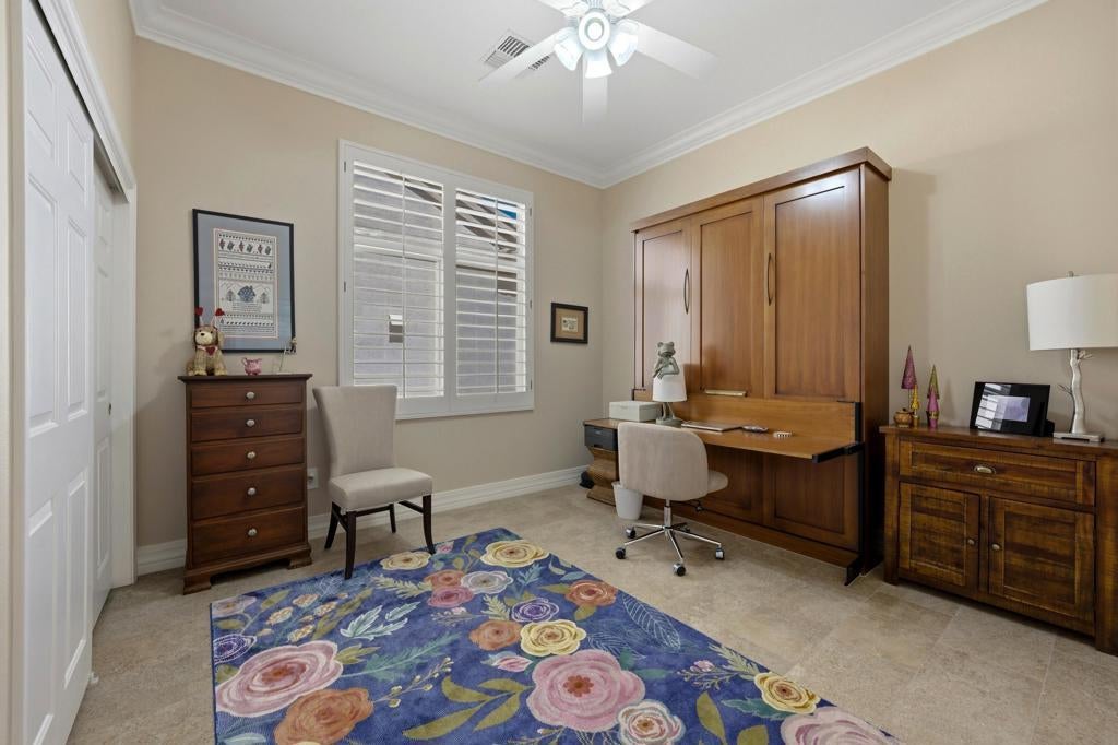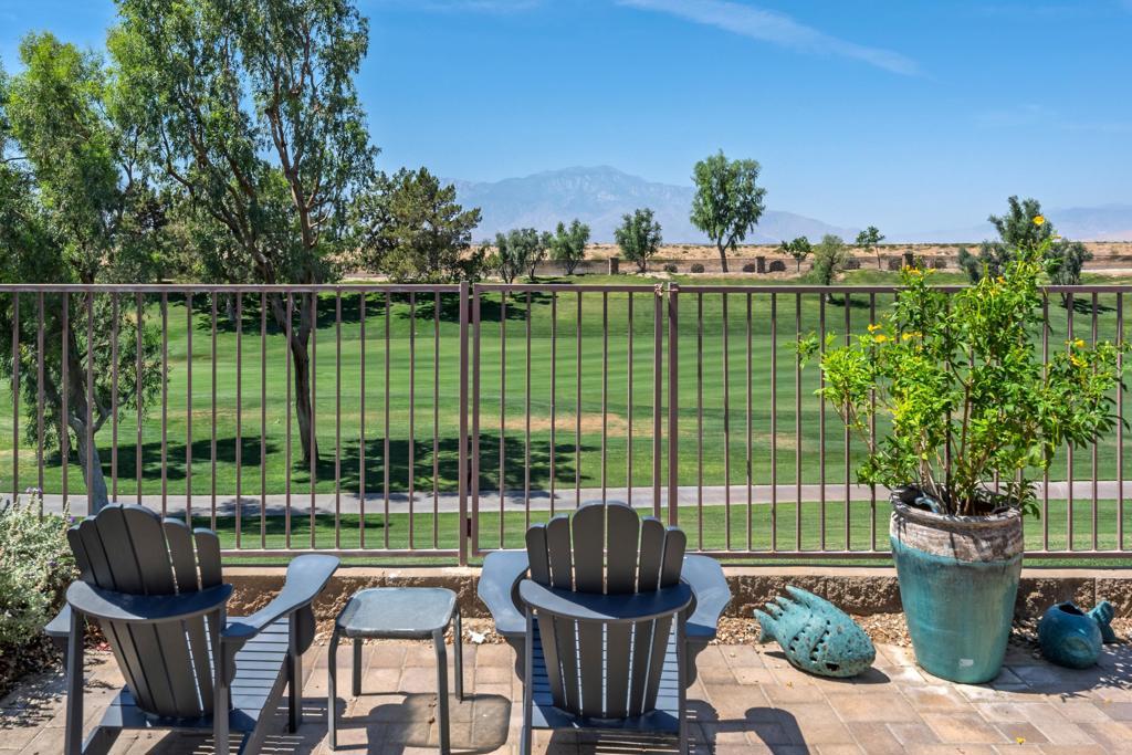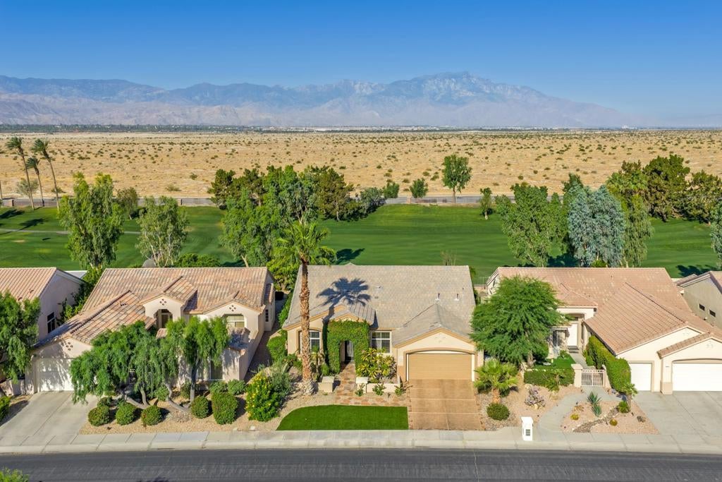 Sun City Palm Desert - Reimagined Casablanca. Perched above the golf course, this extensively upgraded Casablanca offers breathtaking panoramic views of the fairway and surrounding mountains, including the iconic peaks of Mt. San Jacinto, Mt. San Gorgonio, and Mt. Santa Rosa. The spectacular rear yard is designed for resort-style living, featuring a saltwater PebbleTec pool & spa with elegant glass tile accents, an expansive paver patio, alumawood patio cover, and electric solar shades--perfect for relaxing or entertaining while taking in the views. Exceptional curb appeal is highlighted by a leaded glass front door, decorative concrete, updated paint scheme, and lush desert landscaping with artificial turf. Inside, the home has been thoughtfully reimagined to create a bright, open environment. Wood-look tile flooring, 6-inch baseboards, and crown molding run throughout, while 10-foot ceilings, transom windows, and the removal of the wall between the living and family rooms enhance the sense of space and light. Shutters are featured on all but the view windows. The kitchen is both stylish and functional with quartz countertops, soft-close cabinetry with pullout shelves, mosaic tile backsplash, under-cabinet lighting, and stainless steel appliances. Double doors lead to the spacious primary suite, complete with French doors to the patio. The ensuite bath is beautifully upgraded with a custom floor-to-ceiling tiled shower, rimless glass enclosure, upgraded dual-sink vanity with granite counters, and decorative tile flooring. The guest bathroom continues the home's quality finishes, offering an upgraded vanity, granite countertops, custom tiled shower with rimless glass, and updated fixtures. The guest bedroom features a Murphy bed that also functions as a desk, maximizing versatility. A dedicated office with French doors provides additional flexible space. The laundry room offers ample storage, and the two-car garage includes an epoxy floor and a golf cart parking nook. This is a rare opportunity to own a truly reimagined home with exceptional indoor-outdoor living and some of the best views Sun City Palm Desert has to offer.