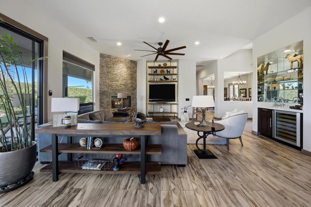 A very rare and exceptional find is now available and located in Montage at Mission Hills, a gated community of 128 homes adjacent to Mission Hills Country Club. This reimagined and updated open- concept home is on a large corner lot over 12,000 sf. This outstanding home is approximately 2,624 sf with 2 guest houses/casitas, each with its own new mini-split AC, full bath, and new water heater. You will find 54 owned solar panels, and two large AC units for the main house that have a high SEER efficiency rating. This home has 4 bedrooms (one currently being used as an office), 4 1/2 bathrooms including a powder room, 3fireplaces (two exterior of the casitas and one in the great room), a wet bar complete with a beverage cooler. The flooring is porcelain wood-look tile that runs throughout the main house. The kitchen is a chef's dream offering a large center island with Murano glass pendant lighting, quartz counter tops, a Thermador 6-burner gas stove with two ovens, an additionalwall oven, microwave oven, and even a warming drawer. There is plenty of space for relaxing or entertaining in the private front courtyard, the back and side yards with decking and turf, the large covered patio, and grilling area with a brand new grille. The awesome, one-of-a-kind pool is wrap-around style with boulders, a raised spa, water feature, and foot bridge. This home comes complete with a new roof too! The HOA Dues are only $360/mo and includes a Membership to adjacent Mission HillsCountry Club in Rancho Mirage, including all amenities except golf. 4BD/4.5BA, 2624 SF, located on Fee land so you own the land. See attached list of Upgrades and Improvements.
