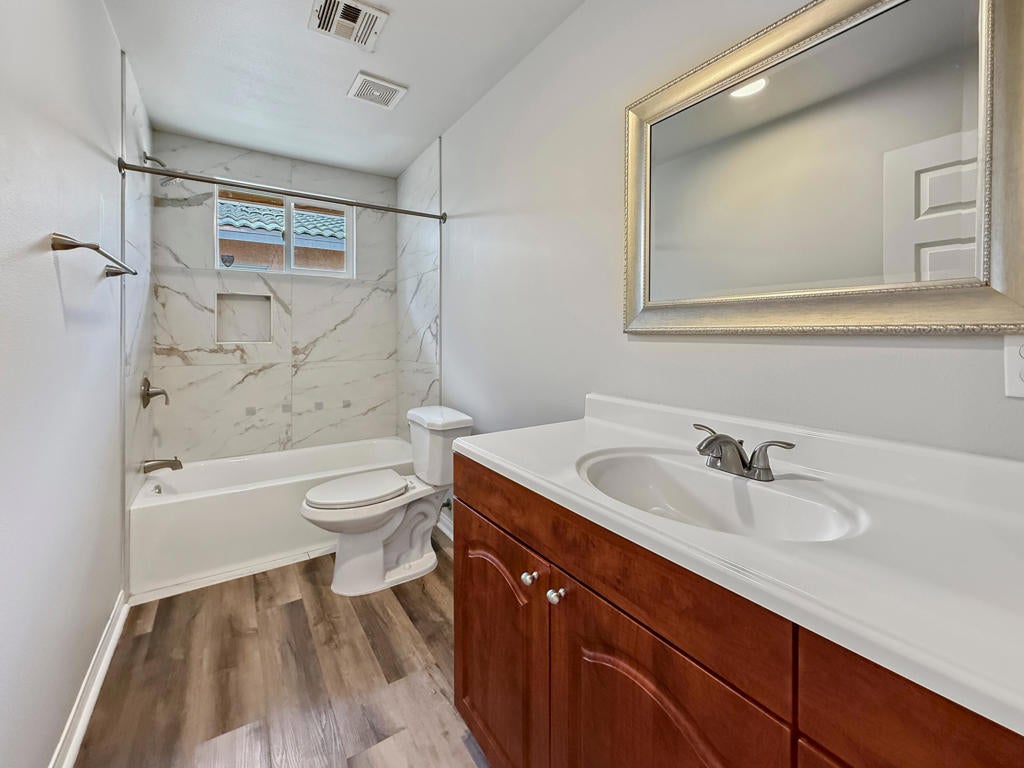 Welcome to this beautifully updated 3-bedroom, 2-bath, 1,262 sq ft home built in 2002 with a bright open-concept layout. The spacious living area flows into a modern kitchen with upgraded flooring throughout. The primary suite is spacious and features an upgraded bathroom. You'll also love the convenient indoor laundry room with its own sink and the one-of-a-kind deep garage nearly 40 feet long -- perfect for storage, workspace, or all your toys.Outside, the backyard features artificial turf, a beautiful gazebo perfect for entertaining, and mature privacy trees for a quiet, secluded backyard. This move-in ready home shows beautifully with a fresh, modern look.This one won't last long. Schedule your showing today! (Scan the QR code on the last photo for the full 3D virtual tour )