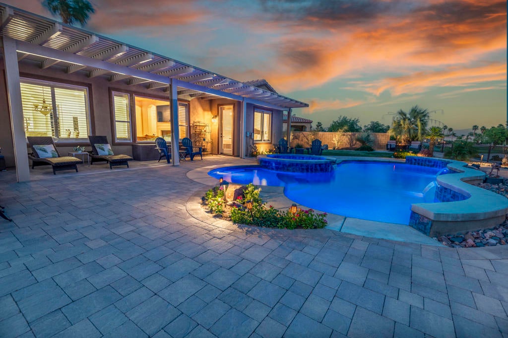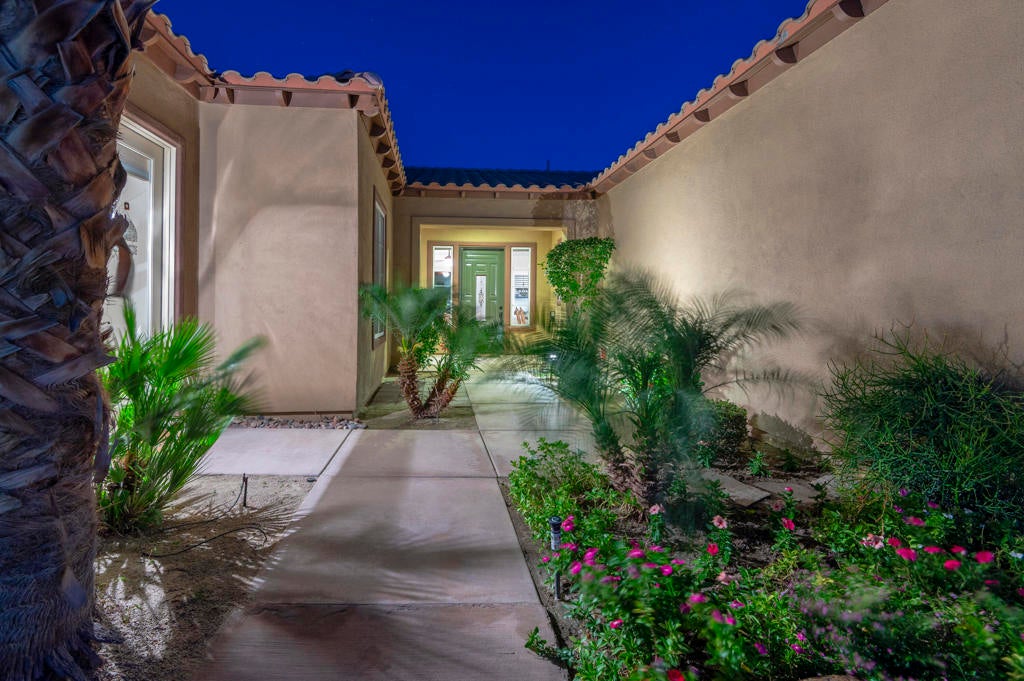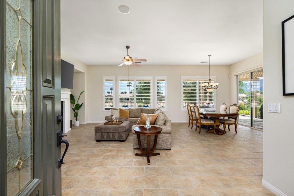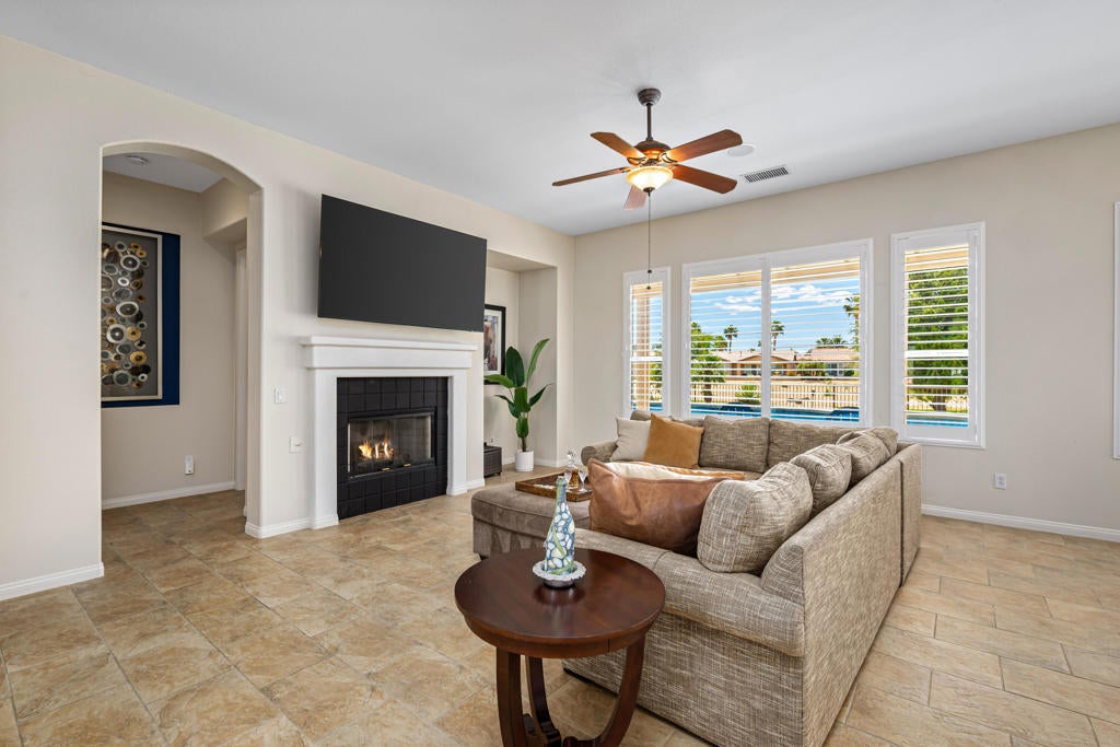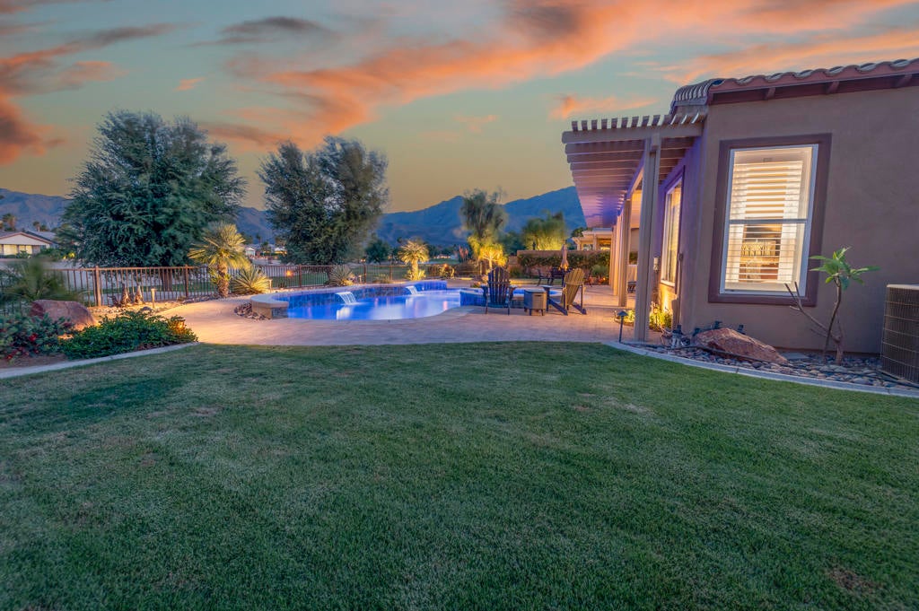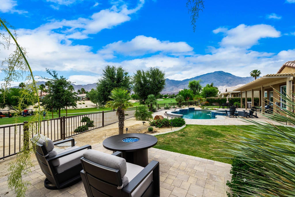 Sunshine, Fairways, Pool, and Mountain Views. Located in the heart of the 55+ Trilogy at La Quinta and Golf Club this exceptional and rare desert retreat makes the most of its sunny and expansive east and southwest golf course and mountain views. A Trilogy Monarch model with a Casita, the home is open and spacious with ten-foot ceilings, exquisite custom stone flooring, a gas log fireplace, surround sound in the ceiling, and large picture windows with shutters that open to breathtaking views. The 2,066 square foot home, with three bedrooms, three full baths and a den, or 4th bedroom, has been lovingly and smartly updated for beauty, comfort, and maximum energy efficiency. A newly installed solar system, Tesla supercharger in the garage, and high efficiency pool equipment reduces energy use and costs. The full kitchen remodel is fresh and clean with new stainless appliances, brand-new white cabinets and crisp new quartz countertops also on the kitchen counter and center Island. The spacious primary bathroom shower has been handsomely tiled from floor to ceiling with a frameless shower door, pure pleasure after a day on the links. The Casita with its own entry is roomy with a kitchenette. The entry of the home is set back off the street and beautifully landscaped. Seamless indoor and outdoor living at its best, once in the front door, the open floorplan and windows captures expansive views from the great room, dining area, kitchen and breakfast nook with built-in cabinets. An additional guest bedroom in the home and nearby den (or 4th sleeping area), has a full bath nearby. Set on a grand 10,890 square foot professionally landscaped lot, the property is raised above the golf course capturing far-reaching views. A very large and exceptionally rare property, the entire back and side yards have been meticulously designed by a professional to create individual spaces around the property from which to enjoy the many and varying natural sites. There is even a garden center from which to grow your favorite flowers, herbs, and vegetables. The covered patio and pergola offer midday shade and custom pavers that meander in beautiful patterns and pathways accompanied by beautiful beds of plants and bold, colorful flowers. The recently built saltwater pool and spa features tanning and seating areas throughout. The pool is perfect for all ages, as it slopes gradually between a few feet up to a depth of seven-feet.