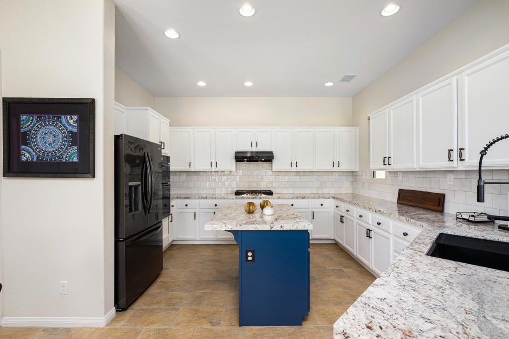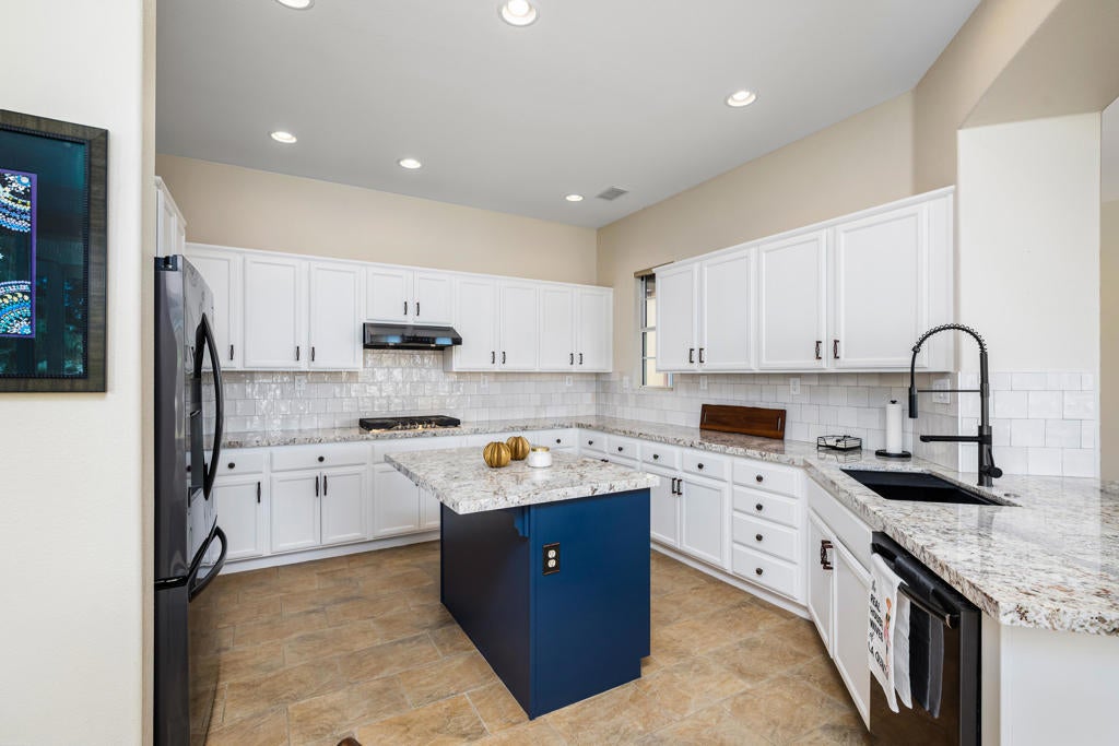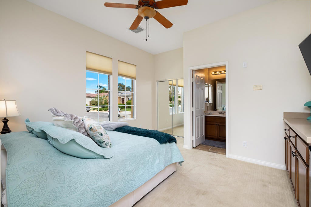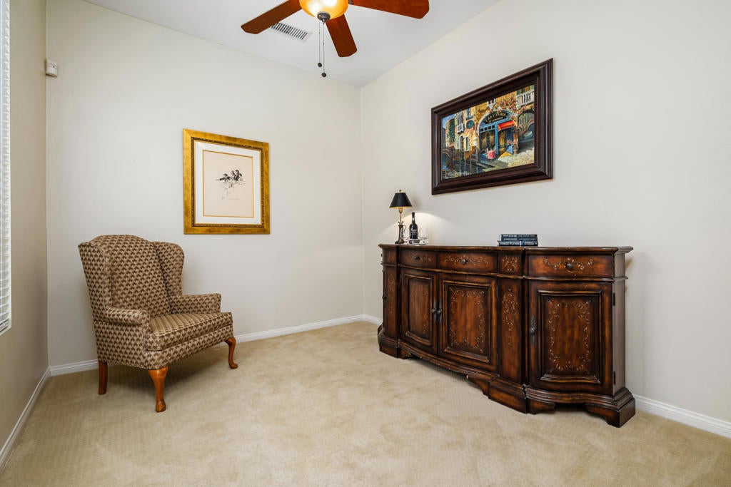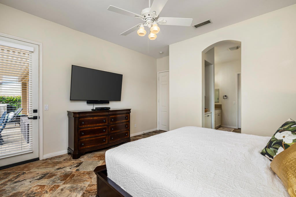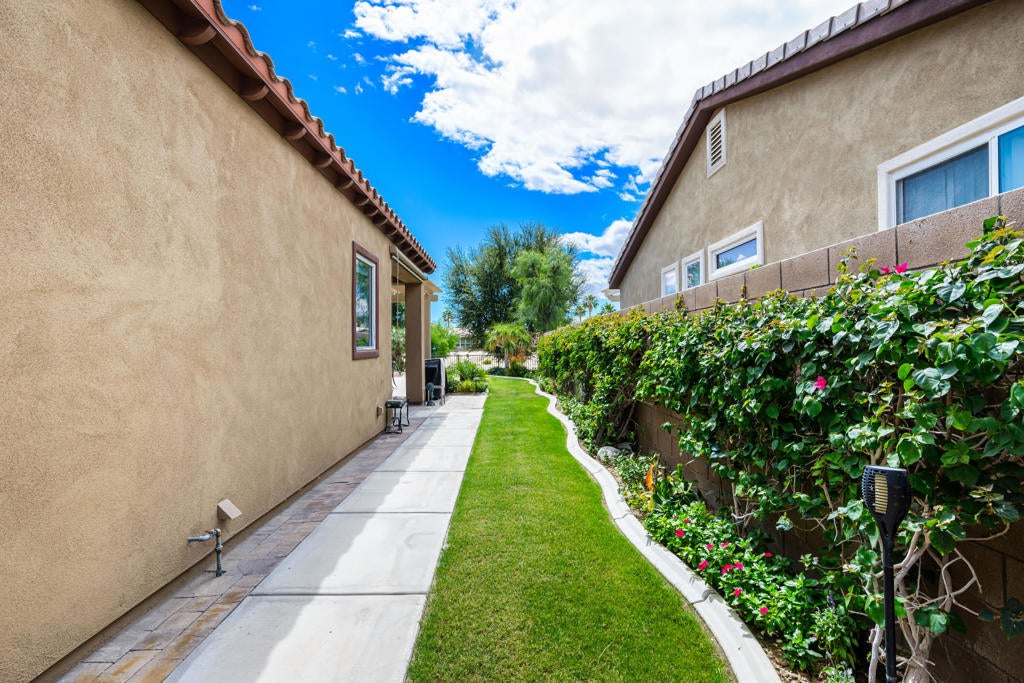 Sunshine, Fairways, Pool, and Mountain Views. Located in the heart of the 55+ Trilogy at La Quinta and Golf Club this exceptional and rare desert retreat makes the most of its sunny and expansive east and southwest golf course and mountain views. A Trilogy Monarch model with a Casita, the home is open and spacious with ten-foot ceilings, exquisite custom stone flooring, a gas log fireplace, surround sound in the ceiling, and large picture windows with shutters that open to breathtaking views. The 2,066 square foot home, with three bedrooms, three full baths and a den, or 4th bedroom, has been lovingly and smartly updated for beauty, comfort, and maximum energy efficiency. A newly installed solar system, Tesla supercharger in the garage, and high efficiency pool equipment reduces energy use and costs. The full kitchen remodel is fresh and clean with new stainless appliances, brand-new white cabinets and crisp new quartz countertops also on the kitchen counter and center Island. The spacious primary bathroom shower has been handsomely tiled from floor to ceiling with a frameless shower door, pure pleasure after a day on the links. The Casita with its own entry is roomy with a kitchenette. The entry of the home is set back off the street and beautifully landscaped. Seamless indoor and outdoor living at its best, once in the front door, the open floorplan and windows captures expansive views from the great room, dining area, kitchen and breakfast nook with built-in cabinets. An additional guest bedroom in the home and nearby den (or 4th sleeping area), has a full bath nearby. Set on a grand 10,890 square foot professionally landscaped lot, the property is raised above the golf course capturing far-reaching views. A very large and exceptionally rare property, the entire back and side yards have been meticulously designed by a professional to create individual spaces around the property from which to enjoy the many and varying natural sites. There is even a garden center from which to grow your favorite flowers, herbs, and vegetables. The covered patio and pergola offer midday shade and custom pavers that meander in beautiful patterns and pathways accompanied by beautiful beds of plants and bold, colorful flowers. The recently built saltwater pool and spa features tanning and seating areas throughout. The pool is perfect for all ages, as it slopes gradually between a few feet up to a depth of seven-feet.