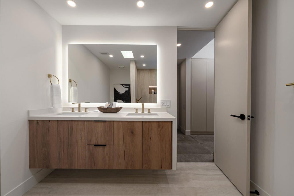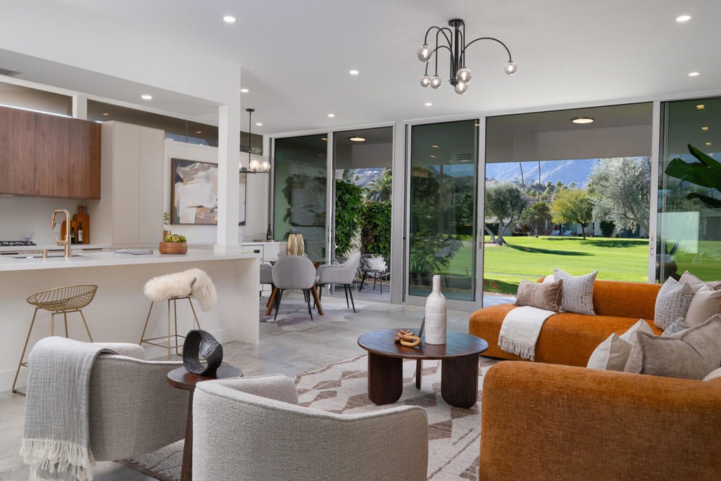 Step inside the shadow blocked walls of this perfectly remodeled, 2bed/2bath, at the coveted Seven Lakes Country Club. Originally designed by Richard A. Harrison, this spacious unit was freshly remodeled in 2025. Large format tiles with a sleek concrete look flow onto your West facing leisure deck, where you'll take in the majestic Mt San Jacinto vistas. Warm wood tones provide a respite from the desert sun, while walls of new dual paned sliders add extra efficiency throughout the home. The chef's kitchen serves California style with it's dual tone wood and cream cabinetry, a gas 5 burner stove and waterfall island. This opens into your airy living and dining space. Both spacious bedrooms, tucked privately to the rear of the home, have great storage in their ample custom closets. The sparkling bathrooms offer walk in rain showers and sleek brass fixtures. A relaxing dinner or quiet moment in your separate walled courtyard completes this perfect picture. The private 1 car garage and a tranquil pool are just steps away. Past the 24-hour guarded gate, 'The Gem of the Desert' offers a unique elevated lifestyle with its Ted Robinson-designed 18-hole executive golf course, 15 pools and spas with pool-houses, and the lively William Cody designed clubhouse waiting to welcome you to its formal dining room, casual cocktail lounge, and a terrace overlooking the waterfall-fountain. Welcome home!
