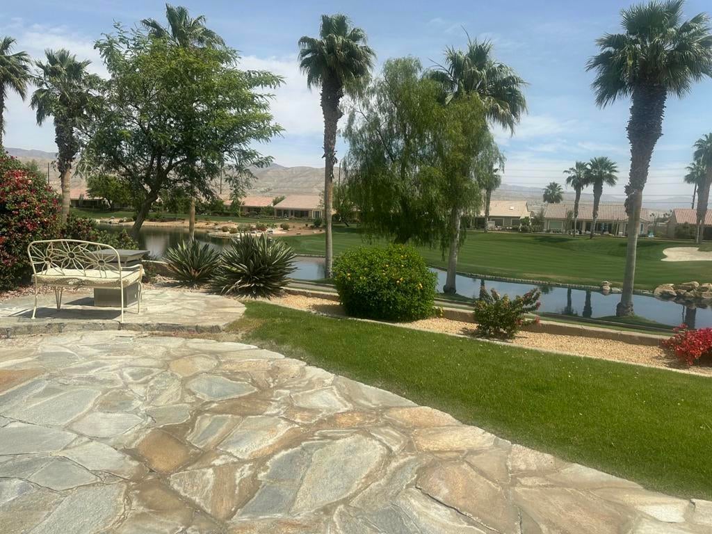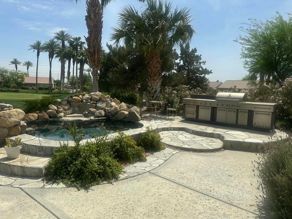 Sun City Palm Desert. OUTSTANDING GREAT ROOM PORTOFINO (2907 square feet)with the MOST INCREDIBLE VIEWS ...This beautiful home is next to the 17th green of the San Gorgonio golf course, on an elevated lot with views of a large lake front , fairway, and putting green with a lovely eastern exposure. To add to this wonderful experience , it offers an inviting in ground salt water pebble tec spa. The 25' long stainless BBQ ISLAND for entertaining is an added bonus to the patio. An automatic awning is also provided so you can sit in the shade to enjoy the spectacular views! This fabulous elevated lot is enhanced with a flagstone trimmed patio! The front entry has great curb appeal with beautiful landscaping, flagstone trimmed concrete, and gorgeous glass enhanced double doors!When entering the great room floor plan, you are greeted with walls of glass showcasing the spectacular views! The beautiful 18' tile flooring laid tastefully on the diagonal, is throughout the entire living space. The great room is very spacious with fireplace and plenty of recessed lighting with additional speakers in the ceiling. The kitchen has been remodeled with new Kenmore Elite stainless steel appliances with a 5 burner gas range, and a stainless steel french door refrigerator The conveniently located island has gorgeous quartz counters with contrasting cabinetry tones, and bead board molding . You will LOVE the all glass corner window at your kitchen sink to enjoy the incredible views. All three bedrooms are 'en suites' suites with an additional powder room for your guests ! The primary bedroom has been extended with french doors leading to the patio, and includes tasteful shutters and built in speakers . The primary bath has been updated with above the counter glass sink bowls and matching spouts on lovely matching spouts on lovely granite countertops. The primary shower offers a misting system with both music and steam and there is also a relaxing tub with jets to enjoy.The primary's retreat has shutters and a french door to the courtyard. The laundry room offers a beautiful red Kenmore Elite front load washer/dryer. The garage is extended with two car spaces and a golf cart garage with cabinets and. plenty of storage.This home has EVERYTHING on your wishlist and all in the premier award winning 55+ community Sun City Palm Desert.