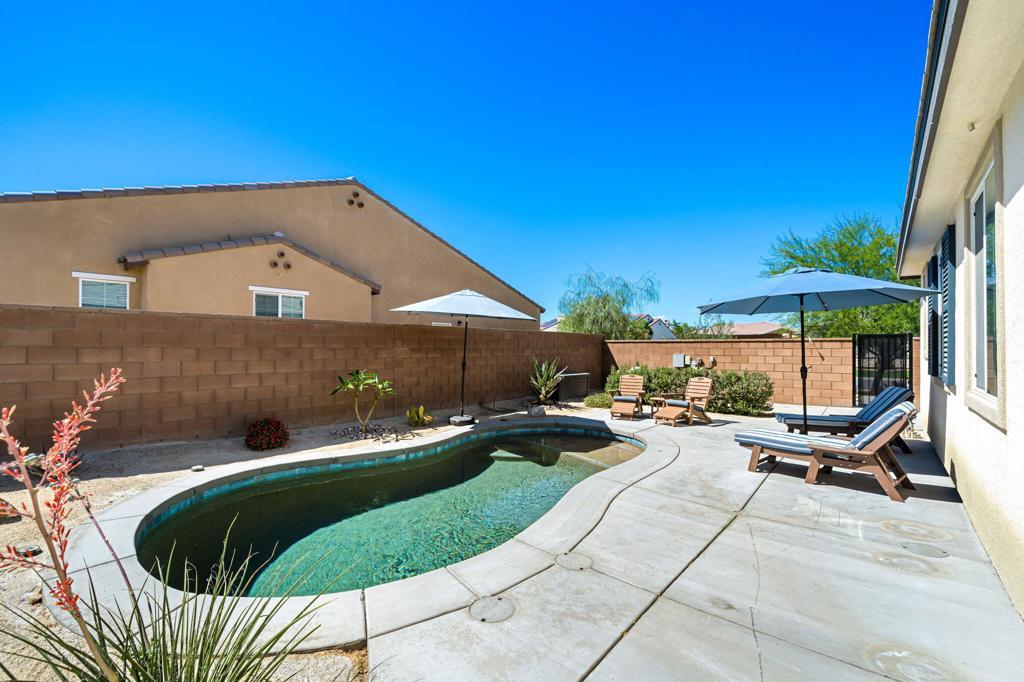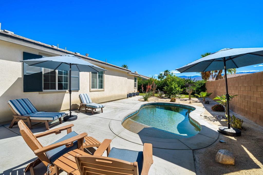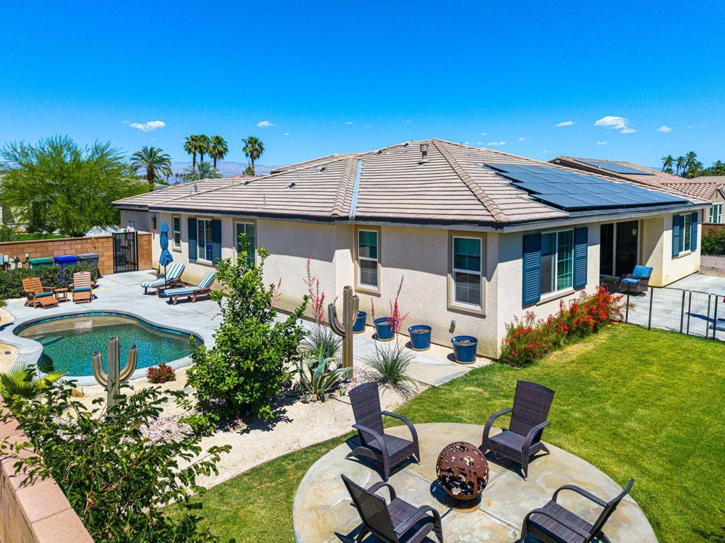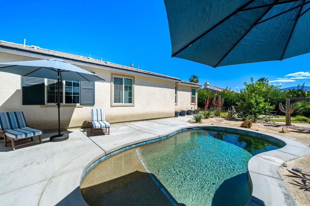 Experience elevated desert living in this beautifully upgraded Pomona plan, where modern ranch design meets a private La Quinta oasis. Situated on over a quarter-acre lot, this home offers exceptional space, privacy, and expansive side yards--perfect for entertaining, recreation, or future enhancements.At the heart of the home is a stunning, modern chef-inspired kitchen featuring an oversized center island, sleek quartz countertops, and a generous walk-in pantry. The open-concept design flows effortlessly into the expansive great room and dining area, creating an ideal setting for both everyday living and upscale entertaining.The primary suite is a true retreat, complete with a spa-like bath and two spacious walk-in closets. Three additional bedrooms, along with a private office, provide flexibility for guests, family, or a home office.Step outside to your own private sanctuary--an entertainer's dream--highlighted by a sparkling custom-shaped pool, a spacious covered patio, and beautifully curated desert landscaping that enhances both serenity and style.Located within a gated community, this home also features a three-car garage with a private side-entry bay, ideal for a golf cart, workshop, or additional storage. Adding even more value is the fully owned and paid-off solar system, delivering energy efficiency and long-term savings.This move-in-ready residence offers the perfect blend of luxury, functionality, and the quintessential La Quinta lifestyle.