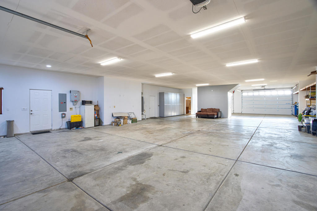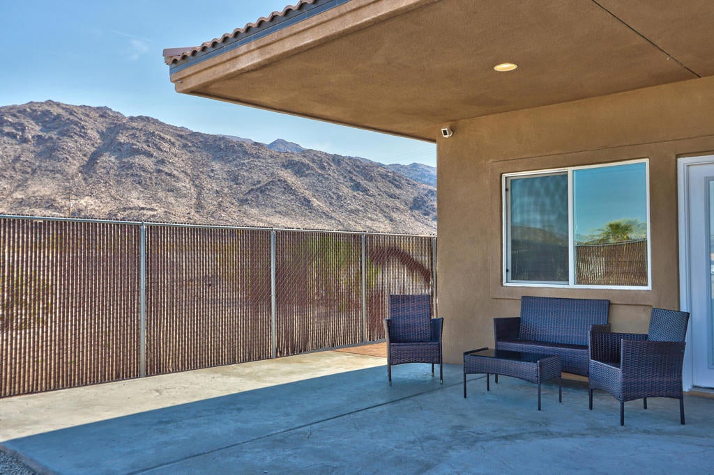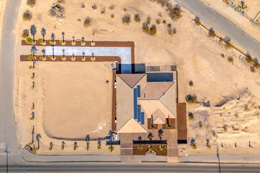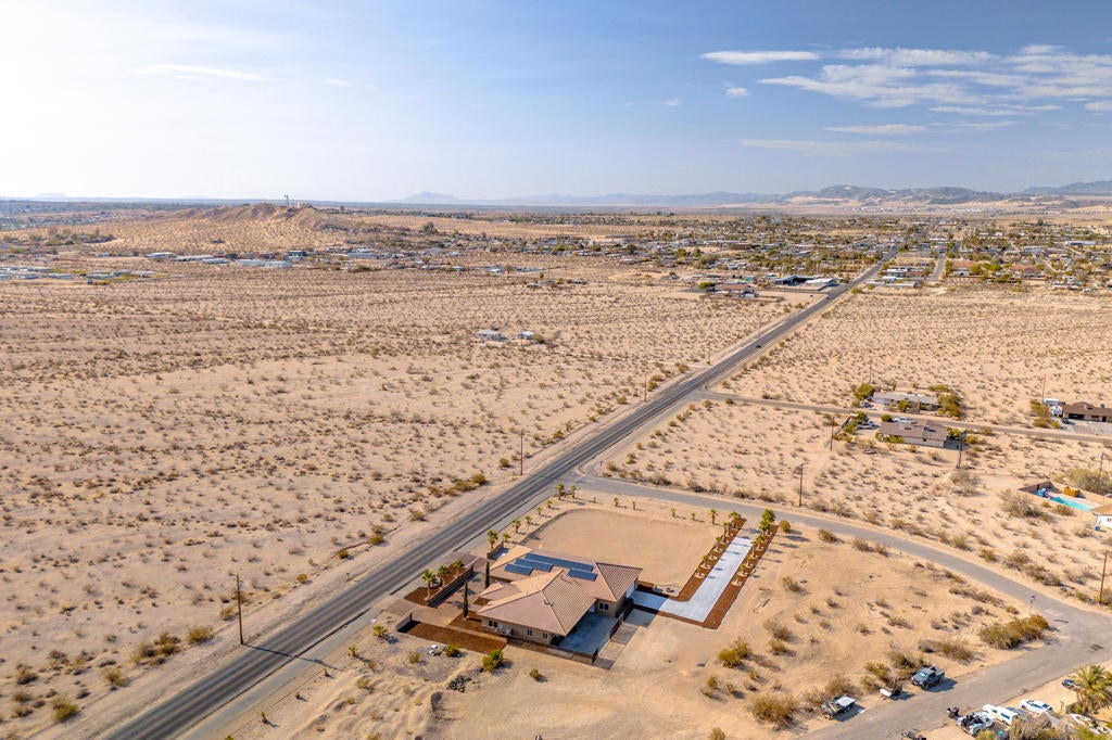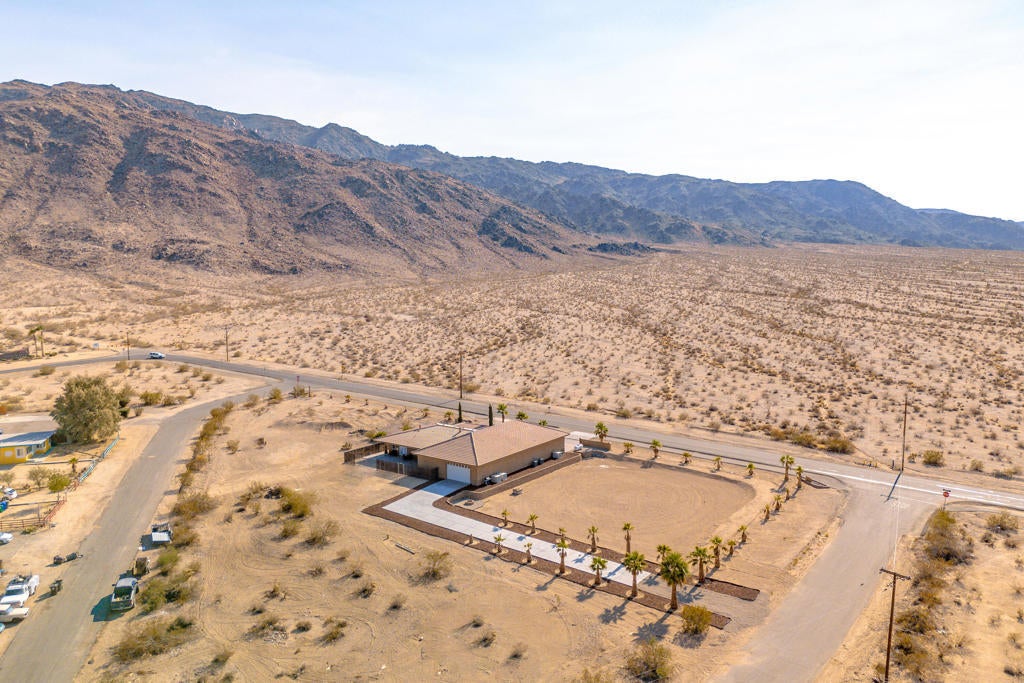 This exceptional 2008 custom-built home sits on a double lot with 245 feet of Adobe Road frontage in Twentynine Palms. Perfectly located less than a 5-minute drive to the Ocotillo Gate of Joshua Tree National Park, just 1 mile (2 minutes) to downtown 29 Palms, and 2 blocks (1 minute to Tortoise Rock Casino). The 2,162 sq/ft residence offers 3 bedrooms and 3 baths, plus a massive 3,200 sq/ft 16+ car drive-through garage and 500 sq/ft theater room above. Total 5,362 sq/ft. The fully finished, freshly painted garage features drywall, insulation, summer climate control, 5 indoor floor drains, multiple 50/30-amp outlets, Ingersoll Rand TS5 air compressor, 224 sq/ft custom storage cabinets, under-stair closet, full travertine bathroom with walk-in shower, and a wired/plumbed area ready for a 270 sq/ft apartment. Three stamped and stained driveways provide ample parking, and the hurricane-rated 16x9 insulated garage doors (front and back) were recently serviced. Inside, enjoy fresh paint throughout, new interior doors, trim, and custom 6'' baseboards. Stained concrete floors grace the common areas, while bedrooms have new carpet and tile. The primary suite includes California Closets his/hers walk-ins, dual-sink vanity, separate makeup vanity with TV, a brand-new heated Jet tub (5/2025), giant 3-head rain shower, and tiled water closet. Slate stone fireplaces warm both the living room and master suite. French doors open to a huge covered back patio pre-wired and drained for an outdoor kitchen. The modern kitchen features stained concrete countertops and island with bar sink and in-counter blender, a new GE Profile gas stovetop and microwave, plus included refrigerator and dishwasher. A custom built-in entertainment center accommodates an 80'' TV. The spacious laundry room includes a sink, concrete countertop, cabinets, and brand-new GE Profile washer/dryer. Secondary bedrooms have new closet organizers behind custom glass doors. Additional highlights include an owned 10kW solar system (avg. 45kW/day, balance through escrow), whole-home generator infrastructure, water filtration plumbing, dual A/C-furnace units, three recently serviced Aerocool evaporative coolers with UP-DUX vents, and a septic system pumped, inspected, and certified on 5/28/25. This is a true custom 2008 build with nearly everything updated. It's not a 1950 remodeled older home and offers plenty of room for expansion. Schedule your showing today.