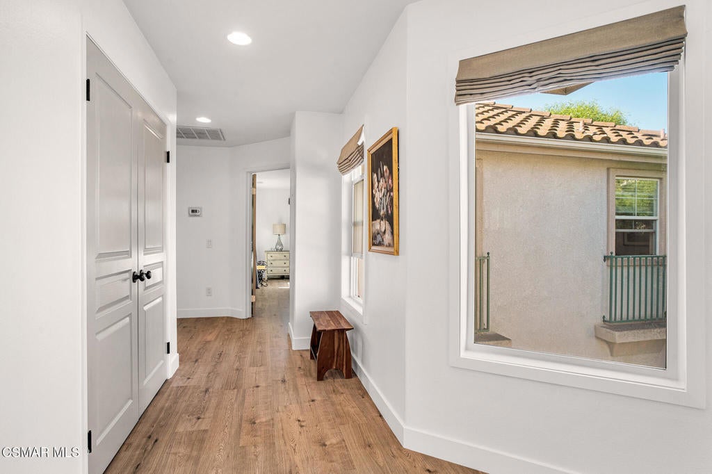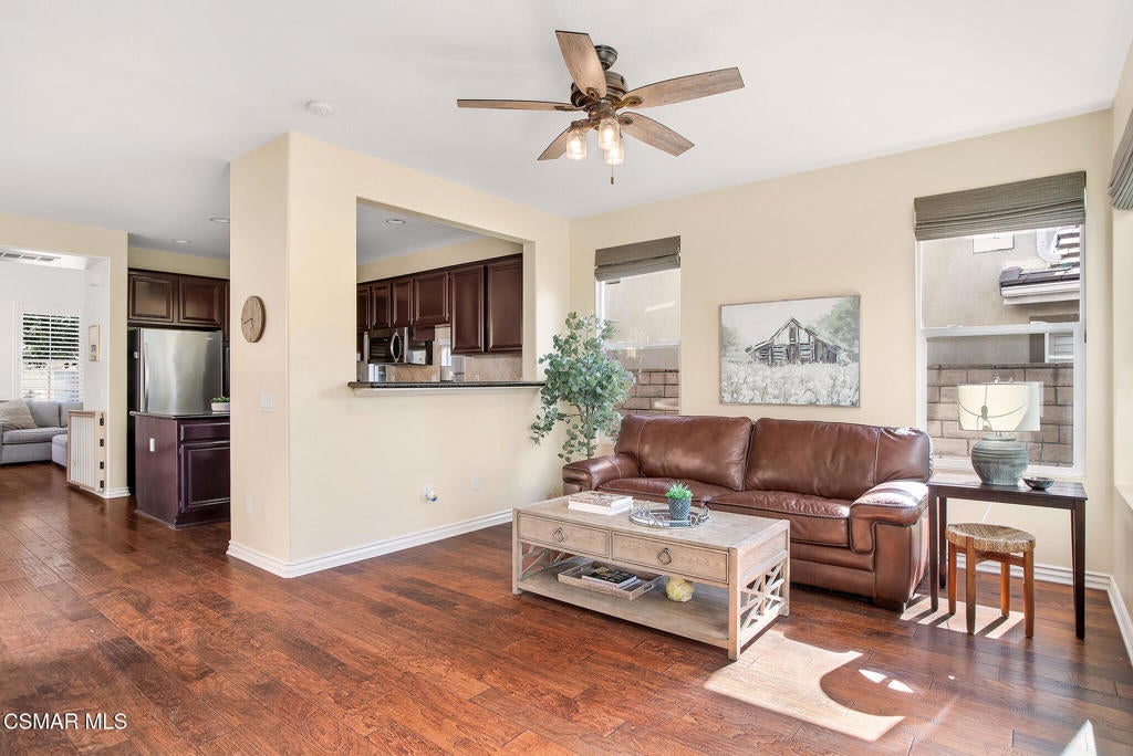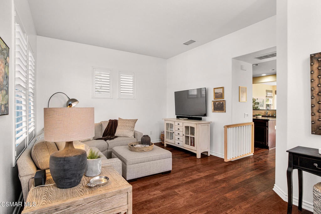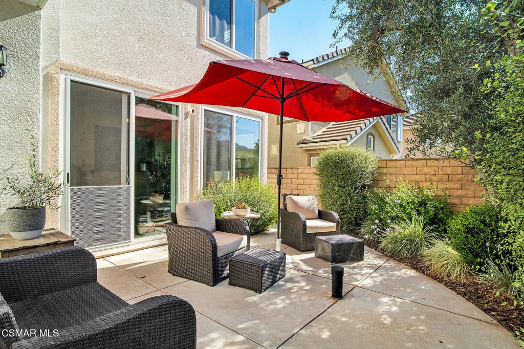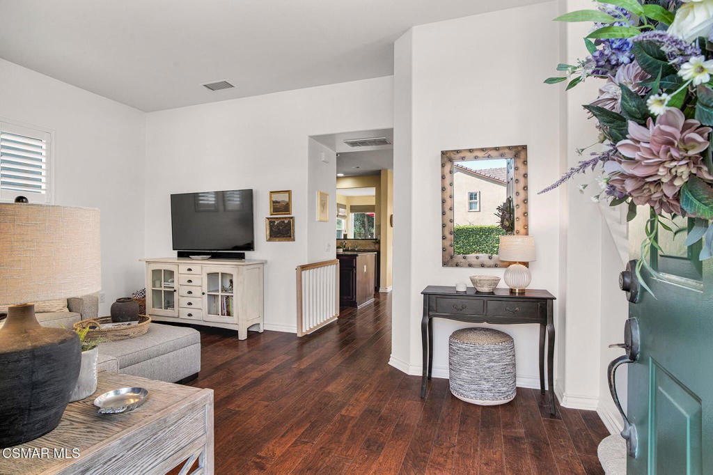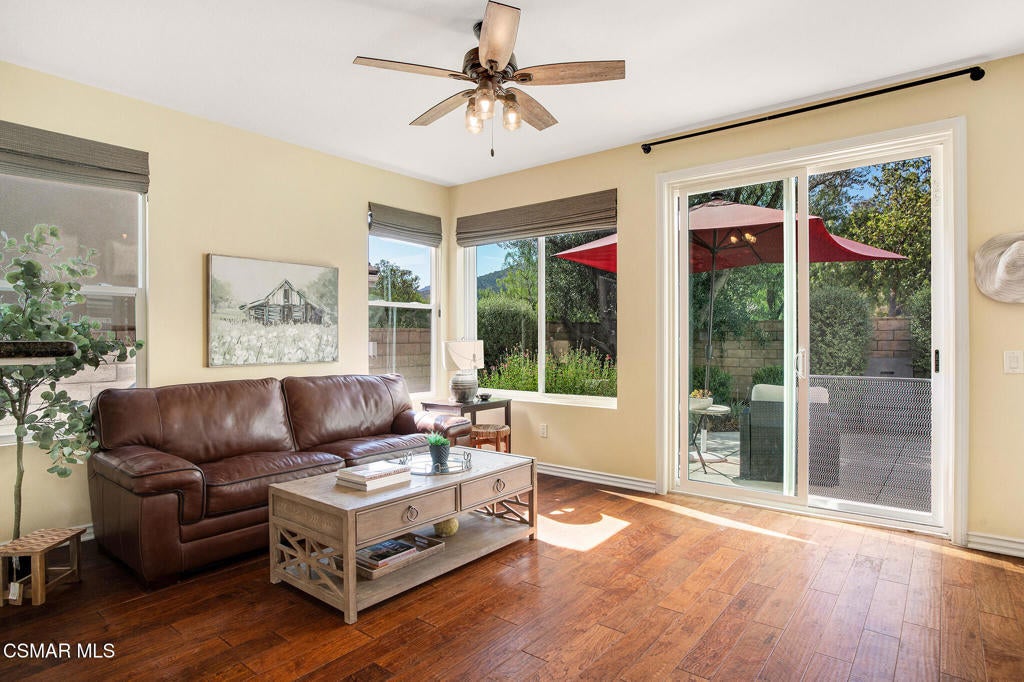 Here's your chance to own a home in the highly sought-after guard-gated Long Canyon Windmill community at Wood Ranch--a neighborhood known for its tree-lined streets, resort-style amenities, and easy access to parks, trails, golf, shopping, and dining. Offering 4 bedrooms, 2.5 baths, and 2,069 sq. ft. of living space on a 3,484 sq. ft. lot, this home combines comfort, style, and convenience in one inviting package. Step inside to a light-filled living room with soaring ceilings and warm wood flooring that set the tone for the open, welcoming layout with a downstairs remodeled powder room. The granite kitchen features dark wood cabinetry, a tumbled travertine backsplash, a center island with storage, stainless steel appliances, and a roomy pantry--perfect for both everyday meals and entertaining. Just off the kitchen is a dining area with three large windows, creating a bright and comfortable space for enjoying meals. The kitchen flows seamlessly into the family room, where a tile fireplace adds a cozy touch, and sliding doors open to a backyard with a concrete patio for outdoor dining and block wall fencing for privacy. Upstairs, wood-like flooring extends through most of the space. The primary suite is a peaceful retreat with hilltop views, a large walk-in closet, and an ensuite bath with a soaking tub, separate shower, and dual-sink vanity. Three additional bedrooms and a full hall bath with dual sinks provide plenty of space for family, guests, or a home office, and the upstairs laundry room adds convenience. The front yard features lush landscaping with terracotta tile accents, and the property includes a direct-access two-car garage. As a Long Canyon resident, you'll enjoy four sparkling pools and spas, three clubhouses, a fitness center, tennis courts, playgrounds, and scenic walking and biking trails--all within a secure, beautifully maintained setting.