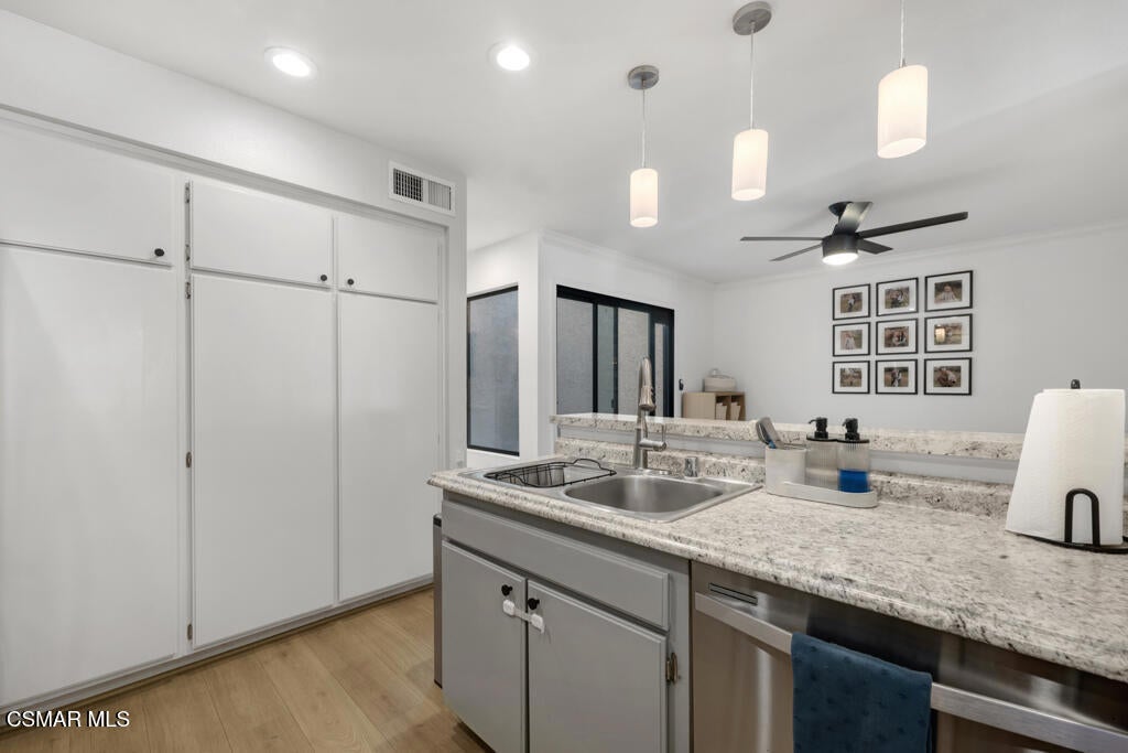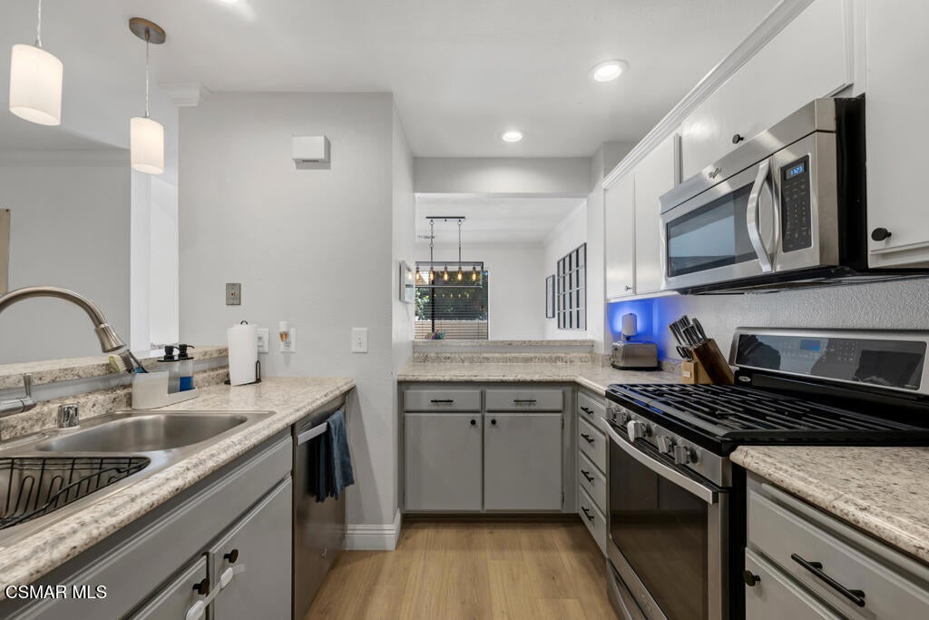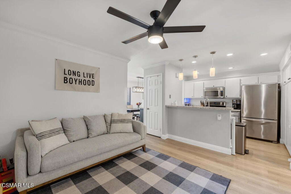 Assumable VA Loan with sub 3% rate available! Welcome Home! This stunning three bedroom two-and-a-half-bathroom gem is the home you have been waiting for! Situated in the tranquil Summer Place neighborhood in Simi Valley, you are first greeted by a private front patio perfect for grilling, entertaining, and spending the evenings relaxing. Through the front door you have a totally remodeled living room with upgraded hardwood flooring, a striking stone fireplace, a beautiful chandelier, vaulted ceilings, crown moldings, and recessed lighting. Next to the living room is a perfectly sized dining room which opens to the nicely upgraded kitchen with granite-like counters, stainless steel appliances, and plenty of storage room for all of your cooking desires. Next to the kitchen is a family room which opens to the center atrium, bringing in wonderful nature light and perfect atmosphere. Upstairs there are three immaculate bedrooms, each with their own ceiling fan and light. The master suite has dual closets and a totally remodeled bathroom with marble tile floors, a beautiful dual sink vanity, new light fixtures and mirrors. Not to be forgotten is the large two car garage perfect for all automobile and storage needs. The modestly priced HOA covers all exterior maintenance as well as upkeep of the community area, and access to multiple community pools/spas. Run don't walk! This one won't last!