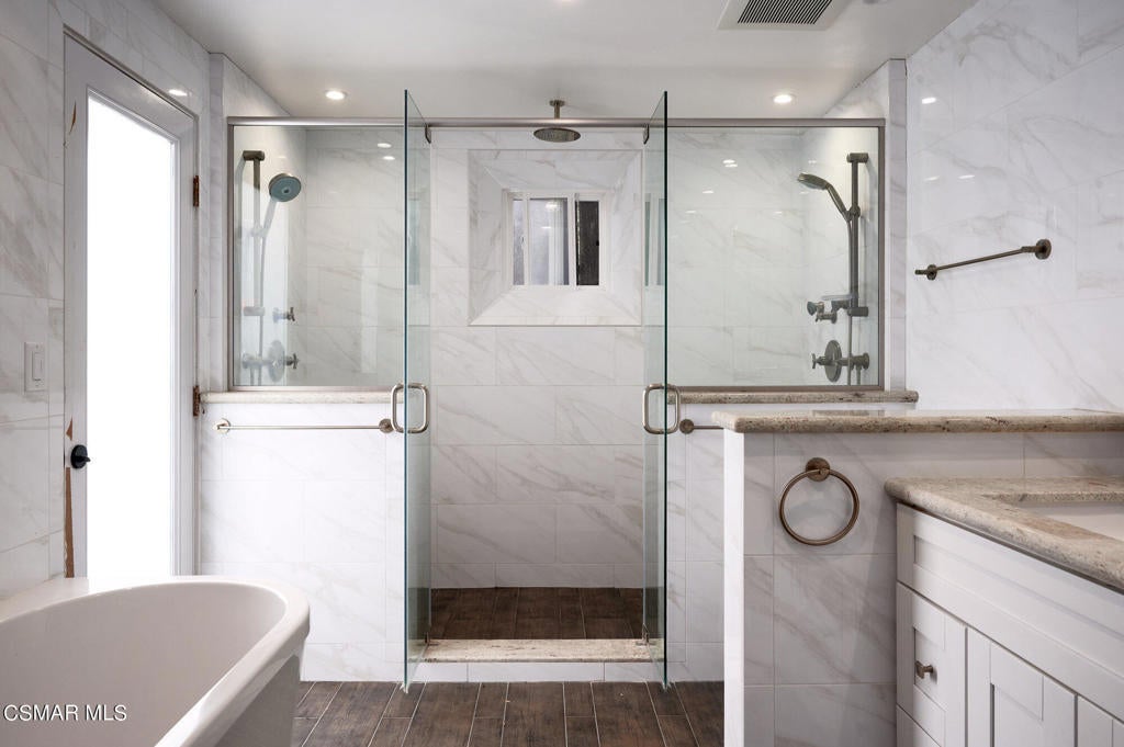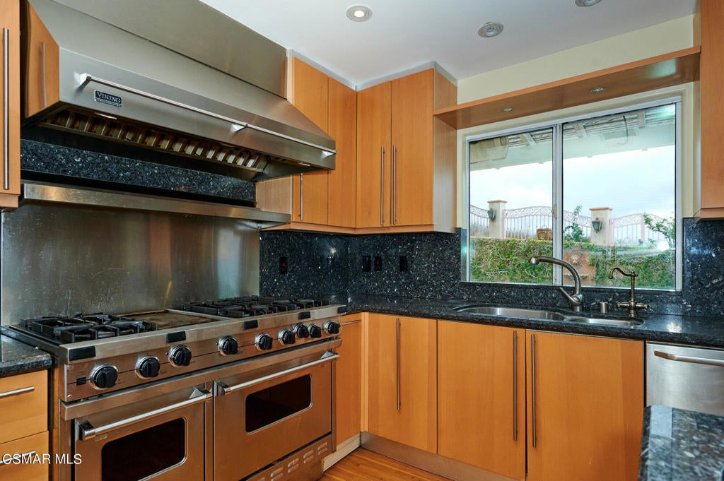 Gated View Home South of Ventura Blvd!Set on a private cul-de-sac adjacent to The Heights in Woodland Hills, this stunning 4-bed, 3-bath home (plus bonus room) offers 3,150 sq. ft. of luxurious living with breathtaking 360 views. Light and bright throughout, featuring vaulted ceilings, floor-to-ceiling windows, hardwood floors, recessed lighting, and designer finishes.The modern chef's kitchen boasts a large island with prep sink, Viking 6-burner range with griddle and dual ovens, Sub-Zero refrigerator, Miele espresso maker, wine fridge, and breakfast nook. The primary suite includes a fireplace, walk-in closet, private viewing deck, and spa-like bath with soaking tub, dual vanities, and oversized rain shower.Enjoy sweeping views of the Santa Monica Mountains, updated landscaping, and a prime location near top-rated schools. A rare opportunity for luxury and privacy with endless views!