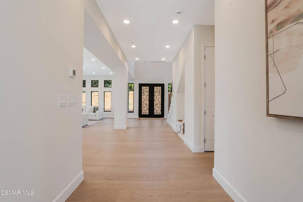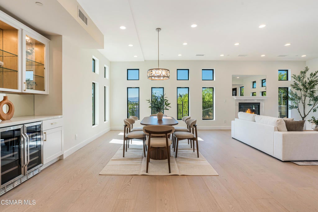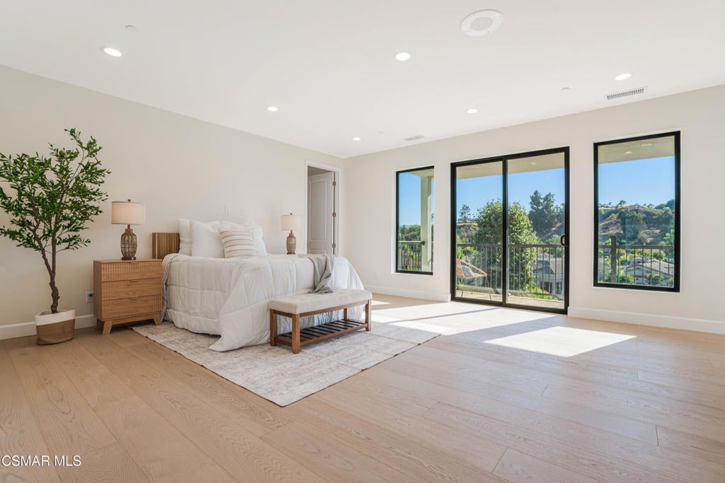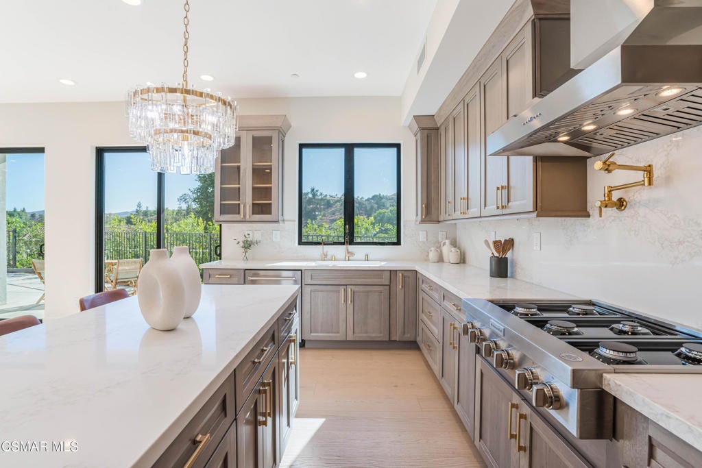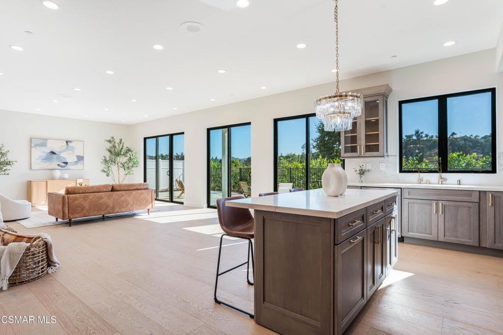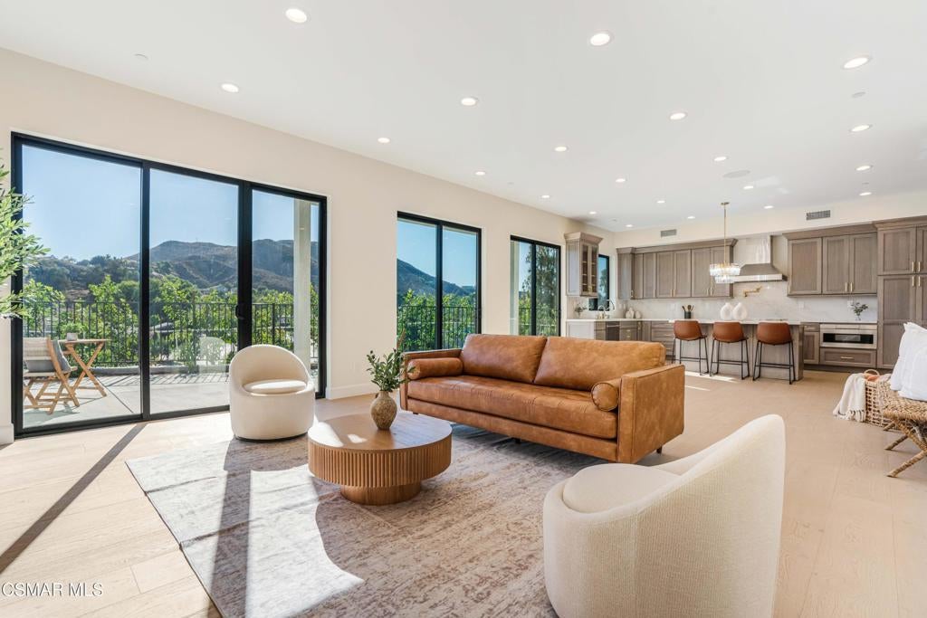 YOU MUST SEE THIS BRAND NEW CONSTRUCTION, built by Mohammad Moalej. Absolutely stunning estate located in West Simi Valley, presents a rare opportunity to own a modern 5-bedroom, 5.5-bath estate on a private gated lot with sweeping views of Mount McCoy and the Sinaloa Golf Course. With 4,500 square feet of living space and situated on a 20,563 square foot lot, this home is designed with a blend of contemporary architecture and thoughtful functionality. A shared private driveway leads to custom iron and glass double doors that open into a light-filled interior with soaring ceilings, engineered wide plank white oak flooring, and Milgard windows and doors throughout. The main level includes an inviting living room with fireplace, built-in bar with wine fridge, and hillside views. The open-concept kitchen features stainless steel KitchenAid appliance suite, quartz countertops, custom cabinetry with glass accents, elegant backsplash and gold accent hardware and pot filler. The oversized walk-in pantry will fit all of your necessities and more! The adjoining family room includes surround sound and large sliding doors that extend the living space onto a rear patio ideal for morning coffee or sunset views. The downstairs also includes a spacious guest bedroom with ensuite bath and custom closet organizers with golf course views, along with a powder room and cozy sitting nook. Upstairs, a central loft area separates the bedrooms for privacy. The expansive primary suite sits at the back of the home, showcasing panoramic views, a private balcony, a luxurious bath with marble flooring, oversized walk-in shower, soaking tub, dual vanities with custom hardware, a walk-in closet with custom organizers which is large enough to accommodate a jewelry/accessory island. Three additional upstairs bedrooms each feature ensuite baths. Two of the guest rooms are Junior primary guest suites, offering walk-in closets with custom organizers, en-suite full bathrooms with porcelain tile finishes, and lovely views. Convenient upstairs laundry room with additional storage. The home includes a 12-panel owned solar system, dual 5-ton HVAC units, tankless water heater, Cat 5/6 wiring, fire sprinklers, a finished two-car garage, new landscaping, and vinyl fencing. Every detail of this home was carefully curated to offer style, comfort, and high-end living in a private West Simi Valley setting. There is nothing else on the market like this fantastic property!