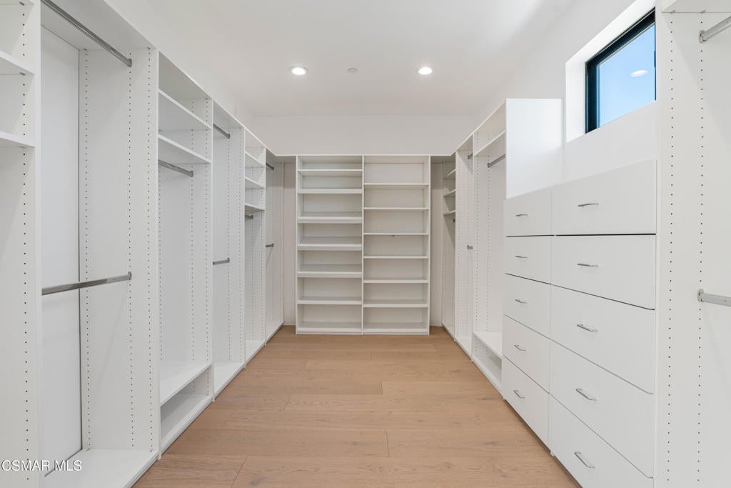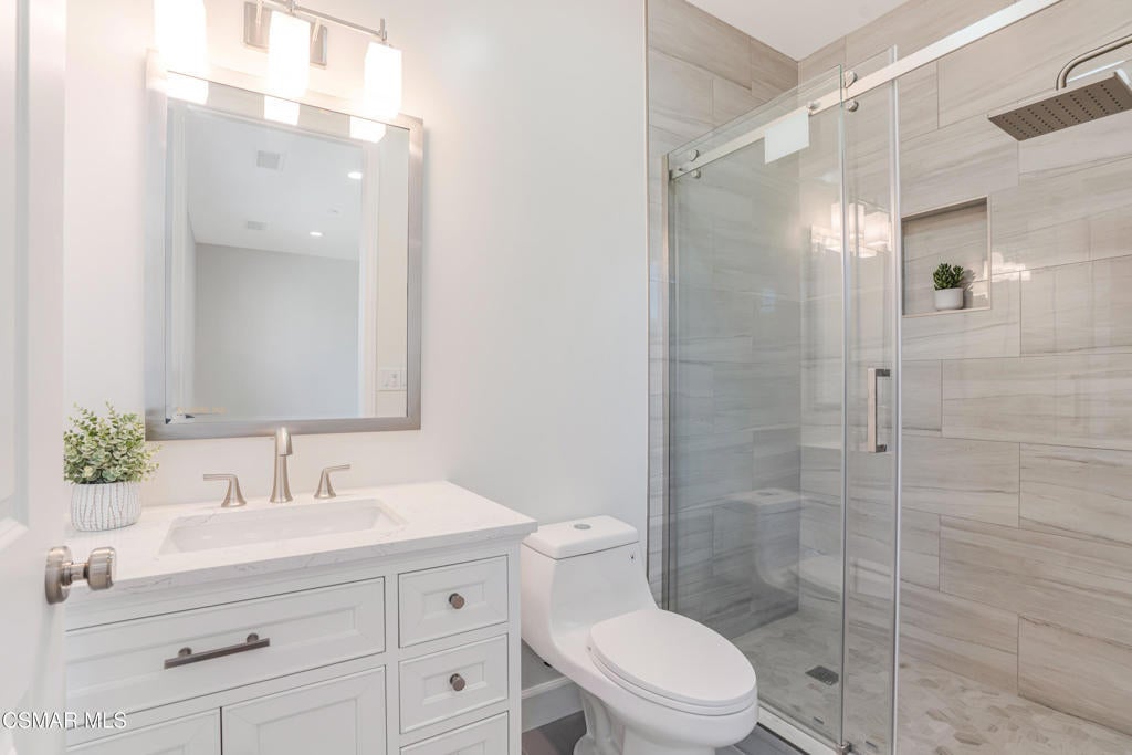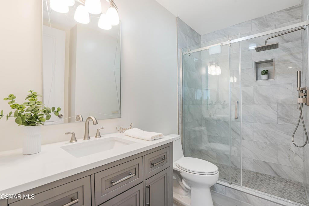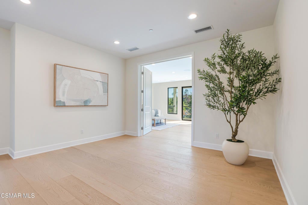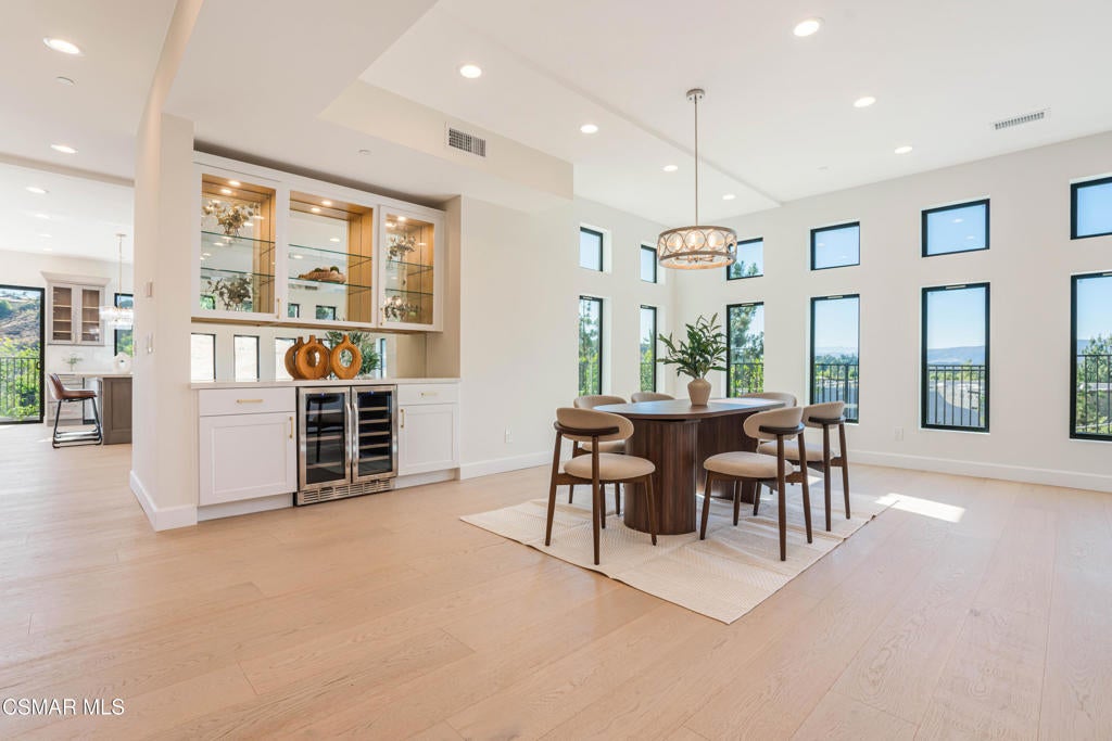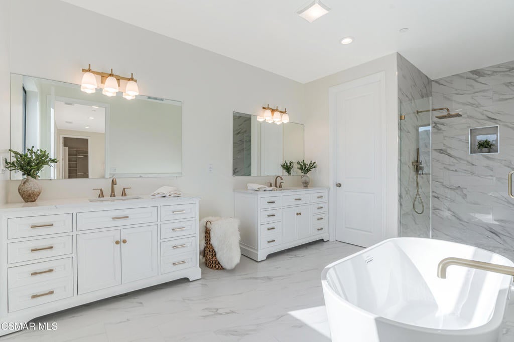 YOU MUST SEE THIS BRAND NEW CONSTRUCTION, built by Mohammad Moalej. Absolutely stunning estate located in West Simi Valley, presents a rare opportunity to own a modern 5-bedroom, 5.5-bath estate on a private gated lot with sweeping views of Mount McCoy and the Sinaloa Golf Course. With 4,500 square feet of living space and situated on a 20,563 square foot lot, this home is designed with a blend of contemporary architecture and thoughtful functionality. A shared private driveway leads to custom iron and glass double doors that open into a light-filled interior with soaring ceilings, engineered wide plank white oak flooring, and Milgard windows and doors throughout. The main level includes an inviting living room with fireplace, built-in bar with wine fridge, and hillside views. The open-concept kitchen features stainless steel KitchenAid appliance suite, quartz countertops, custom cabinetry with glass accents, elegant backsplash and gold accent hardware and pot filler. The oversized walk-in pantry will fit all of your necessities and more! The adjoining family room includes surround sound and large sliding doors that extend the living space onto a rear patio ideal for morning coffee or sunset views. The downstairs also includes a spacious guest bedroom with ensuite bath and custom closet organizers with golf course views, along with a powder room and cozy sitting nook. Upstairs, a central loft area separates the bedrooms for privacy. The expansive primary suite sits at the back of the home, showcasing panoramic views, a private balcony, a luxurious bath with marble flooring, oversized walk-in shower, soaking tub, dual vanities with custom hardware, a walk-in closet with custom organizers which is large enough to accommodate a jewelry/accessory island. Three additional upstairs bedrooms each feature ensuite baths. Two of the guest rooms are Junior primary guest suites, offering walk-in closets with custom organizers, en-suite full bathrooms with porcelain tile finishes, and lovely views. Convenient upstairs laundry room with additional storage. The home includes a 12-panel owned solar system, dual 5-ton HVAC units, tankless water heater, Cat 5/6 wiring, fire sprinklers, a finished two-car garage, new landscaping, and vinyl fencing. Every detail of this home was carefully curated to offer style, comfort, and high-end living in a private West Simi Valley setting. There is nothing else on the market like this fantastic property!