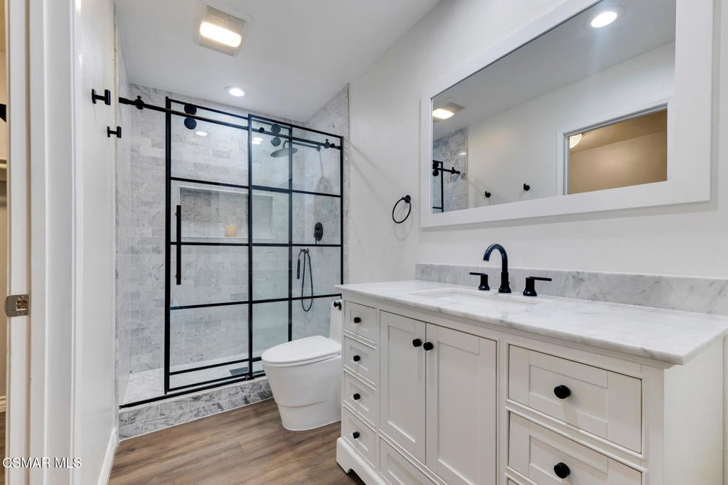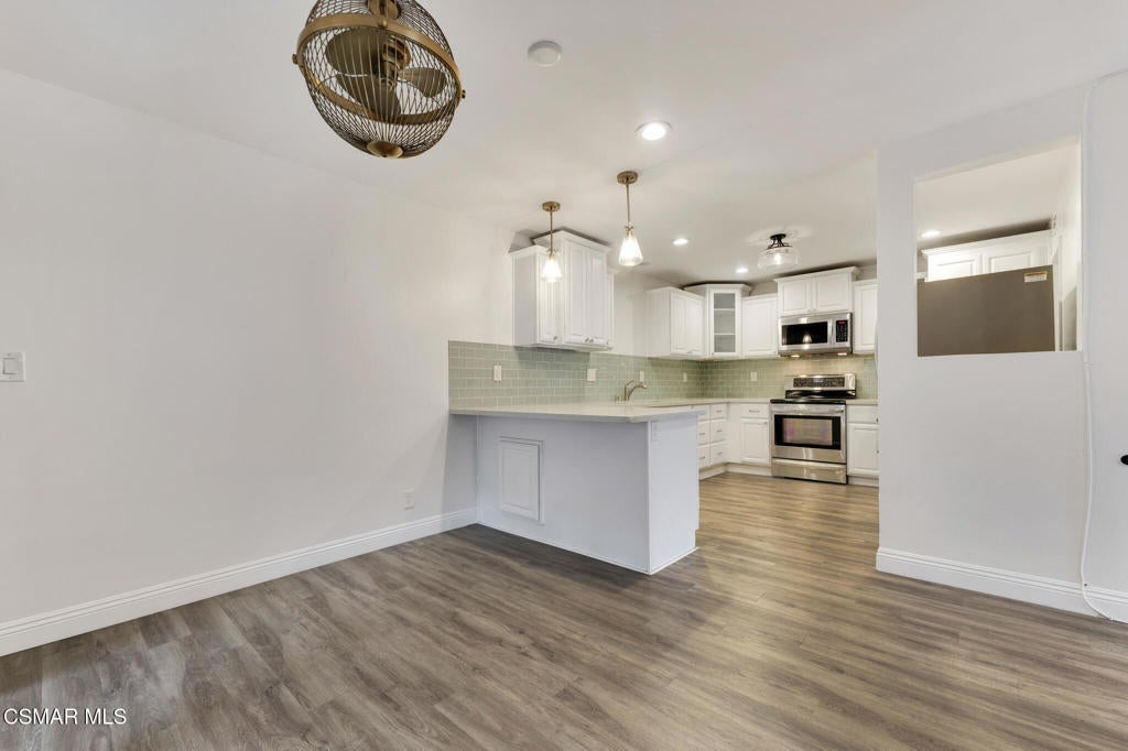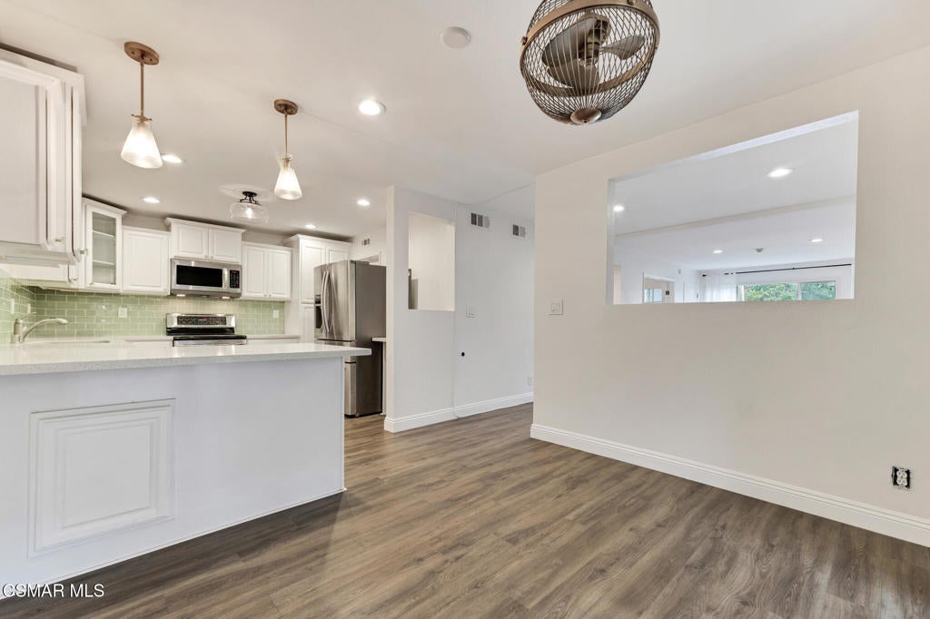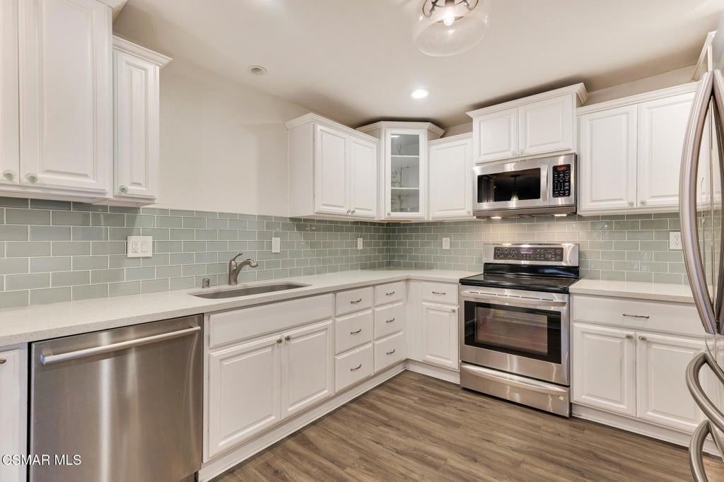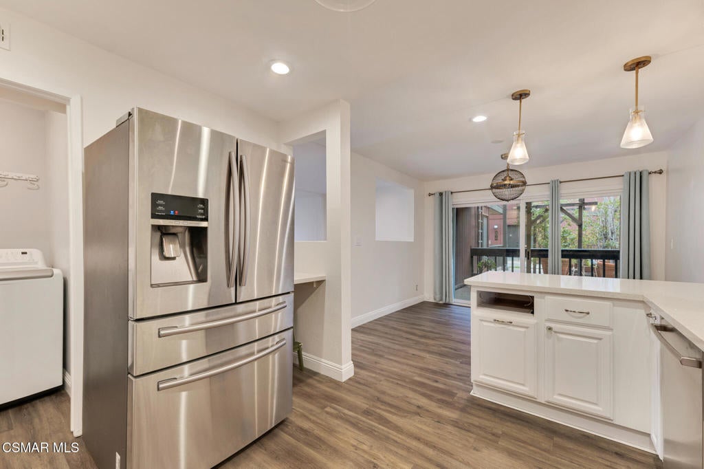 Welcome to the highly sought-after Lakeside Villas, a gated, 24-hour guard-attended community nestled around a serene private lake in the heart of Culver City. Surrounded by beautifully landscaped grounds and scenic walking trails, this exceptional multi-level townhome-style condo blends comfort and modern style.Upstairs you'll find three spacious bedrooms and two tastefully updated bathrooms, all enhanced by dramatic vaulted ceilings that lend an airy, open feel. Downstairs, a convenient powder room accompanies a versatile enclosed den or office that could also potentially be used as a fourth bedroom or creative workspace.The remodeled kitchen features classic shaker cabinetry, stylish tile backsplash, stone countertops, and a suite of high-quality stainless steel appliances, including a Bosch dishwasher, Samsung refrigerator, LG oven, and in-unit washer/dryer. Adjacent to the kitchen is a cozy breakfast nook or family space that flows effortlessly into an expansive, private covered patio--ideal for relaxing or entertaining.Enjoy defined living spaces with a formal dining room that opens to a sunlit living area, while the primary suite offers a peaceful retreat with its own sitting area, private terrace, walk-in closet, and en-suite bath.Additional highlights include engineered wood flooring throughout, recessed lighting, central air and heat, and a dedicated laundry room with side-by-side machines and extra storage.Lakeside Villas residents enjoy an impressive list of amenities including water, trash, earthquake insurance, and access to the community's pool, spa, fitness center, clubhouse, and lake maintenance--all included in the HOA.