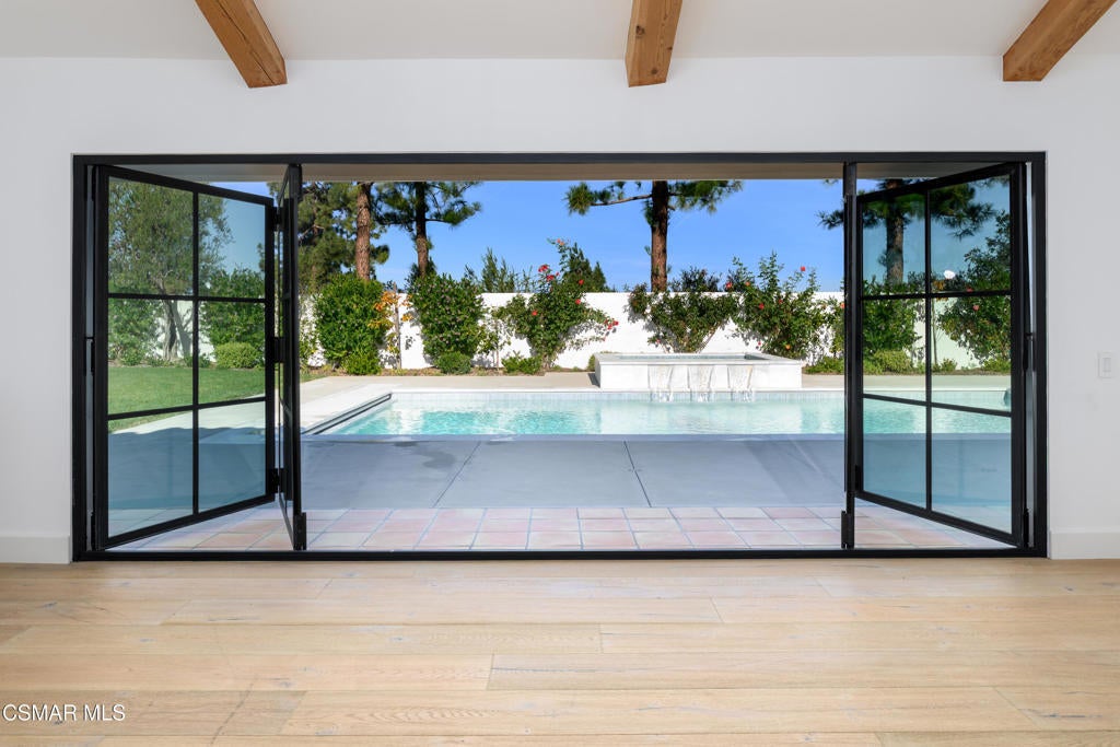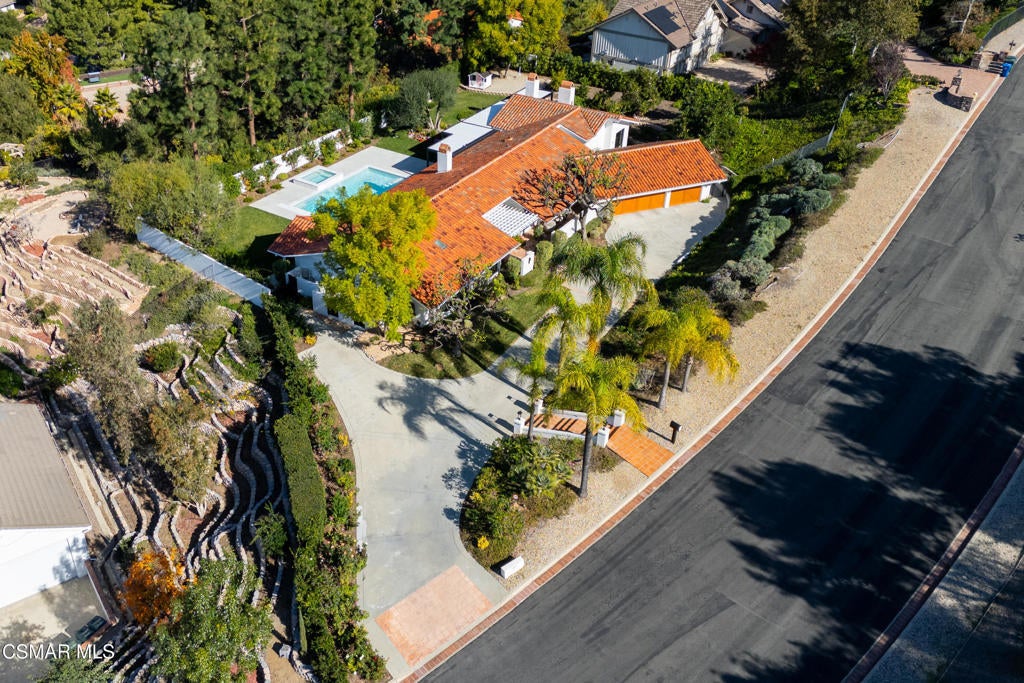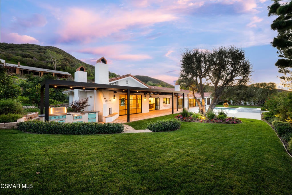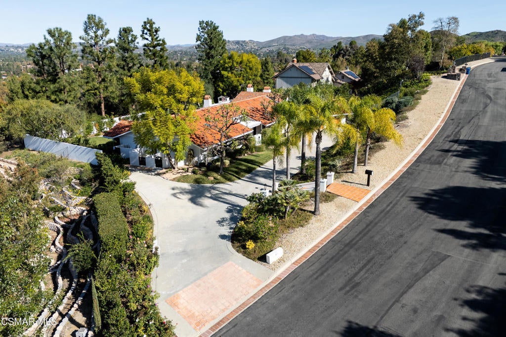 Gorgeous, fully upgraded single-story estate on a private 3/4-acre view lot in the charming, gated community of Los Robles Hills Estates. This beautifully renovated home offers exceptional curb appeal with lush landscaping, smooth stucco exterior, high-end Euroline black steel windows, sliders and accordion doors, contemporary lighting, and a gated front courtyard with paver hardscape.The dream entertainer's yard is a true showpiece--featuring sweeping views, a remodeled pool with motorized cover, brand-new spa, new hardscape, large grass areas, outdoor speakers, abundant fruit trees, and a large StruXure Pergola X motorized patio cover with built-in heating, fans, and lighting. Enjoy an outdoor kitchen equipped with a Hestan BBQ & side burner, refrigerator, and an outdoor fireplace. The smooth coat stucco privacy wall matches the home for a seamless, modern aesthetic. There is also large side yard with many fruit trees and herb garden. Inside, the sprawling one-story floorplan showcases an impressive chef's kitchen with quartz counters, Wolf, Miele & Bosch stainless appliances, glass lighted cabinets, a large island, two skylights, and a breakfast area that opens to the family room with custom fireplace. The expansive living room features a fireplace, high beamed ceilings, and fully opening steel accordion doors--perfect for indoor-outdoor entertaining. An office with high beamed ceiling & fireplace complements the four spacious bedrooms, including a stunning primary suite with views, custom cabinetry, wood floors, walk-in closet, quartz counters, dual sinks, a large frameless glass shower with rain head, and a soaking tub with a dramatic ceiling-fill feature.Additional upgrades include Euroline steel windows and doors throughout, wide-plank matte wood flooring, crown molding, updated bathrooms, two tankless water heaters, dual-zone HVAC, new recessed lighting and fixtures, built-in speakers in living and family rooms, 3 car garage with epoxy flooring and custom doors, closet organizers, and an oversized laundry/mud room with sink, wine cooler, and extensive cabinetry.Close to golf, hiking and biking trails, this is a gorgeous dream home offering privacy, views, luxury finishes, and premier indoor-outdoor living at its finest.
