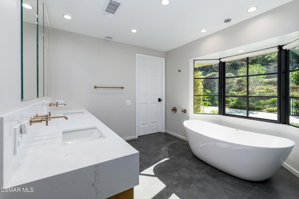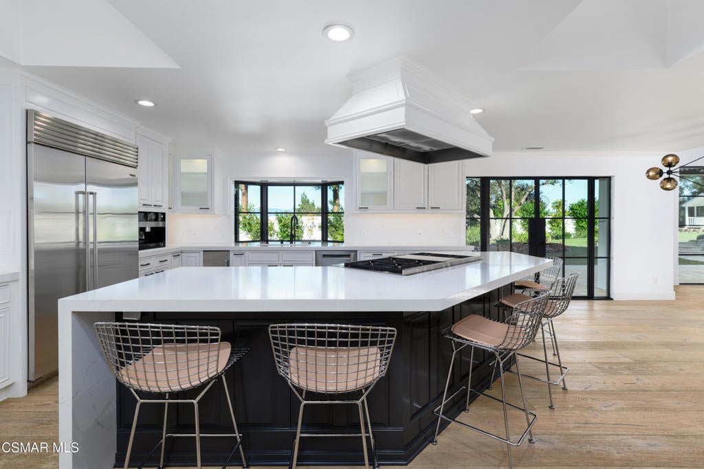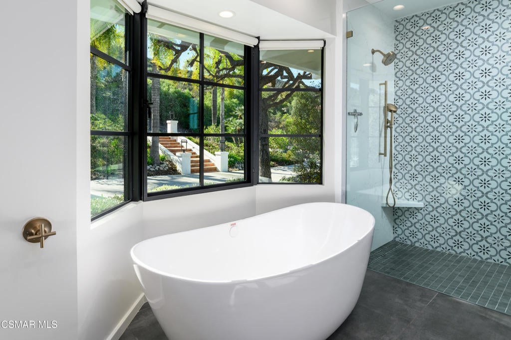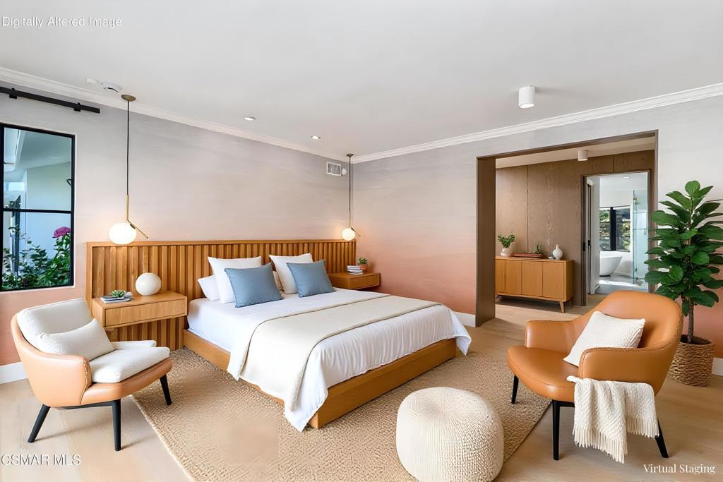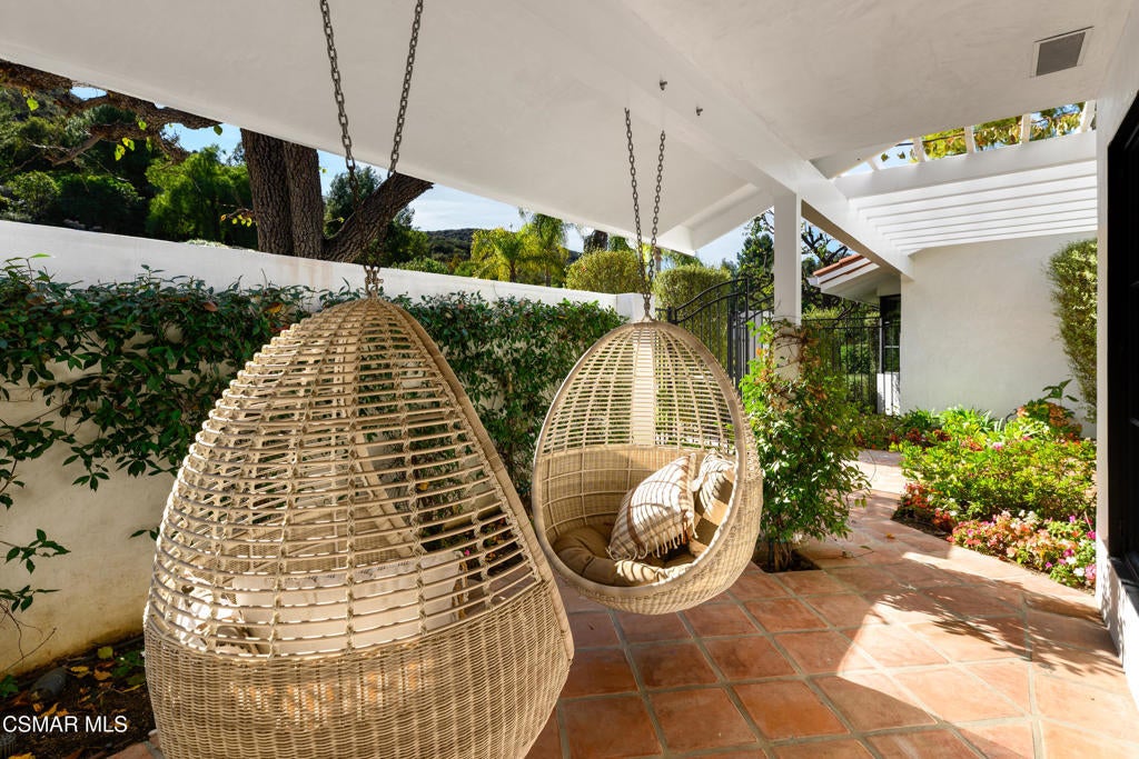 Gorgeous, fully upgraded single-story estate on a private 3/4-acre view lot in the charming, gated community of Los Robles Hills Estates. This beautifully renovated home offers exceptional curb appeal with lush landscaping, smooth stucco exterior, high-end Euroline black steel windows, sliders and accordion doors, contemporary lighting, and a gated front courtyard with paver hardscape.The dream entertainer's yard is a true showpiece--featuring sweeping views, a remodeled pool with motorized cover, brand-new spa, new hardscape, large grass areas, outdoor speakers, abundant fruit trees, and a large StruXure Pergola X motorized patio cover with built-in heating, fans, and lighting. Enjoy an outdoor kitchen equipped with a Hestan BBQ & side burner, refrigerator, and an outdoor fireplace. The smooth coat stucco privacy wall matches the home for a seamless, modern aesthetic. There is also large side yard with many fruit trees and herb garden. Inside, the sprawling one-story floorplan showcases an impressive chef's kitchen with quartz counters, Wolf, Miele & Bosch stainless appliances, glass lighted cabinets, a large island, two skylights, and a breakfast area that opens to the family room with custom fireplace. The expansive living room features a fireplace, high beamed ceilings, and fully opening steel accordion doors--perfect for indoor-outdoor entertaining. An office with high beamed ceiling & fireplace complements the four spacious bedrooms, including a stunning primary suite with views, custom cabinetry, wood floors, walk-in closet, quartz counters, dual sinks, a large frameless glass shower with rain head, and a soaking tub with a dramatic ceiling-fill feature.Additional upgrades include Euroline steel windows and doors throughout, wide-plank matte wood flooring, crown molding, updated bathrooms, two tankless water heaters, dual-zone HVAC, new recessed lighting and fixtures, built-in speakers in living and family rooms, 3 car garage with epoxy flooring and custom doors, closet organizers, and an oversized laundry/mud room with sink, wine cooler, and extensive cabinetry.Close to golf, hiking and biking trails, this is a gorgeous dream home offering privacy, views, luxury finishes, and premier indoor-outdoor living at its finest.