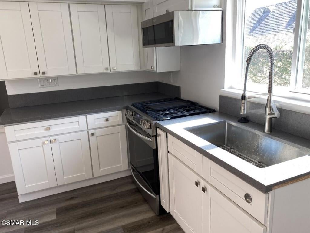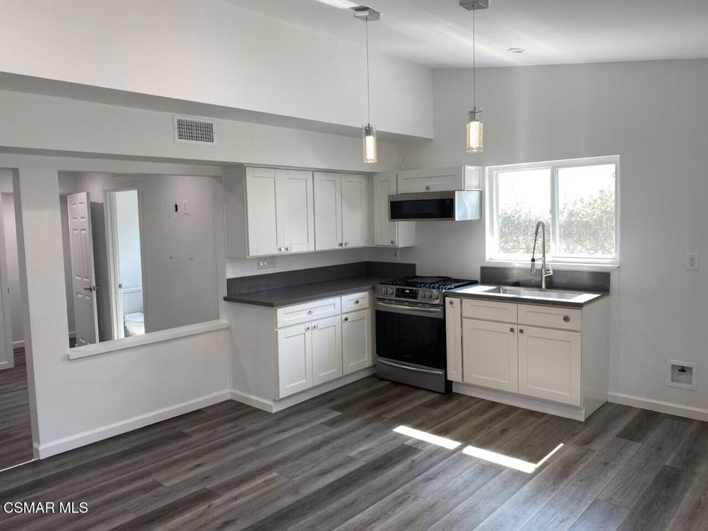 Welcome home to this spacious studio with one bathroom ADU in Newbury Park. Modern finishes include shaker style kitchen cabinets, beautiful quartz countertops, and walk in pantry with loads of storage. The dining area features beautiful updated lighting fixtures. Large living room and separate sleep area. The bathroom is truly gorgeous with an updated vanity and a huge custom tiled shower with dual shower heads. A laundry closet offers additional storage and hookups for a stackable unit. Vinyl plank flooring and recessed lighting throughout. This adorable unit is accessed from the side gate with its own separate and private entrance. The large private yard is separate from the main house and boasts incredible views of Mt. Boney and gorgeous sunsets. Plenty of room for a patio table, chairs, and BBQ. There's also plenty of room to add a shed or to park a small RV, boat, or other toys.