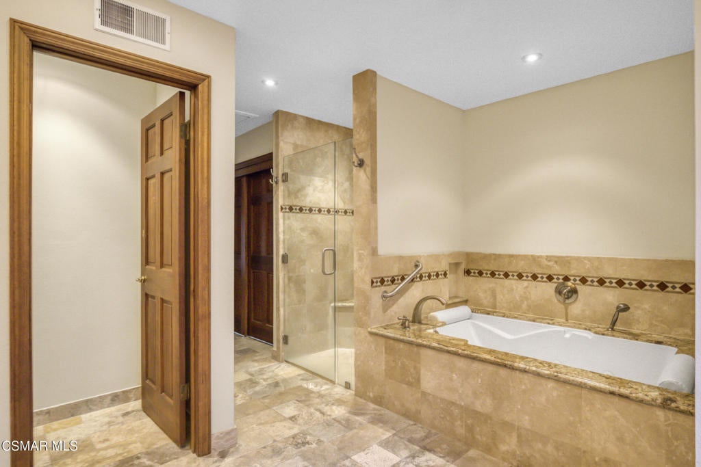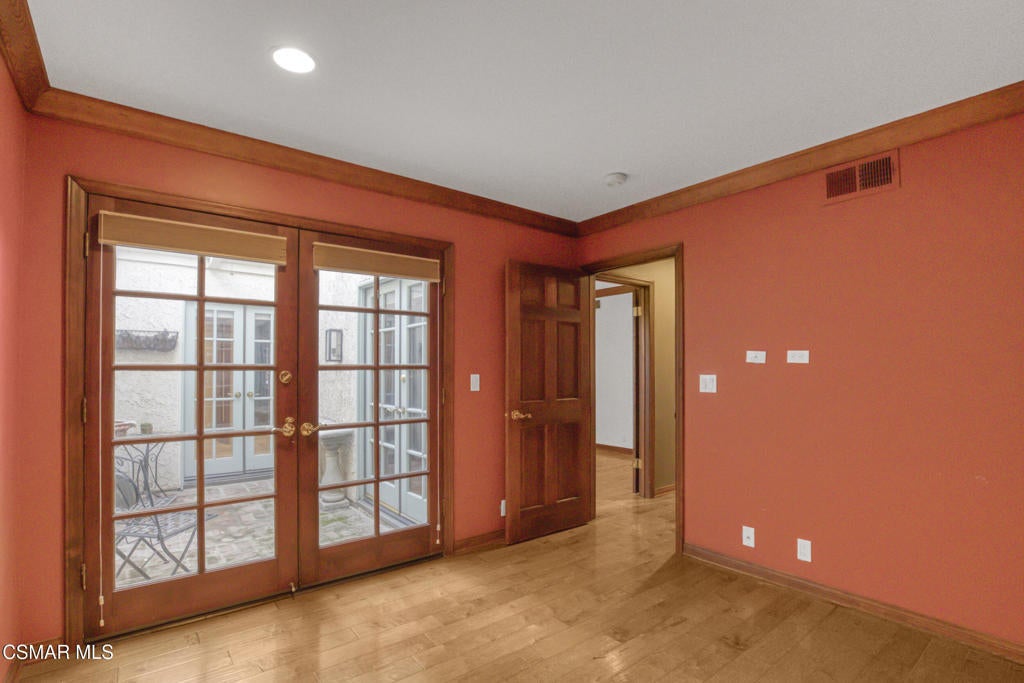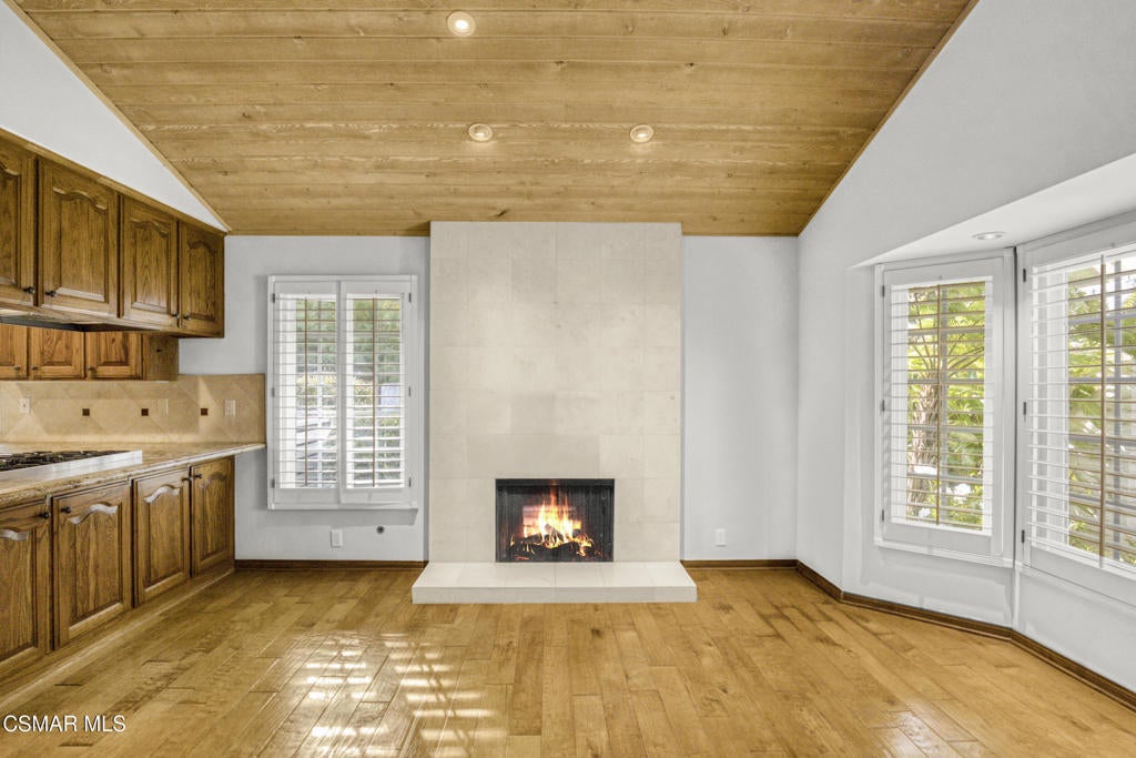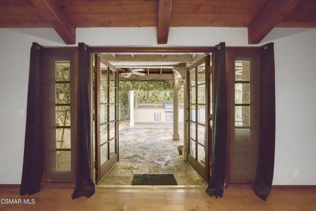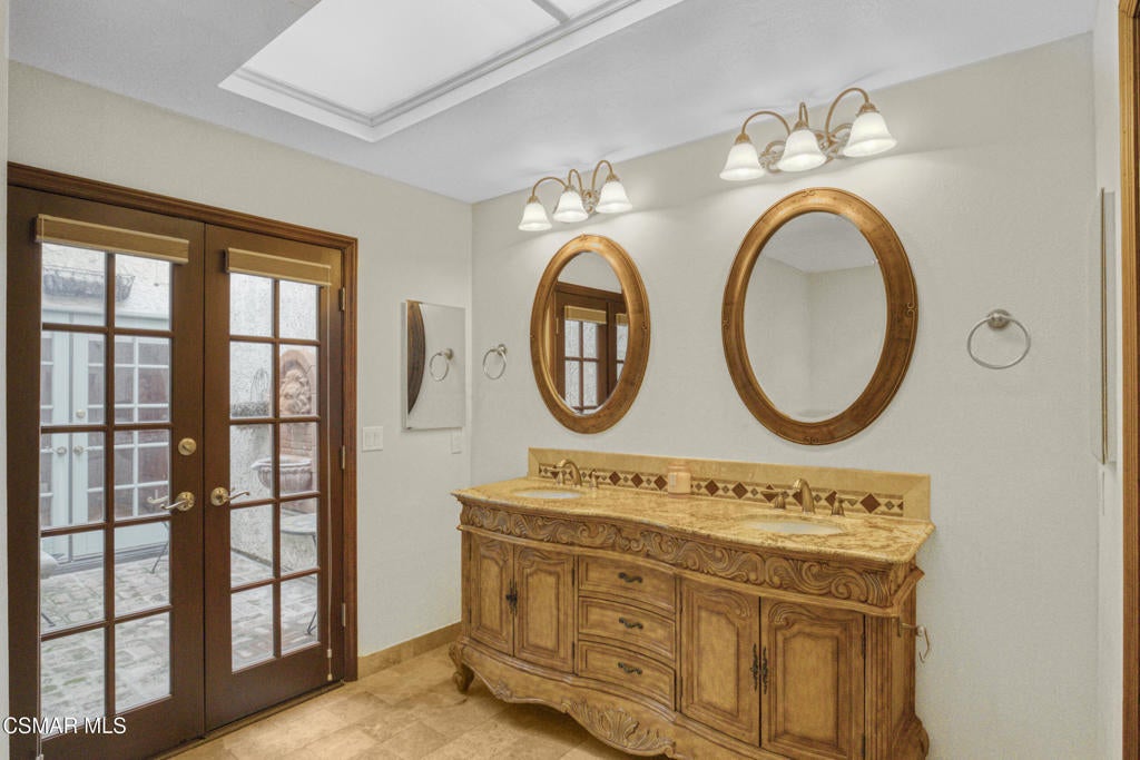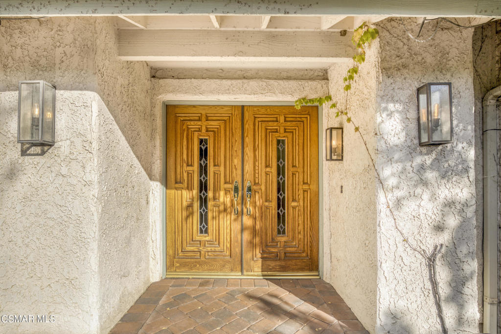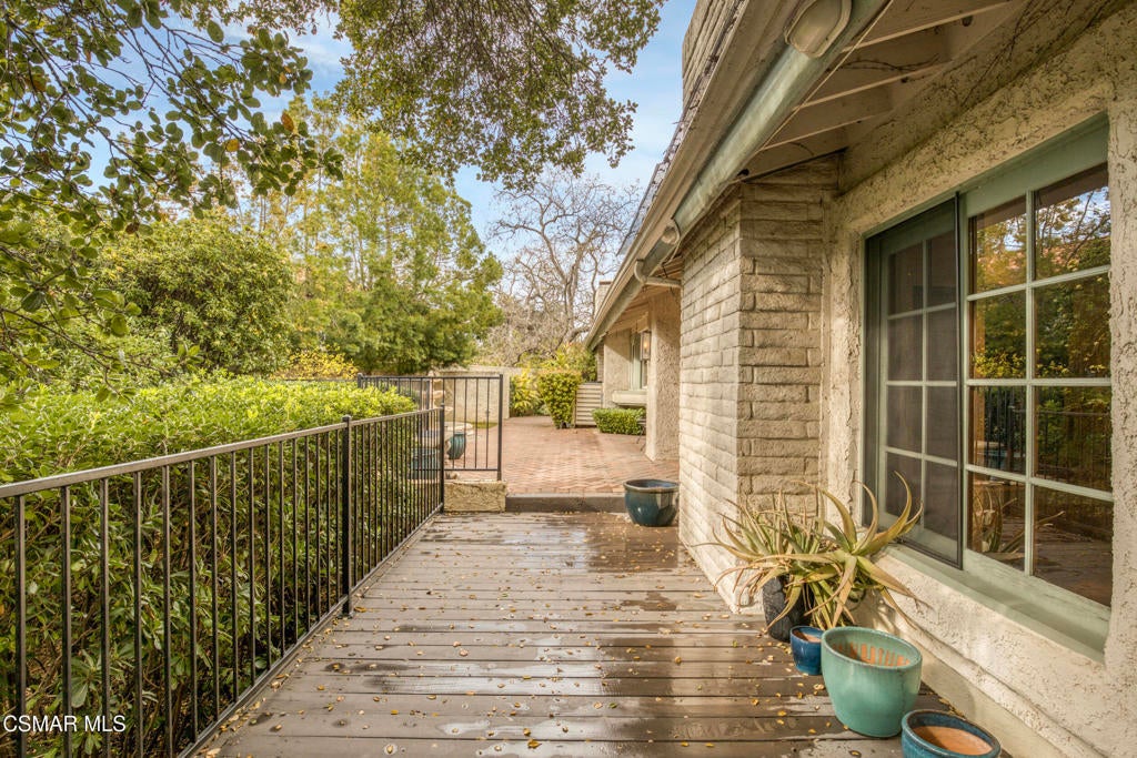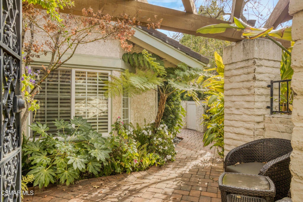 Beautiful single story 3 br townhome in highly desirable area of North Ranch in Westlake Village. Privately gated entrance, direct access 2-car garage, and convenient indoor laundry room are just a few of the features this home has to offer. As you enter the home through the front double door, you're greeted on one side by a large living rm w/fireplace, vaulted ceiling and french doors opening to the peaceful and private backyard. There is a separate dining rm on the other side of the home's entrance. With granite counters and stainless steel appliances, the kitchen opens to a nice sized family room or eating area with a fireplace and charming bay window. The primary bedroom ensuite is spacious, featuring vaulted ceilings, french doors leading to the backyard, two separate closets and the well-appointed bathroom with spa tub, separate shower and double vanity. Two additional bedrooms are located around the other side of the home, both having access to a lovely and tranquil garden atrium where you can enjoy morning coffee or a glass of wine before dinner. Other features include wood and polished limestone flooring, two fireplaces, and an enchanting woodland setting all around, including a creek behind the large entertainers' backyard with an outdoor kitchen. The property offers several relaxing outdoor spaces and the Ben Johnson Fairway townhome community has so much to offer, situated around the golf course of North Ranch Country Club, with easy freeway access, nearby shops and restaurants and award-winning schools. It's a lifestyle choice, so don't miss out on this single story opportunity!