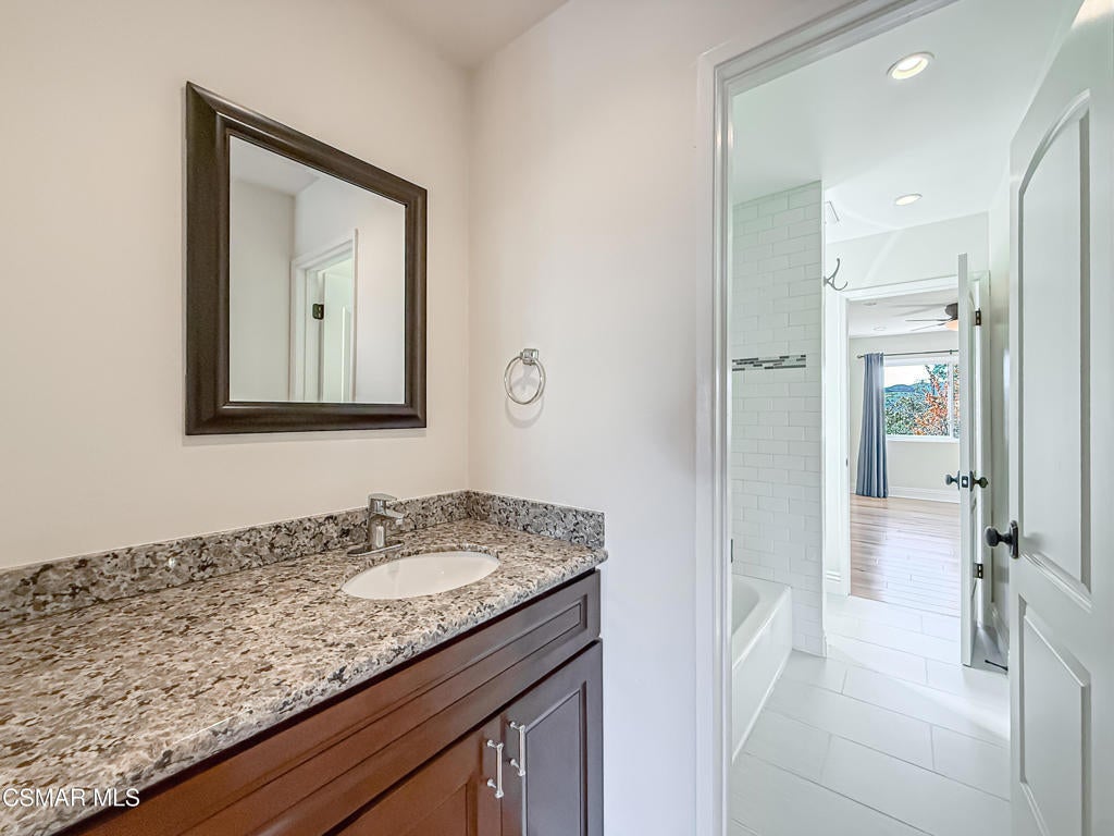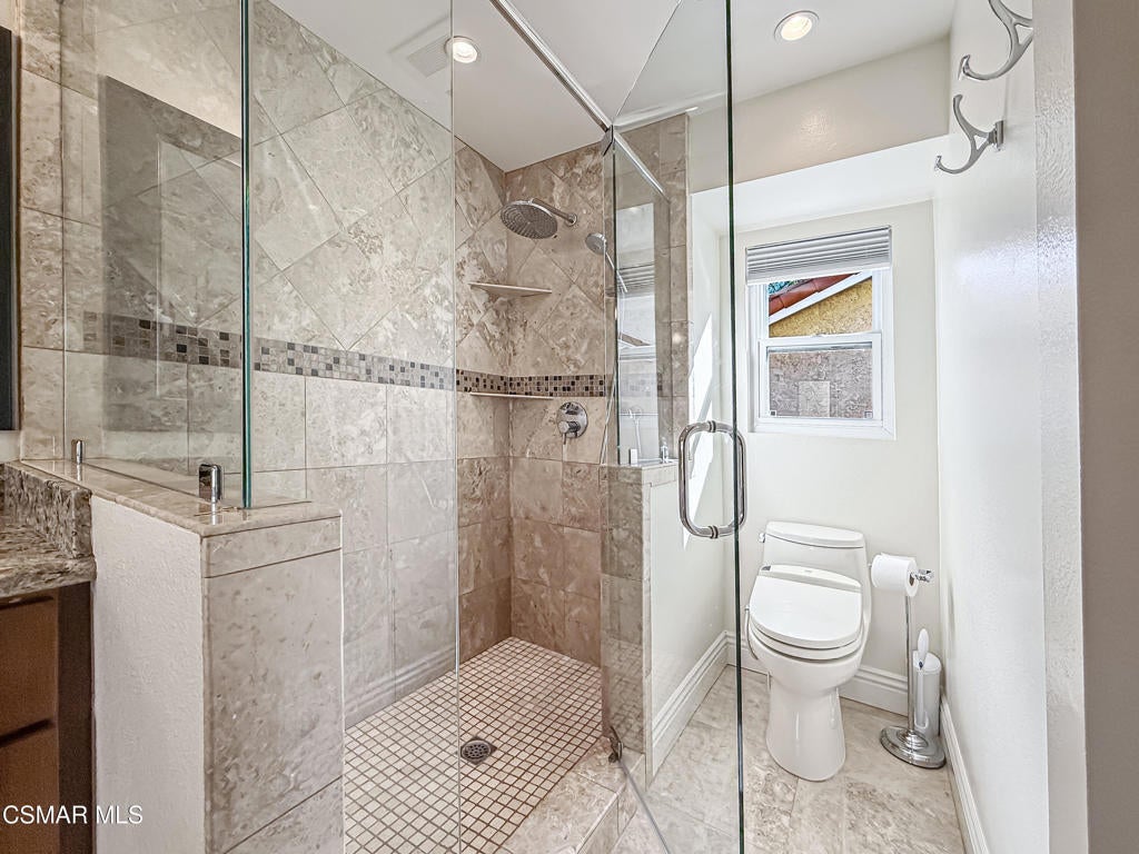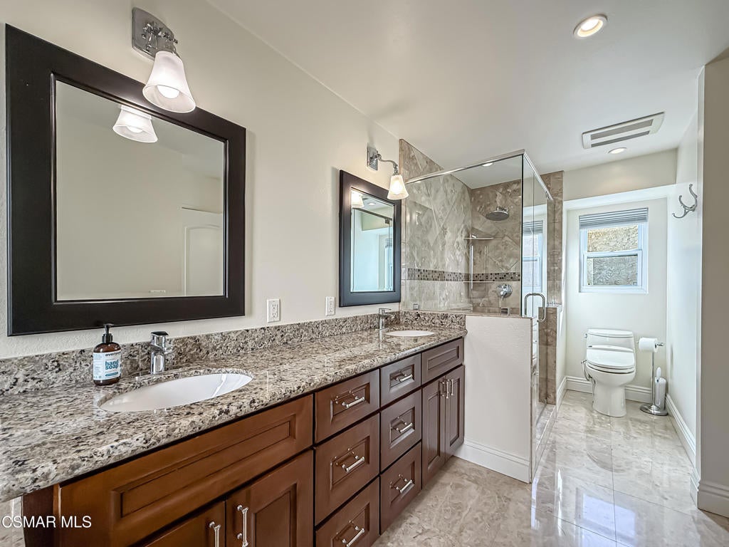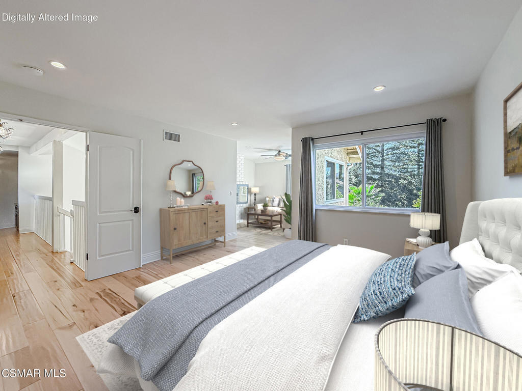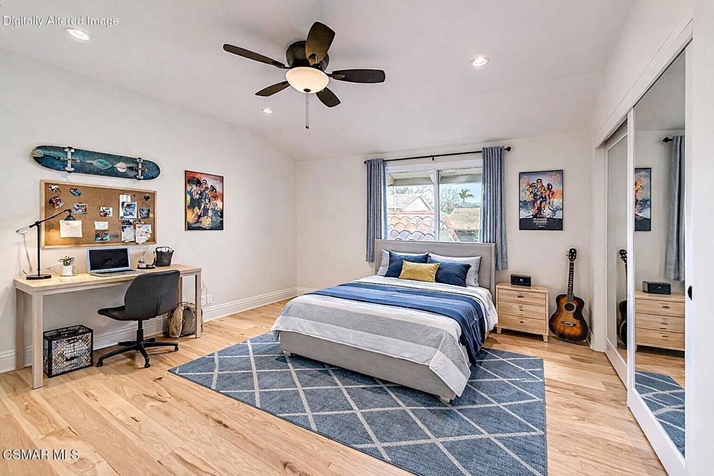 Welcome to 877 Rim Crest Drive, a beautifully updated residence nestled in the highly desirable Village Homes neighborhood of Westlake Village. Set on a generous and private 10,454 sq ft lot, this home offers an exceptional blend of comfort, style, and indoor-outdoor living, complete with mountain views, a pool and spa, outdoor dining area, and a thoughtfully designed floor plan ideal for today's lifestyle.The home features 5 bedrooms, including two bedrooms conveniently located downstairs, and 3.5 bathrooms, making it perfect for guests, multi-generational living, or a home office setup. The light-filled interior showcases numerous upgrades throughout, beginning with the updated kitchen with island, featuring GE Cafe series range and microwave, Bosch dishwasher, GE refrigerator, and a timeless tumbled travertine backsplash. All bathrooms have been tastefully remodeled and include Toto toilets and Restoration Hardware lighting fixtures and accessories. The primary suite is a true retreat! Highlights include a cozy sitting area with fireplace that looks out to the pool and local mountains, custom dual closets and a tastefully updated bathroom with an expanded marble shower, glass enclosure, elegant Crema Marfil marble tile, dual vanities, & bidet.Additional features include updated interior and closet doors throughout, dual-pane windows and sliders, wood flooring in all upstairs bedrooms and hallway, updated tile downstairs in main living areas and hallway, an updated HVAC system, newer roof, updated pool equipment and heater. The home also offers a separate downstairs laundry room with cabinets and sink and spacious 3-car garage with pull-down overhead storage. Residents of Village Homes enjoy a low cost HOA ($275/quarter) and amenities that include a clubhouse, tennis court, pool, and kiddie pool, neighborhood walking paths, along with close proximity to parks, award-winning schools, shopping, and restaurants.