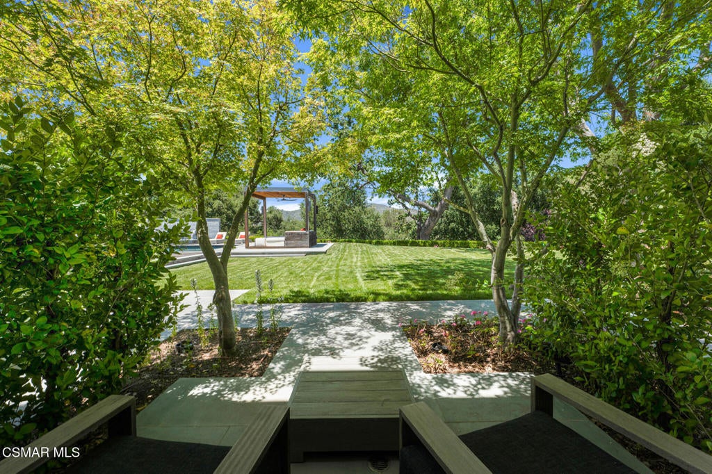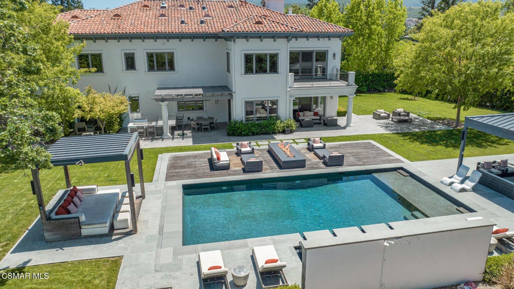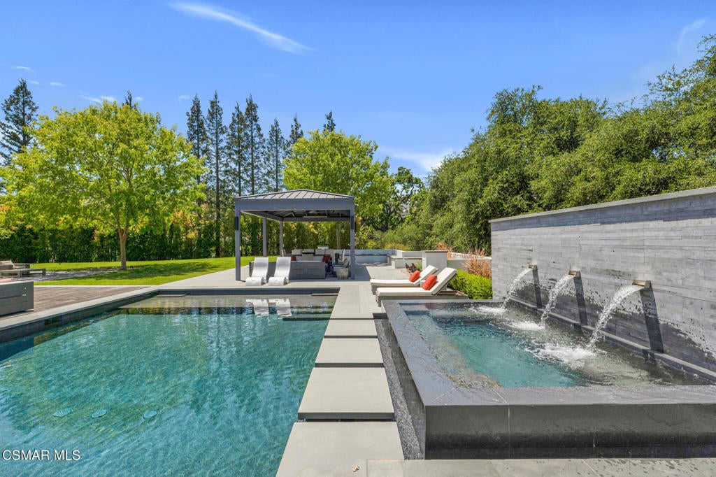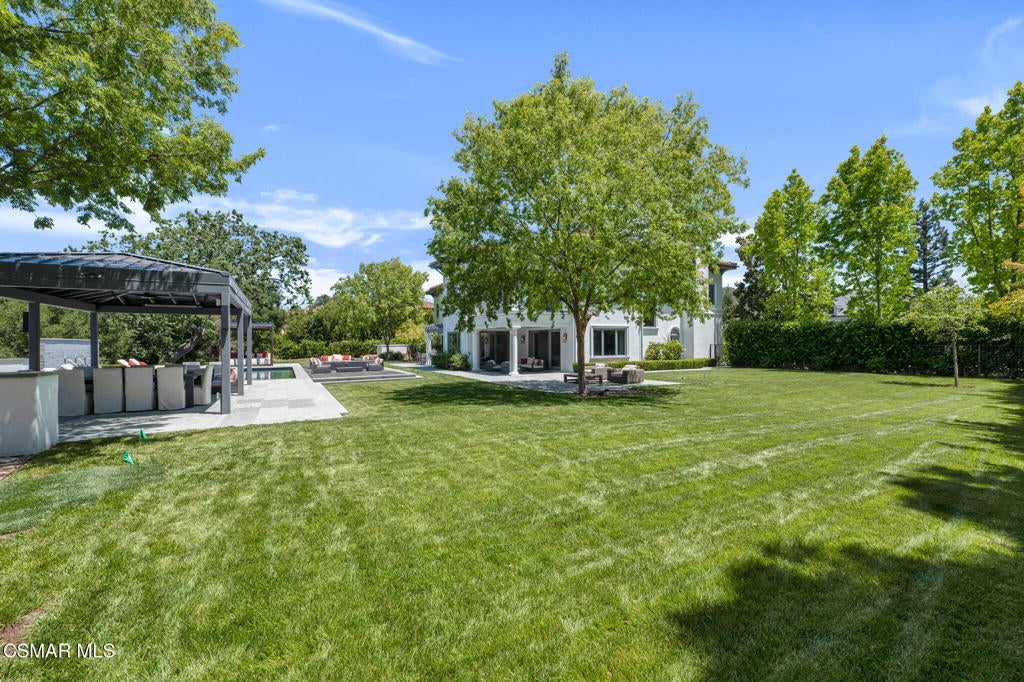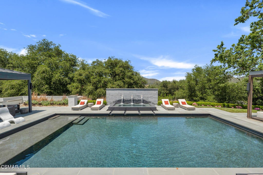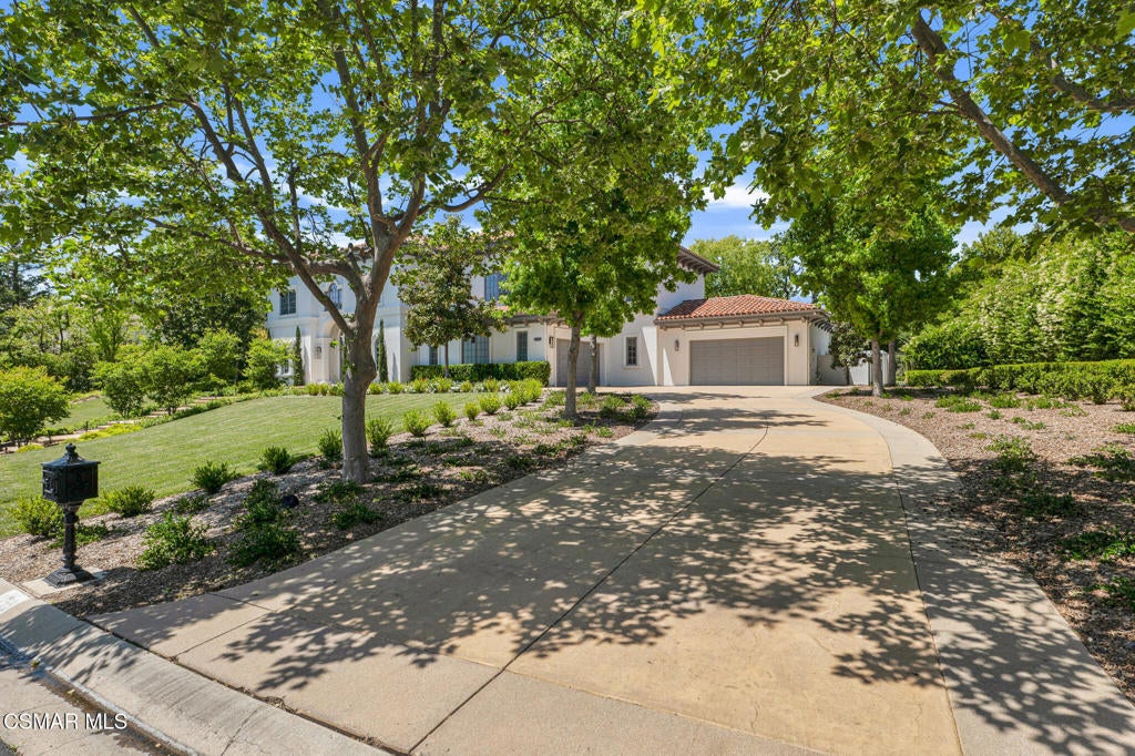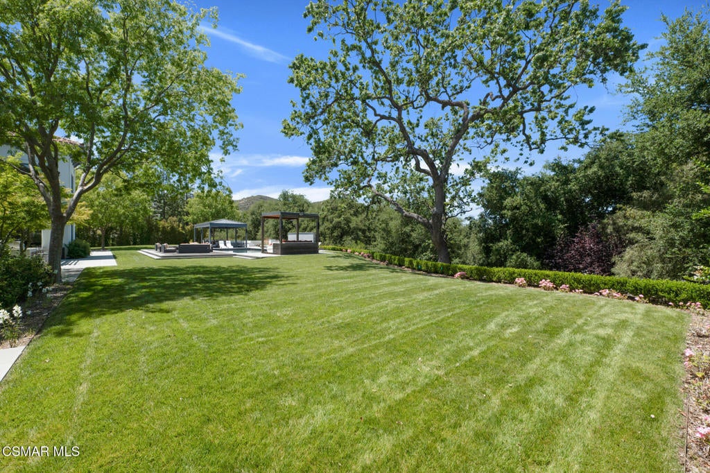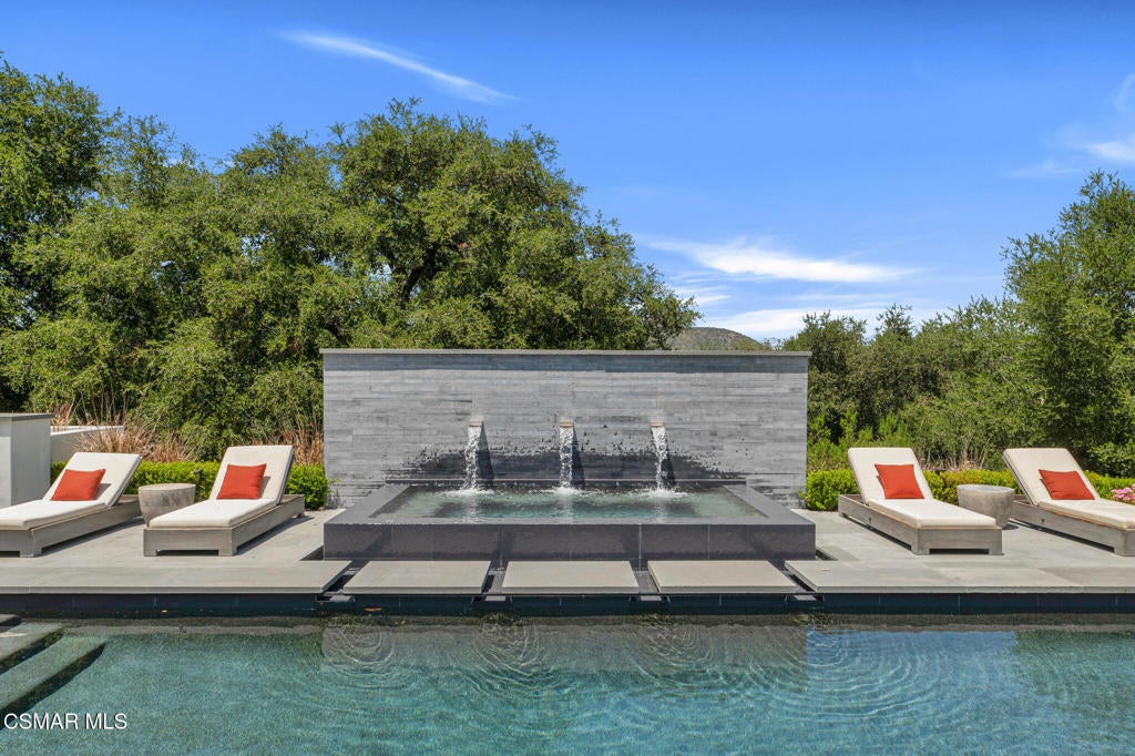 Incredible Price Change by -$1,500,000 !!!! One of the Most Stylish Homes in Sherwood - A True Masterpiece. Incredible one acre lot with total privacy on the Best cul de sac in Lake Sherwood.... This extraordinary residence is one of Sherwood's most elegantly appointed homes and must be seen to be fully appreciated. Exquisite, high-end finishes are found throughout, including Calcutta Manhattan gray marble, Black Diamond quartzite, Titanium quartzite with a leathered finish, Fantasy Blue quartzite, and Zebra Striato Olimpico marble in the primary bath. The gourmet kitchen features Japanese Nano glass surfaces and is complemented by imported Murano glass chandeliers from Italy.Backing to 56 acres of open space known as Dickens Patch, this home offers unmatched privacy, breathtaking finishes, and a lifestyle of luxury in a truly stunning setting.Designer elements include wall coverings and drapery fabrics by Christian Lacroix and Kelly Wearstler, elevating every space with curated sophistication.The thoughtful floor plan includes five luxurious en-suite bedrooms, a stunning powder room, a private office, and a state-of-the-art home theater designed and installed by Wilshire Media. An impressive professional bar and entertainment room enhances the home's exceptional appeal.Situated on one of Sherwood's rare, usable one-acre lots (combining two parcels), the property is designed for both privacy and outdoor enjoyment. The resort-style backyard includes a beautifully renovated pool and spa with a full retractable cover, expansive patio overhangs, generous lawn areas, and multiple entertaining spaces. There are two separate large 2 car garages.