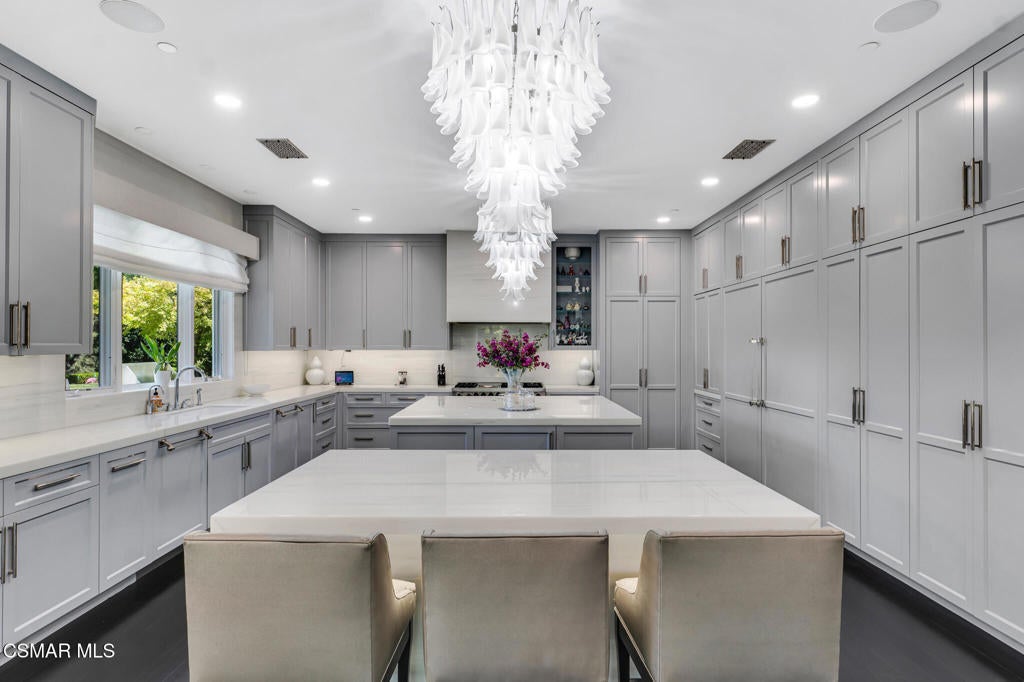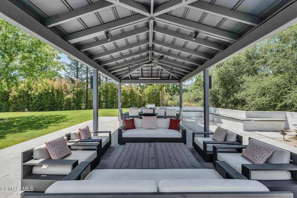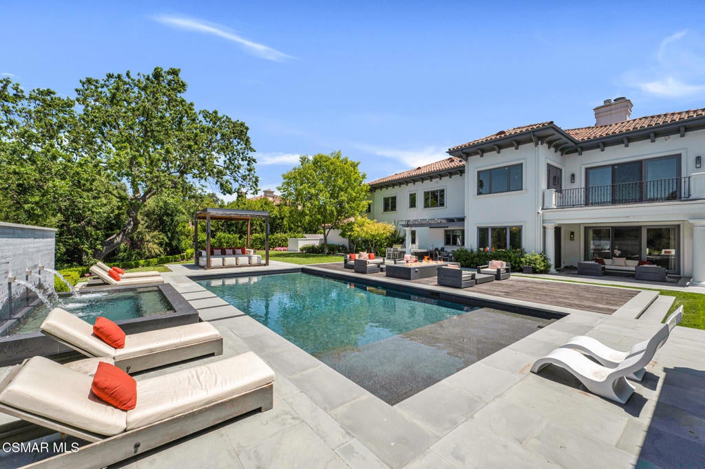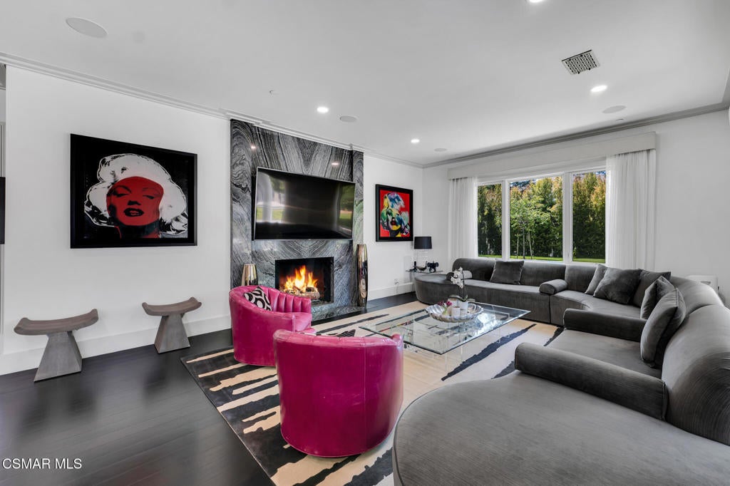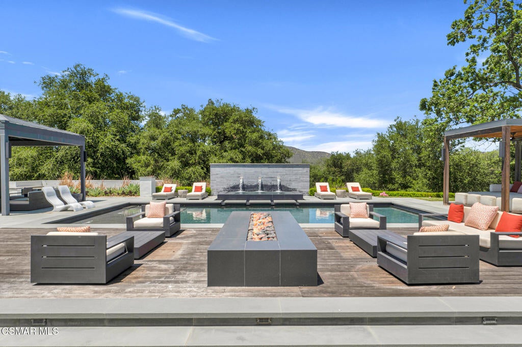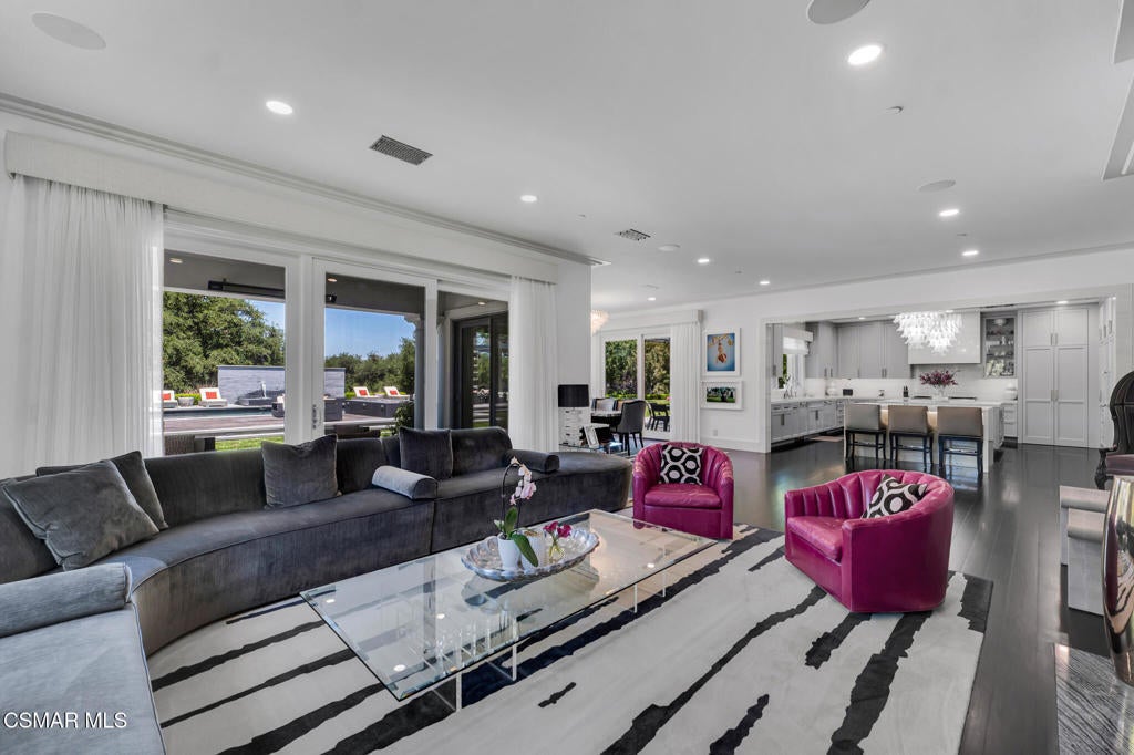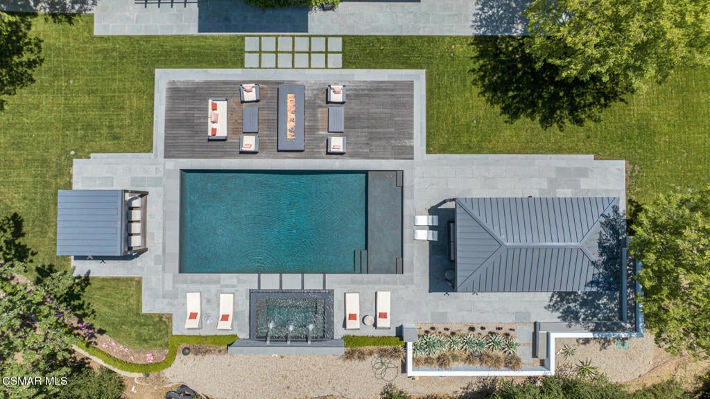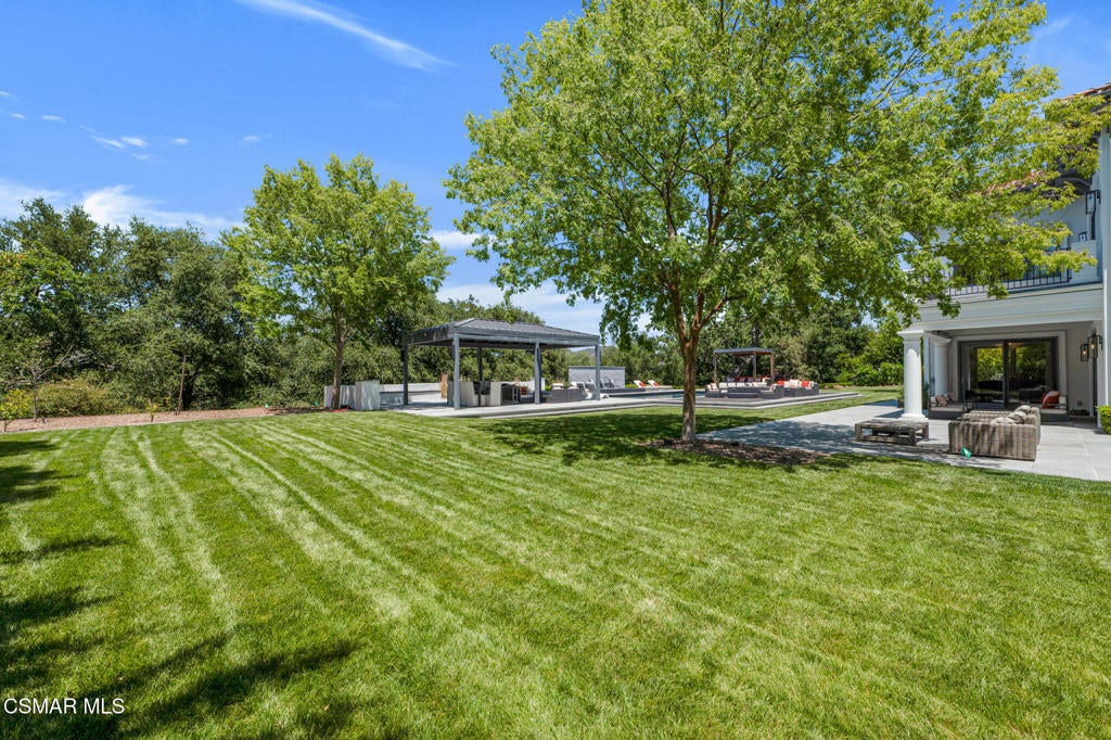 Incredible Price Change by -$1,500,000 !!!! One of the Most Stylish Homes in Sherwood - A True Masterpiece. Incredible one acre lot with total privacy on the Best cul de sac in Lake Sherwood.... This extraordinary residence is one of Sherwood's most elegantly appointed homes and must be seen to be fully appreciated. Exquisite, high-end finishes are found throughout, including Calcutta Manhattan gray marble, Black Diamond quartzite, Titanium quartzite with a leathered finish, Fantasy Blue quartzite, and Zebra Striato Olimpico marble in the primary bath. The gourmet kitchen features Japanese Nano glass surfaces and is complemented by imported Murano glass chandeliers from Italy.Backing to 56 acres of open space known as Dickens Patch, this home offers unmatched privacy, breathtaking finishes, and a lifestyle of luxury in a truly stunning setting.Designer elements include wall coverings and drapery fabrics by Christian Lacroix and Kelly Wearstler, elevating every space with curated sophistication.The thoughtful floor plan includes five luxurious en-suite bedrooms, a stunning powder room, a private office, and a state-of-the-art home theater designed and installed by Wilshire Media. An impressive professional bar and entertainment room enhances the home's exceptional appeal.Situated on one of Sherwood's rare, usable one-acre lots (combining two parcels), the property is designed for both privacy and outdoor enjoyment. The resort-style backyard includes a beautifully renovated pool and spa with a full retractable cover, expansive patio overhangs, generous lawn areas, and multiple entertaining spaces. There are two separate large 2 car garages.