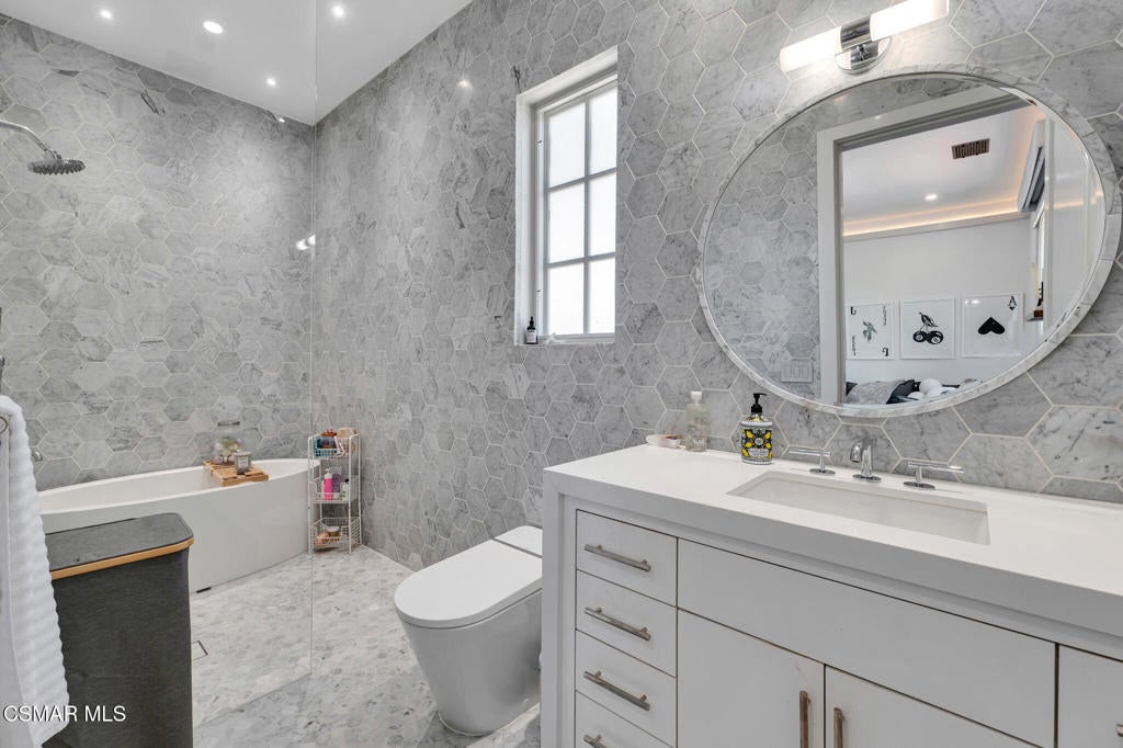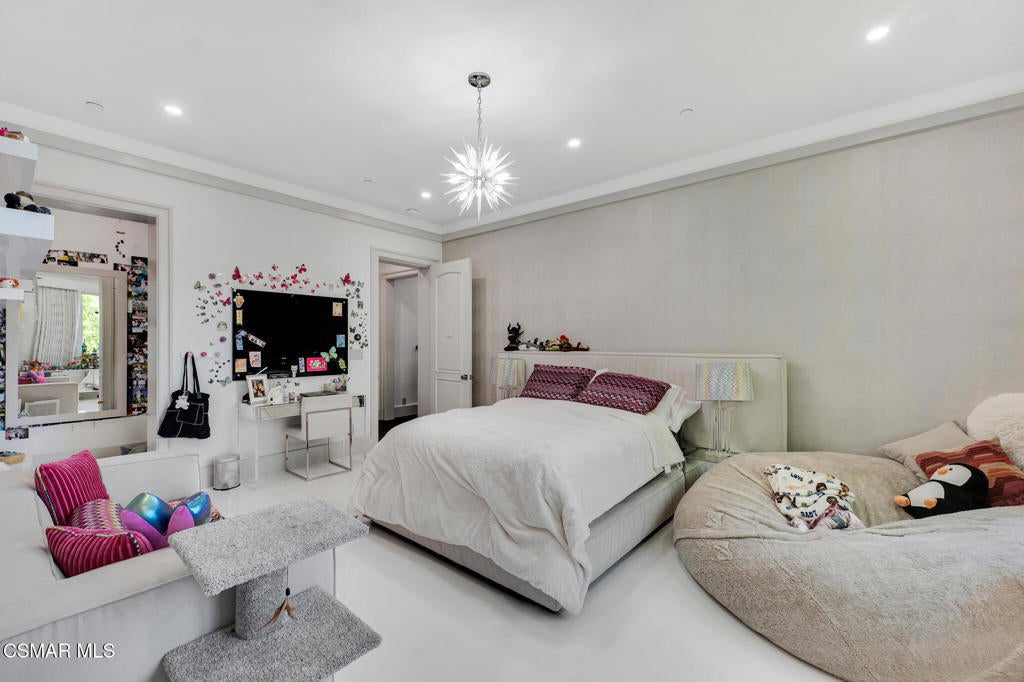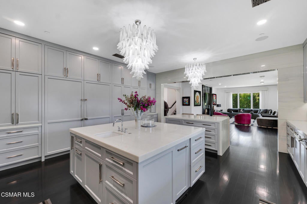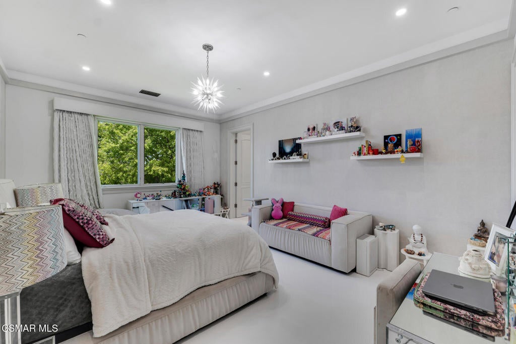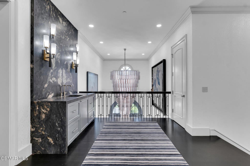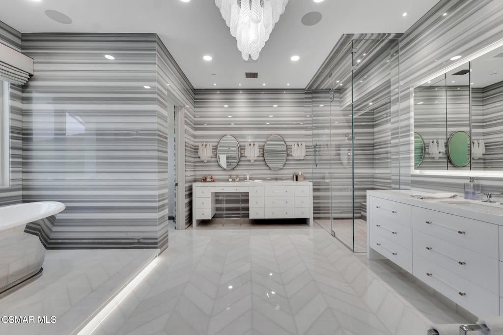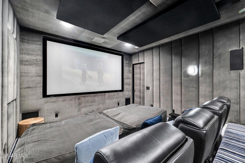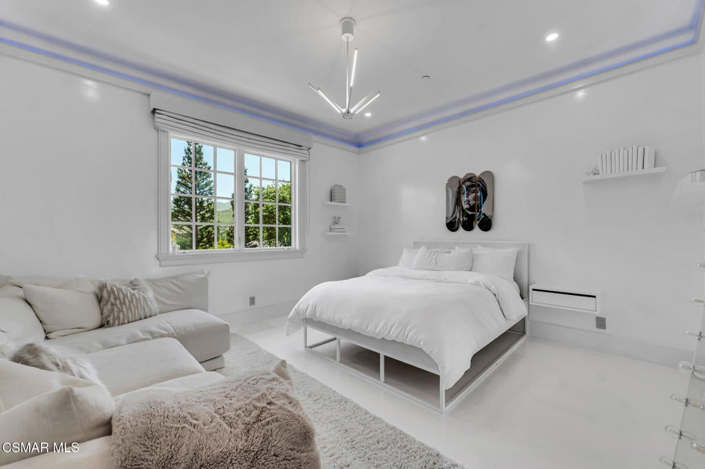 Incredible Price Change by -$1,500,000 !!!! One of the Most Stylish Homes in Sherwood - A True Masterpiece. Incredible one acre lot with total privacy on the Best cul de sac in Lake Sherwood.... This extraordinary residence is one of Sherwood's most elegantly appointed homes and must be seen to be fully appreciated. Exquisite, high-end finishes are found throughout, including Calcutta Manhattan gray marble, Black Diamond quartzite, Titanium quartzite with a leathered finish, Fantasy Blue quartzite, and Zebra Striato Olimpico marble in the primary bath. The gourmet kitchen features Japanese Nano glass surfaces and is complemented by imported Murano glass chandeliers from Italy.Backing to 56 acres of open space known as Dickens Patch, this home offers unmatched privacy, breathtaking finishes, and a lifestyle of luxury in a truly stunning setting.Designer elements include wall coverings and drapery fabrics by Christian Lacroix and Kelly Wearstler, elevating every space with curated sophistication.The thoughtful floor plan includes five luxurious en-suite bedrooms, a stunning powder room, a private office, and a state-of-the-art home theater designed and installed by Wilshire Media. An impressive professional bar and entertainment room enhances the home's exceptional appeal.Situated on one of Sherwood's rare, usable one-acre lots (combining two parcels), the property is designed for both privacy and outdoor enjoyment. The resort-style backyard includes a beautifully renovated pool and spa with a full retractable cover, expansive patio overhangs, generous lawn areas, and multiple entertaining spaces. There are two separate large 2 car garages.