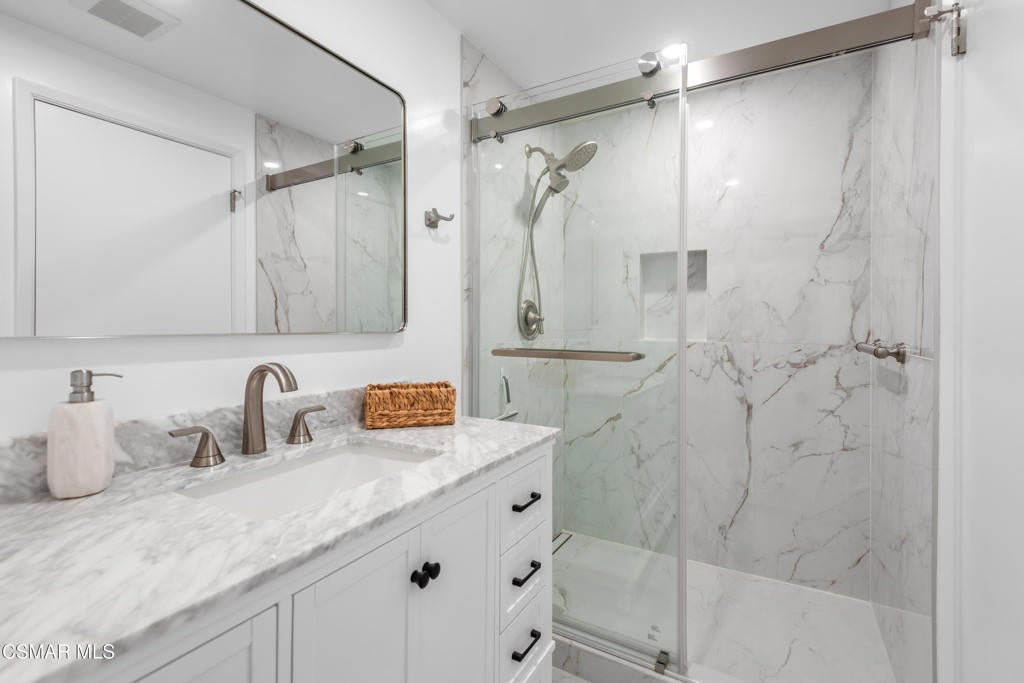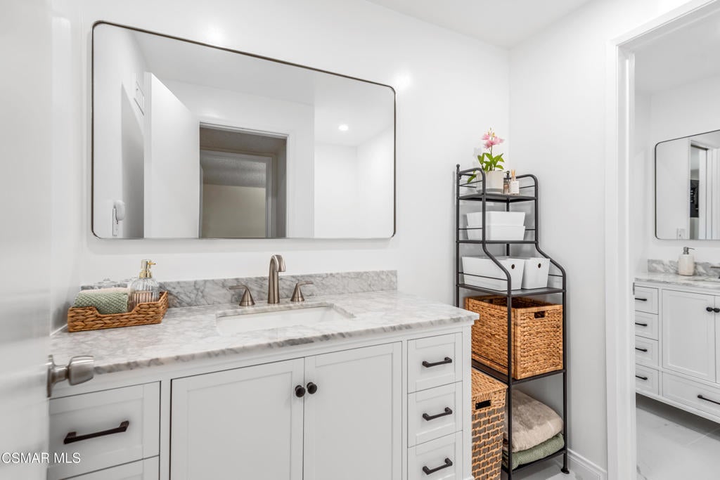 Highly desirable custom single story home located south of the boulevard in one of Woodland Hills premier neighborhoods! This custom 3+2 home features freshly painted interior & exterior, upgraded Milgard windows, and laminate wood-like plank flooring & refinished parquet wood flooring throughout. Beautifully remodeled bathrooms. Double front door entry with large foyer. Oversize Kitchen with white tile counters, lots of cabinets, stainless steel appliances including double oven and separate area for additional kitchen prepping, storage, sewing counter, etc. Kitchen opens to large family room. Huge living room with beautiful open vaulted beam ceilings, gas white brick fireplace and separate formal dining room. Large primary bedroom with lots of windows for backyard views, walk-In closet including built in organizer and beautifully remodeled ensuite bath includes marble-like tile shower/tub enclosure, wood vanity with white stone countertop and newer hardware & fixtures. Nice size secondary bedrooms and a beautifully remodeled Jack&Jill bath that features marble-like tile flooring, white vanity with marble countertops, large shower with marble/like tile & glass enclosure and newer hardware and fixtures. Indoor laundry area with lots of hall storage cabinets. Peaceful backyard with large concrete patio and neatly low maintenance landscaping. Gated side entrance for additional parking and a large grassy turf area .Newer oversize and insulated shed. 2 car covered carport with large storage cabinets. Tankless water heater. Home has a Clear Termite and Metro Retro Compliant. One of a kind custom home. Come make it yours!