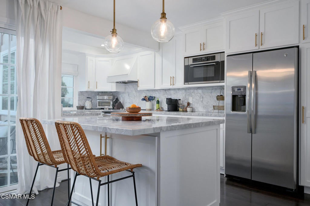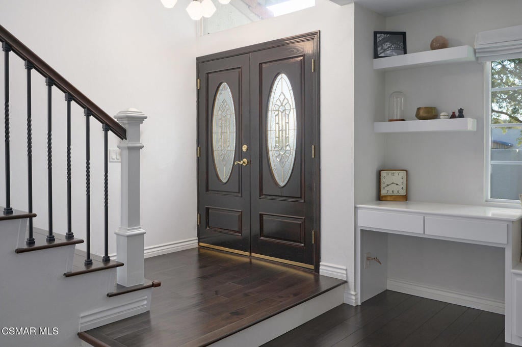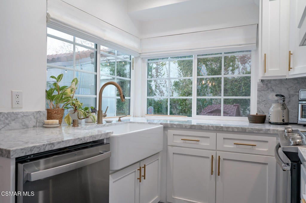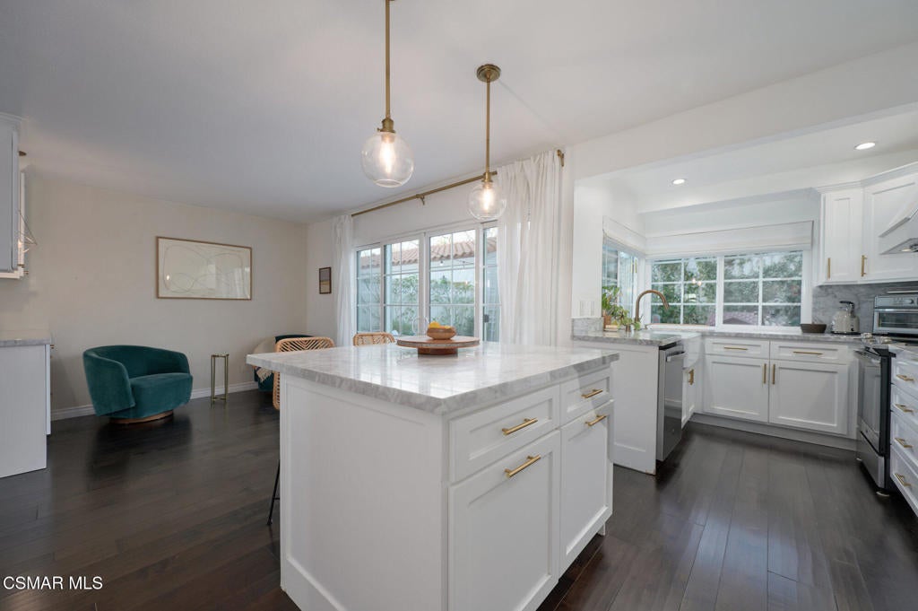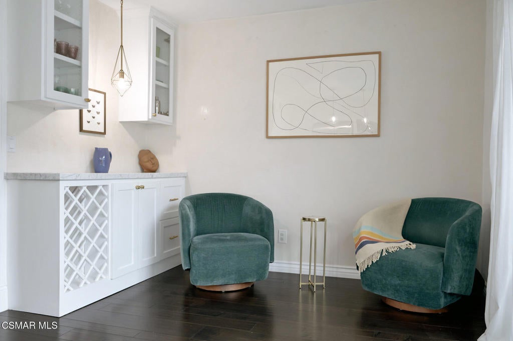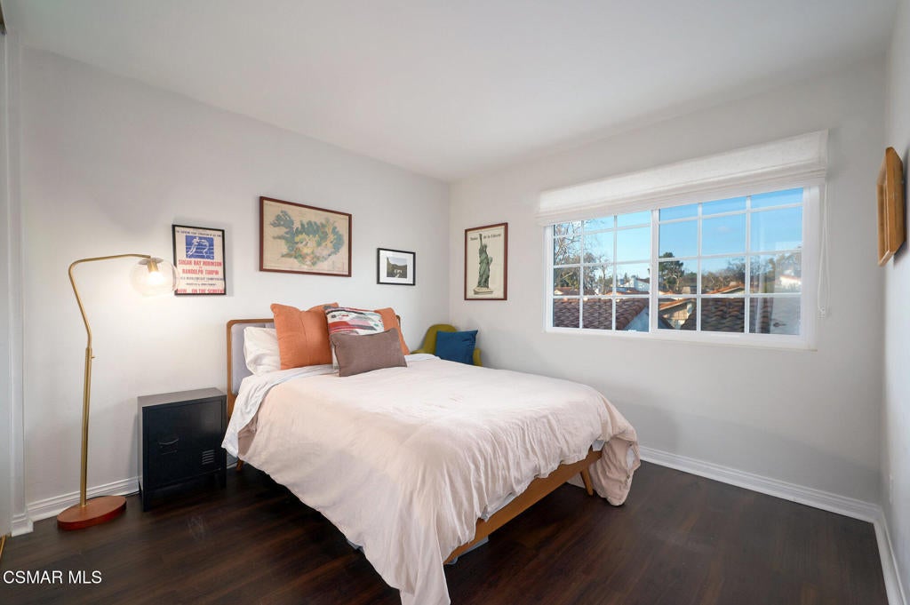 Stylish and remodeled, this light-filled Thousand Oaks East townhome offers sophisticated living, with everything you need close by. Enter through a large, gated front patio into a stylish main living space, featuring rich espresso-hued hardwood flooring, a sunny window seat, built-in desk, shelving and a cozy fireplace. A formal dining room flows seamlessly into the decorator perfect eat-in kitchen with crisp white cabinetry, marble counter-tops, stainless steel appliances and a center island with breakfast bar. An adjacent dry bar with a built-in wine rack enhances your entertaining. Enjoy al fresco dining on the private rear patio illuminated by twinkling overhead lights. There's a chic renovated powder room on the main level as well. Upstairs, the spacious primary suite impresses with vaulted ceiling, balcony and generously sized walk-in closet. En-suite bathroom with oversized vanity and tub/shower, plus 2 additional bedrooms and remodeled full shared bath. Large 2-car garage provides ample storage and the washer and dryer completes this attractive, move-in ready home. Sparkling community pool, tennis/pickle also. Available furnished or unfurnished. Ultra convenient to shopping, cafes, great dining, entertainment and services, excellent Conejo Unified schools, parks, playgrounds, miles of trails and a dog park are right down the street. Easy access to 23 & 101 Freeways.