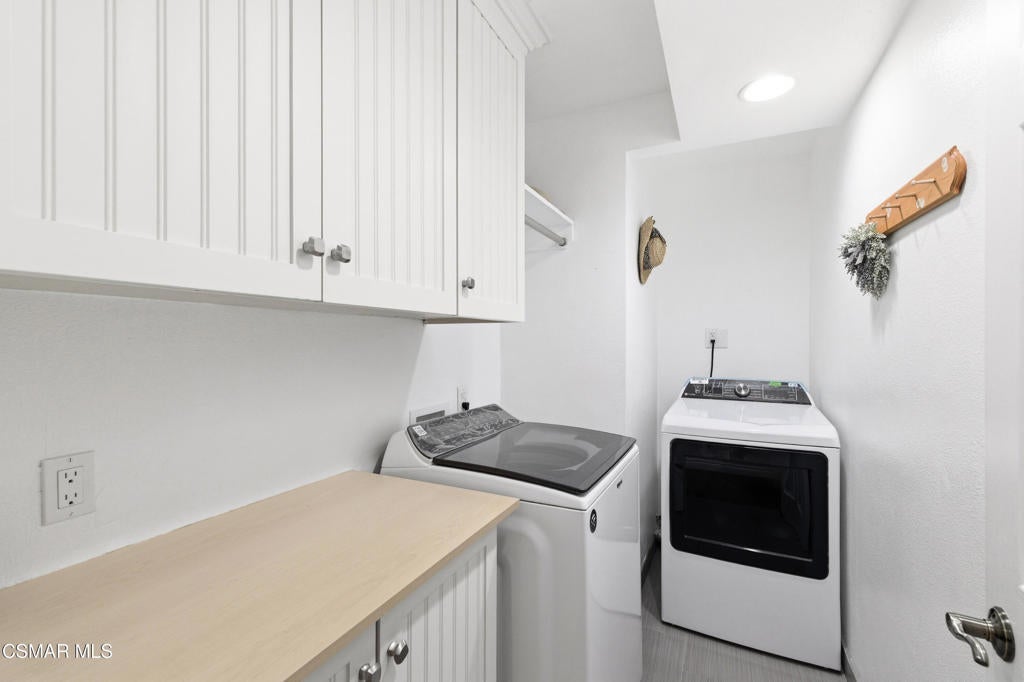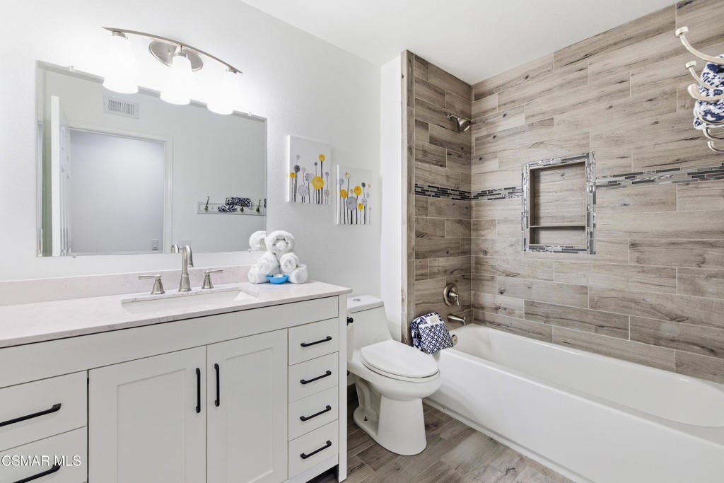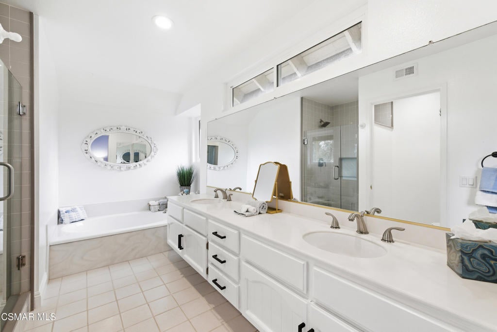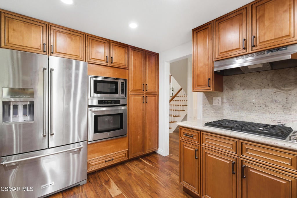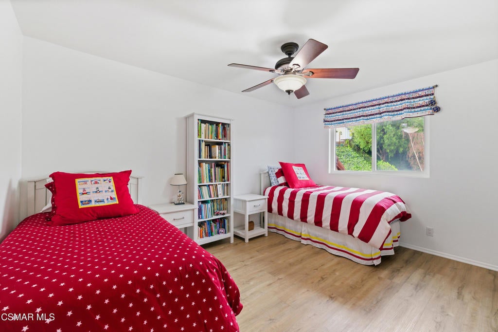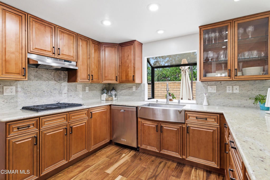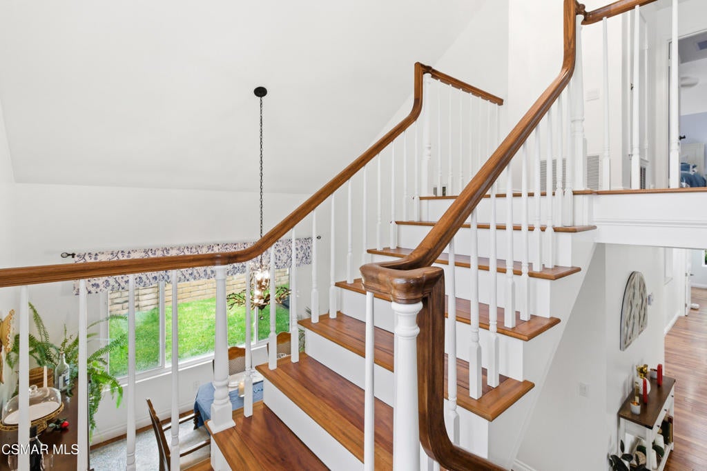 Welcome home to this beautifully upgraded 4-bedroom, 3.5-bathroom residence nestled in the heart of Newbury Park. Offering approximately 2,521 square feet of thoughtfully designed living space, this home blends comfort, functionality, and style. Step inside to soaring vaulted ceilings and an abundance of natural light that create a warm and inviting atmosphere. The open-concept floor plan features a formal living room, elegant dining area, and a spacious family room highlighted by a stunning stone fireplace. The kitchen is designed to impress with stainless steel appliances, a farmhouse sink, granite countertops, updated cabinetry, and generous storage and prep space--perfect for everyday living and entertaining alike. Additional main-level highlights include an indoor laundry room with added storage, a dedicated office with built-ins, and a convenient downstairs bedroom complete with a beautifully updated en-suite bathroom featuring a stone-tiled shower and modern vanity. Upstairs, you'll find two well-sized secondary bedrooms and a refreshed hall bathroom with a tiled shower-tub combination and updated vanity. The spacious primary suite offers a private seating area, walk-in closet, and a well-appointed bathroom with dual sinks, a soaking tub, and separate tiled shower. Situated on a private corner lot, the home features updated landscaping and inviting outdoor space. Additional amenities include hardwood flooring, dual-pane windows, fresh interior paint, a new stair railing, and a three-car garage. Ideally located close to schools, parks, and shopping, this exceptional home offers the perfect combination of location and lifestyle.