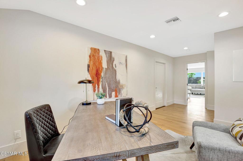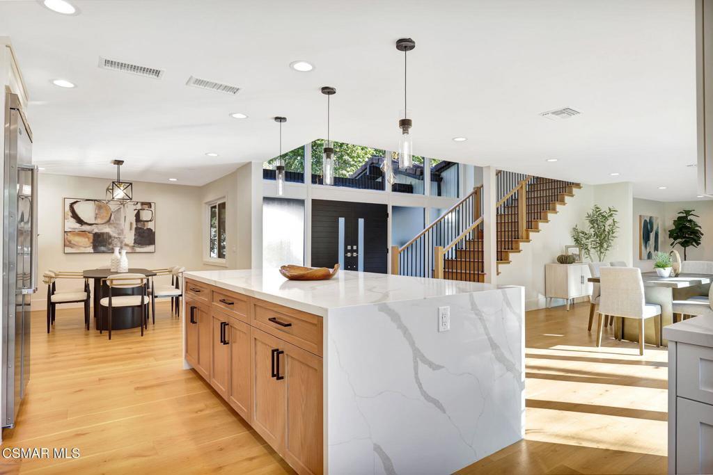 Step into this gorgeous, completely remodeled modern masterpiece located in the heart of Foxmoor, one of Westlake Village's most coveted neighborhoods. Situated on a peaceful cul-de-sac RIGHT NEXT to the greenbelt, this home has been fully upgraded from top to bottom with a fresh modern aesthetic and recreated to illustrate the California lifestyle, with seamless indoor-outdoor living and entertaining at its absolute best! As you approach, you are welcomed by the BRAND NEW charcoal paver driveway and walkway with lush green landscaping. The flooring in this home is European white oak engineered wood with wide 9'' planks and NEW custom cabinetry all throughout. The expansive entryway reveals soaring ceilings, a beautiful modern gold light chandelier, marvelous white oak staircase and a new open concept design. The exquisite designer kitchen is a chef's dream, boasting Vadara quartz countertops, high-end Viking appliances, and a massive island with waterfall edges. Harmonious indoor-outdoor entertaining awaits with spacious living and dining areas that open through bifold doors to a beautifully landscaped backyard. Completing the first floor is a full bath with a newly added standing shower, office and laundry room, leading into the finished garage with crisp epoxy floors. Upstairs you will love the spacious primary suite, plus three bedrooms, and secondary bathroom. The primary suite is equipped with vaulted ceilings, 2 large closets, a newly expanded and reimagined spa-like primary bathroom with a huge walk-in shower, double vanity and make-up station. Enjoy peace of mind with fully permitted upgrades to the electrical, plumbing, and HVAC systems. This home is just steps away from award-winning Westlake Elementary, with wonderful shopping and restaurants close by. Experience luxury living where no expense was spared. Welcome to your new home!