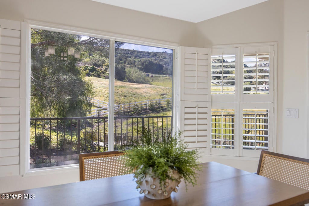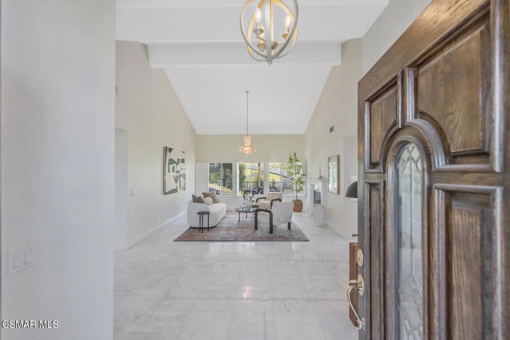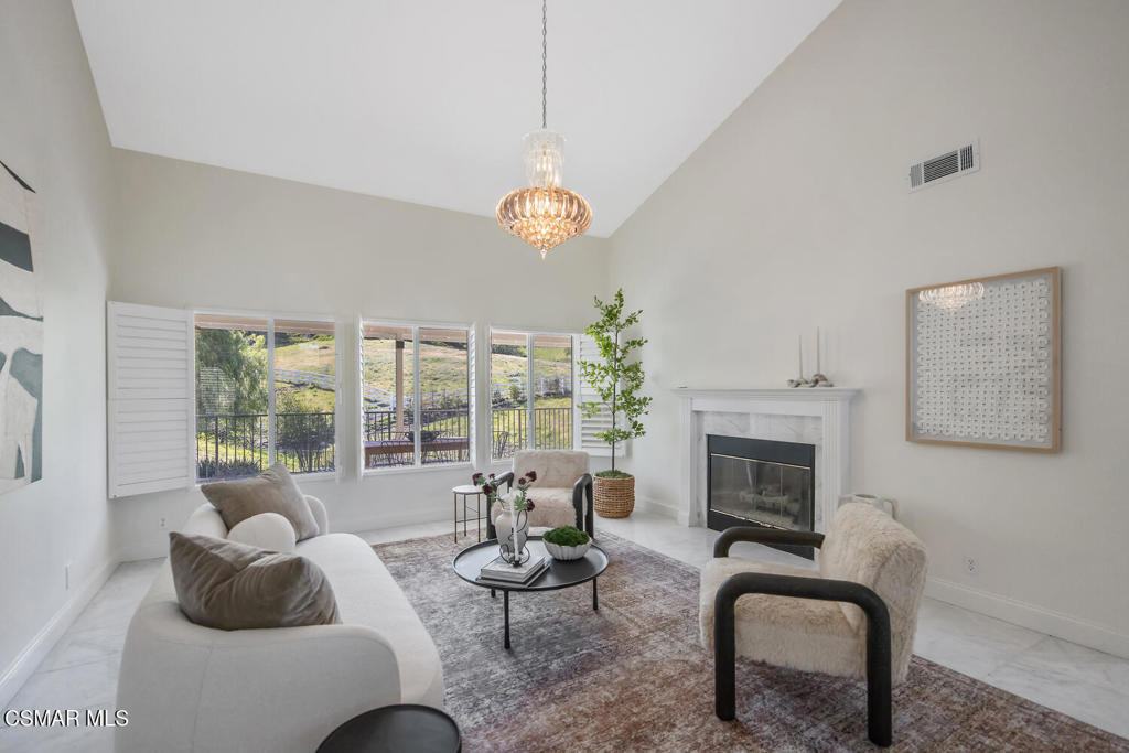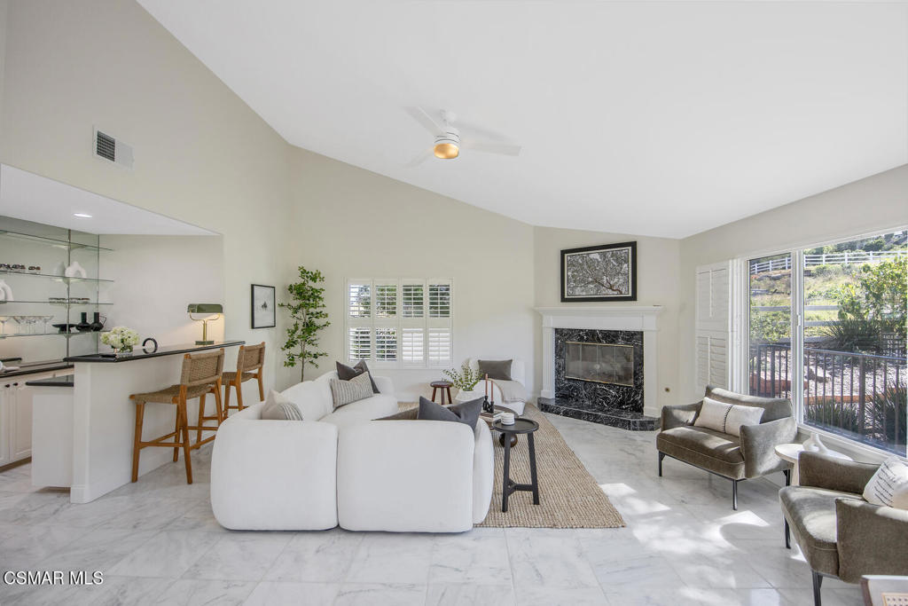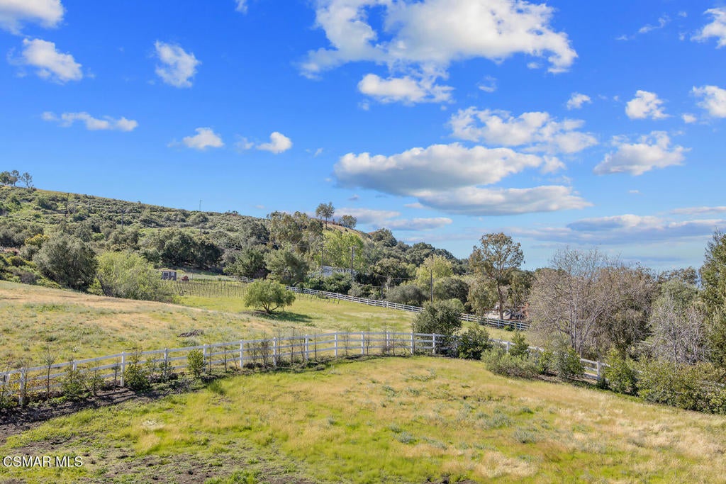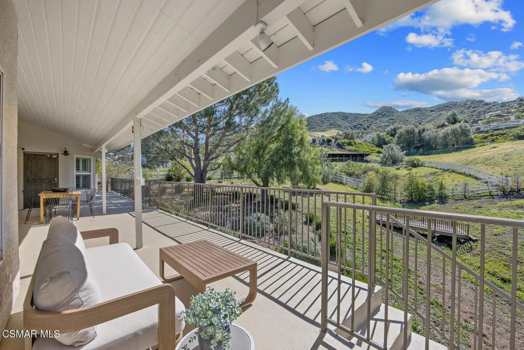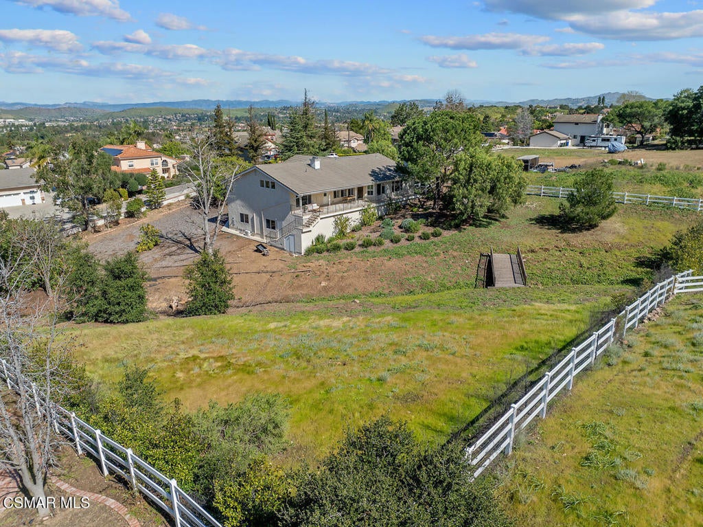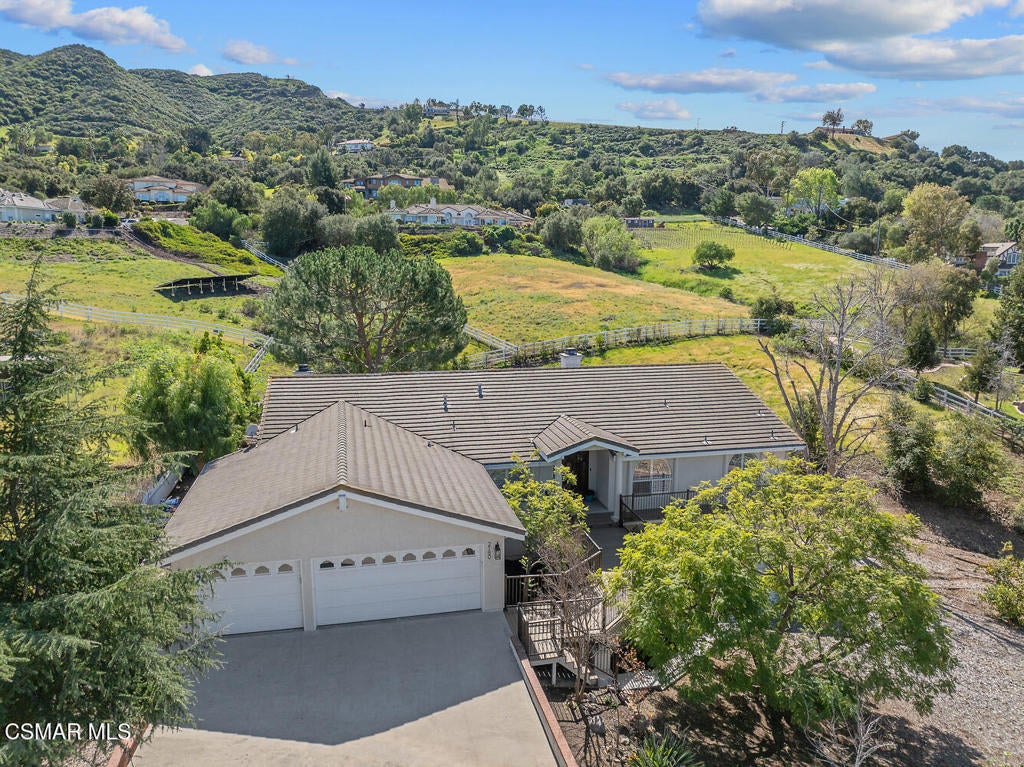 This ONE-STORY custom estate has VIEWS so spectacular they look like a painting. Sitting on a ONE ACRE lot with stunning pastoral and mountain views from almost every room, this one-of-a-kind home is beautiful, unique and private. Enter the spacious living room with soaring vaulted ceilings, a cozy fireplace, and a wall of windows looking right out onto those panoramic views. Enjoy your coffee in the morning or a glass of wine at sunset out on the wrap-around deck while you take in the views of the pastures, mature trees, lush landscaping, and even a charming bridge and a creek that runs through the backyard. This yard is so large there is room for up to two horses, a barn, a large pool, and/or an ADU. Plus, below the one-story home there is a HUGE 500 sq ft BONUS ROOM with a separate entrance. This bonus space has endless possibilities such as a guest room, office, art or music studio, or an ADU (granny flat). As an additional bonus, under the home there is also a huge additional enclosed storage area, and plenty of room for additions.The main home features beautiful real Carrara marble floors throughout, new designer lighting, and plantation shutters. Enjoy cooking in the large gourmet kitchen with a huge island, tons of cabinets, and granite countertops that are gorgeous and still contemporary. The kitchen opens to the sizeable great room with a fireplace, eating area, groovy bar for entertaining, and a door out to the patio looking out to the most beautiful scenes. The primary bedroom is a peaceful retreat complete with high ceilings, spectacular views, his and herswalk-in closets, and a large en-suite bathroom with dual vanities, stall shower, and a soaking tub. Generously sized secondary bedrooms are complemented by two additional bathrooms, offering comfort and flexibility for family and guestsalike. The brand-new wraparound deck/porch provides the perfect setting to take in the spectacular scenery of the surrounding mountains and evening lights, while an outdoor pergola with electricity creates an ideal space for relaxing, or hosting. This home also has a HUGE storage space underneath the home, and a new security system. With its unparalleled views, usable acreage, and seamless indoor-outdoor flow, this one-of-a-kind property delivers privacy, beauty, and exceptional versatility in a truly unforgettable setting.