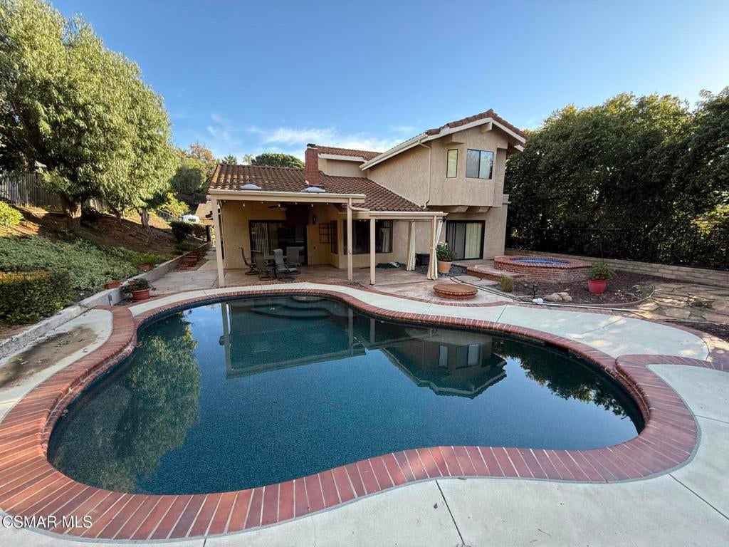 Great opportunity to own a one of a kind Moorpark pool home with no HOA! Its a fantastic residence for those seeking to accomodate multi-generational living with the amazing space it affords everyone. It has 5 bedrooms, 4 bathrooms, vaulted ceilings, a Large primary second floor retreat, with a cozy two sided fireplace into the large primary bathroom. There are 3 bedrooms downstairs, one of which could also be used as a primary bedroom with its own ensuite, that opens up to an amazing built in jacuzzi in the backyard. There is a spacious kitchen with breakfast nook, large island, granite countertops, plenty of cabinets, and opens up to a large family room. The spacious living room also has a double sided fireplace to family room, and both the living and family rooms open up to the beautiful back yard pool with sparkling pool that awaits. The large private backyard boasts a pool, spa, fire pit, covered patio, and is perfect for barbeques and entertaining. This home is a must see. It offers privacy, space, beauty, and is situated in a wonderful neighborhood, close to shopping and great schools.