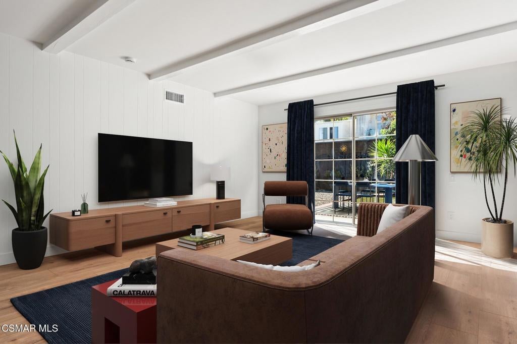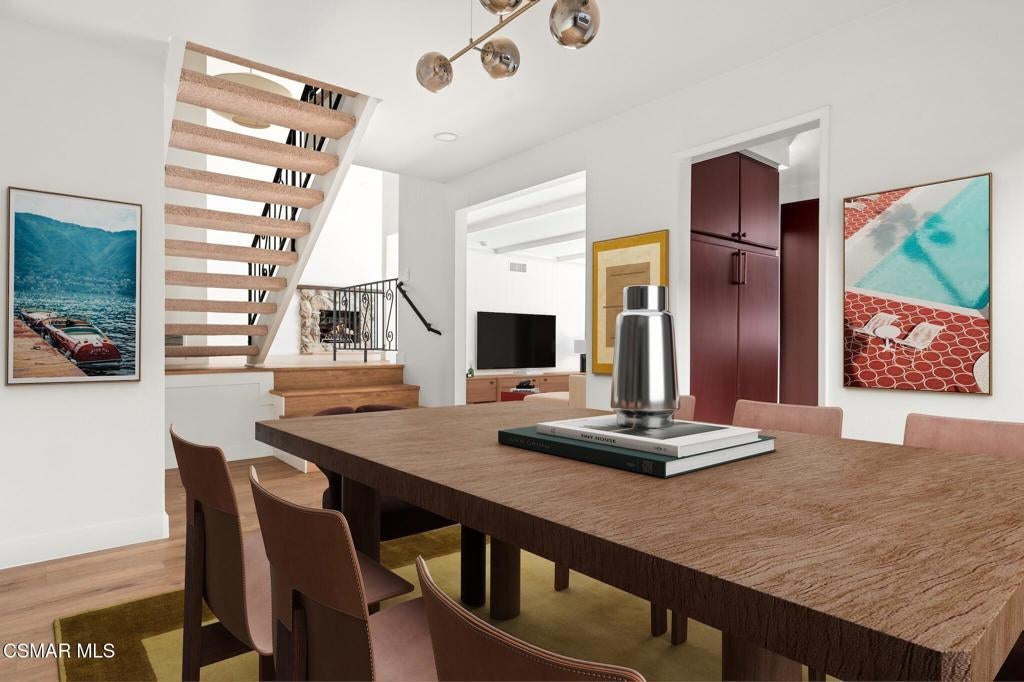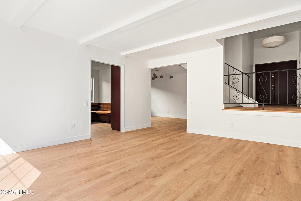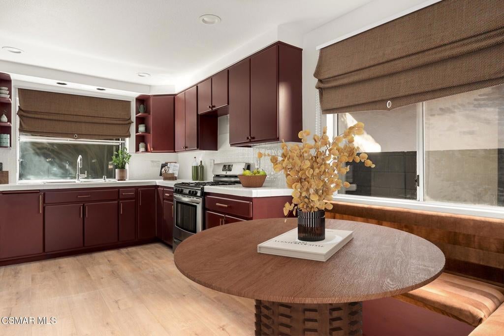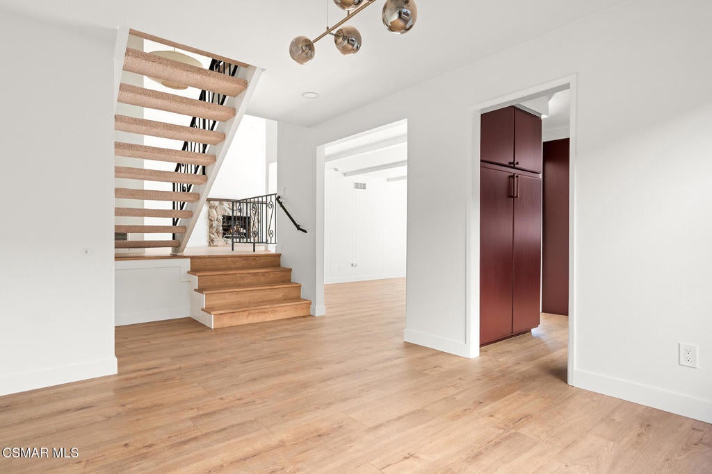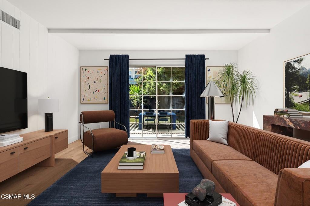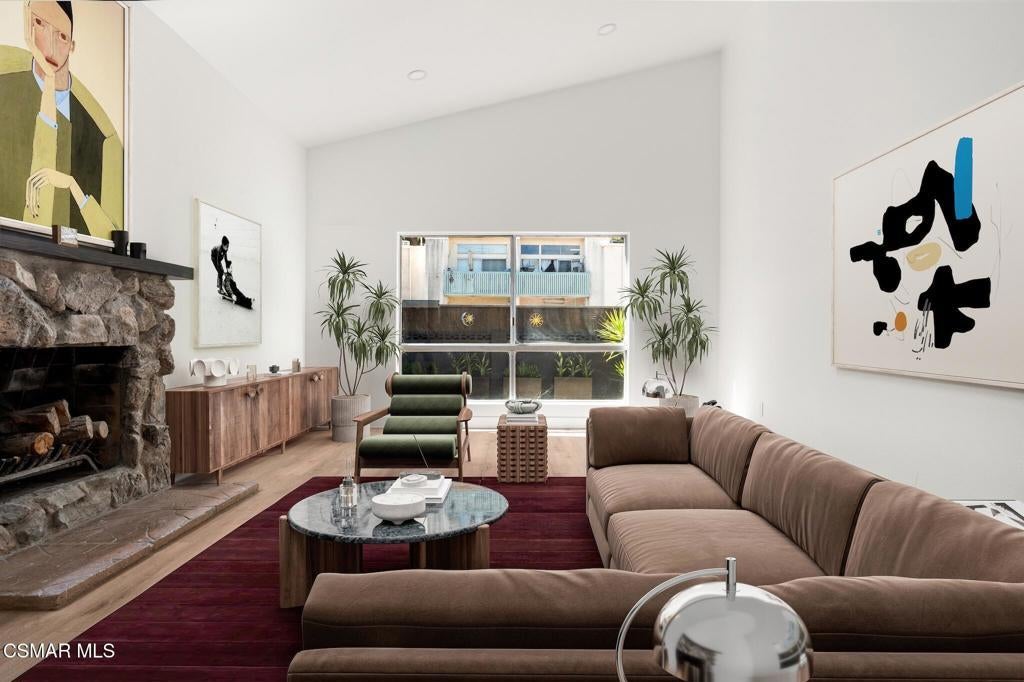 Tucked into one of Tarzana's most desirable neighborhoods, this fully transformed 4-bedroom, 3-bath home offers 2,273 square feet of thoughtfully updated living space--designed for real life, real gatherings, and the next chapter.From the moment you arrive, the deep navy mid-century exterior, chrome house numbers, and statement lighting set the tone. The double front doors open to soaring ceilings and dramatic West Elm lantern fixtures that immediately anchor the space with warmth and intention.Inside, the home unfolds with a clean, modern aesthetic layered over its natural 70's architecture. Acoustic ceilings have been smoothed. The entire interior and exterior have been freshly painted. New luxury European laminate flooring grounds the main living areas, while plush new carpet adds comfort upstairs. Modern baseboards run throughout the home, giving every room a crisp, finished feel. A brand-new roof and HVAC system bring peace of mind that goes far beyond cosmetics.The formal living room features high ceilings and a reimagined fireplace with a custom West Elm mantel--now a true focal point and an inviting place to gather. Recessed lighting brightens the space and enhances the open flow between living and dining.The kitchen blends function and personality. Freshly painted cabinetry with new wood hardware, a new sink, faucet, and dishwasher, and glazed countertops create a clean foundation. A custom-built bench upholstered in luxe fabric turns the dine-in area into the spot for weekday breakfasts, homework sessions, and casual dinners. Just beyond, the formal dining room--with its new statement fixture--is ready for holidays and celebrations.The layout offers flexibility that modern families need. A main-floor bedroom and full bath provide the perfect setup for guests, a home office, or extended family.Upstairs, you'll find the private sleeping quarters: the primary suite along with two additional bedrooms. All three bedrooms feature new carpet, modern baseboards, and high-tech ceiling fans with customizable settings and lighting temperature for personalized comfort. The result is simple, clean, and move-in ready--spaces that feel fresh now but flexible enough to evolve as life changes.All three bathrooms have been completely gutted and rebuilt with modern tile showers, updated vanities, new plumbing fixtures, and sleek sliding glass doors. The primary bath leans sophisticated with darker grout and elevated finishes. The hall bath brings a playful, youthful energy--fresh, functional, and designed with family living in mind.Step outside and the backyard delivers what so many families are looking for--usable space. A patio built for outdoor dining, a large shade tree that makes afternoons comfortable, and a versatile rock lounge area ideal for a fire pit, play space, or evening entertaining. Fresh planters and a newly painted block wall enclose the yard, creating privacy and warmth.Nearly every surface has been updated or replaced. The result is a clean, modern home that honors its mid-century roots while offering today's convenience. It's move-in ready, yet neutral enough to layer in your own art, furniture, and personality.This is the kind of home where birthday candles are blown out in the dining room, kids run between the family room and backyard, and friends linger long after dinner.In Tarzana, fully updated, with this kind of space and flow--it's not just a remodel. It's a reset.