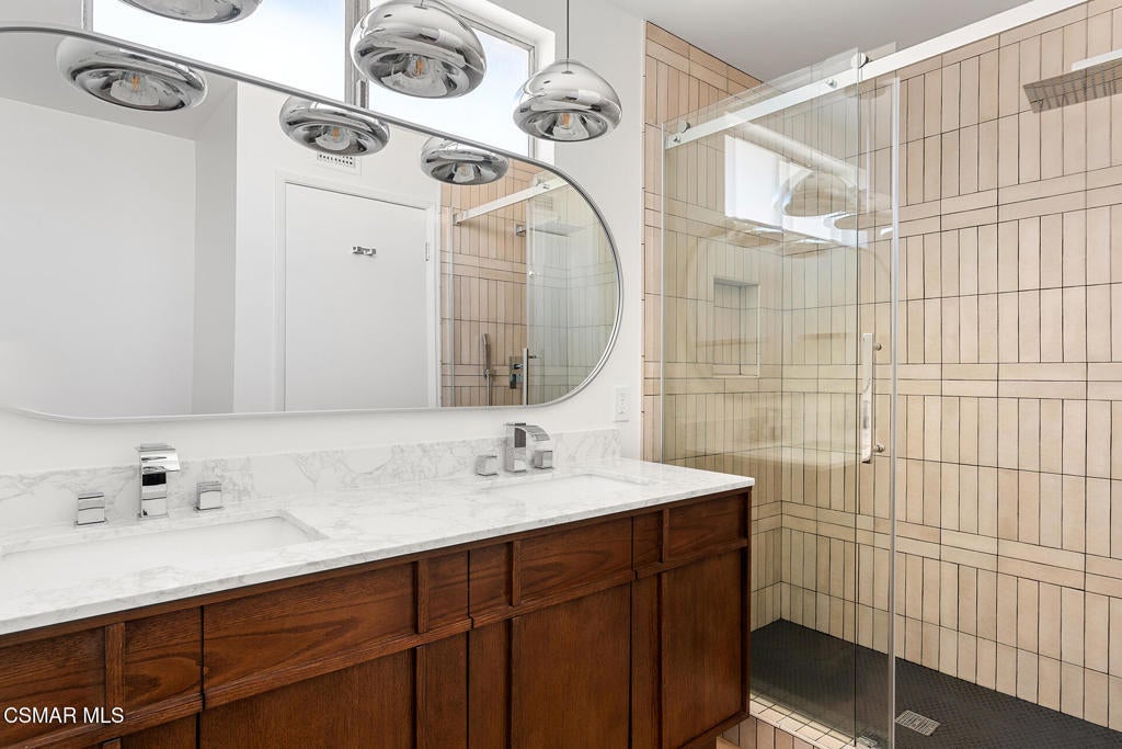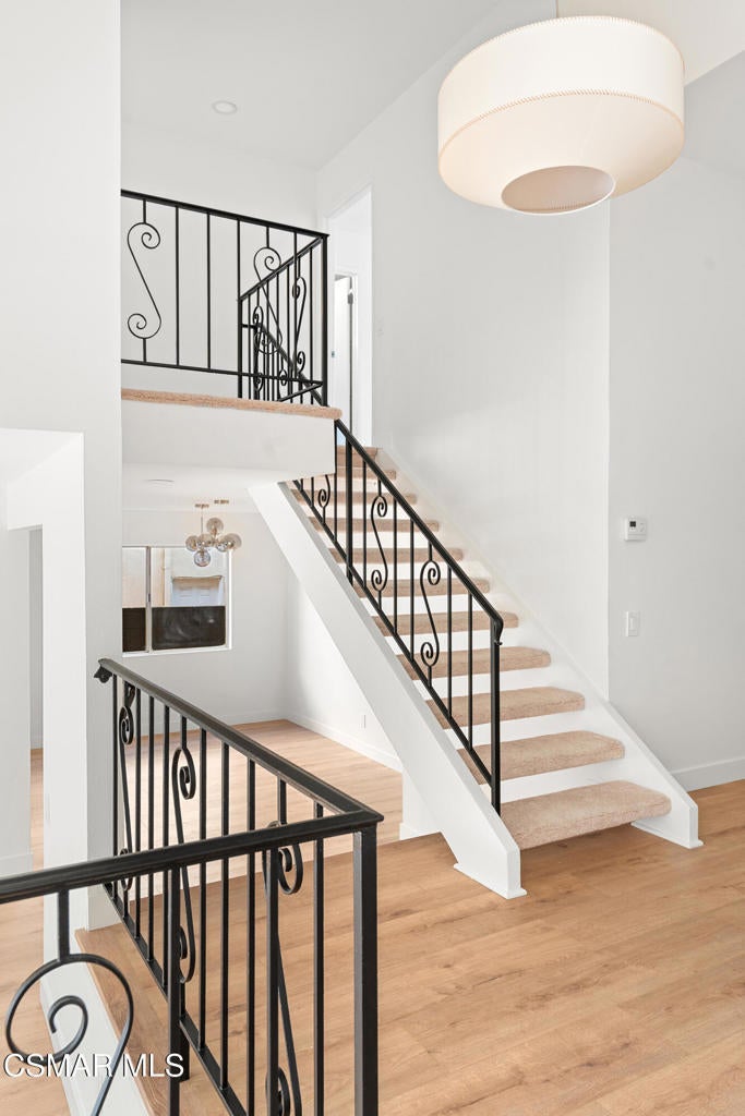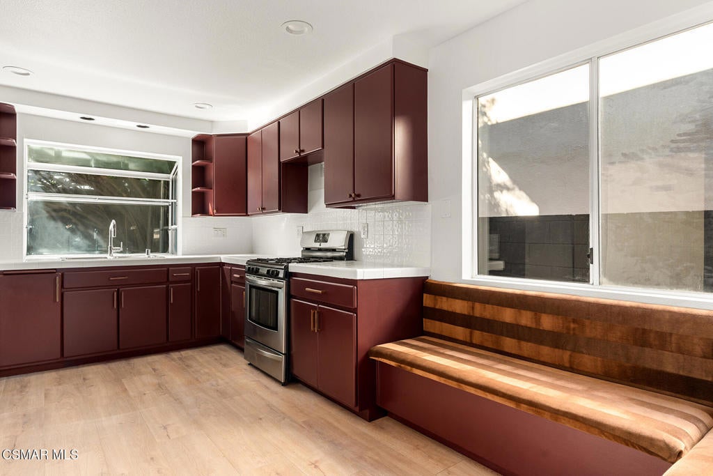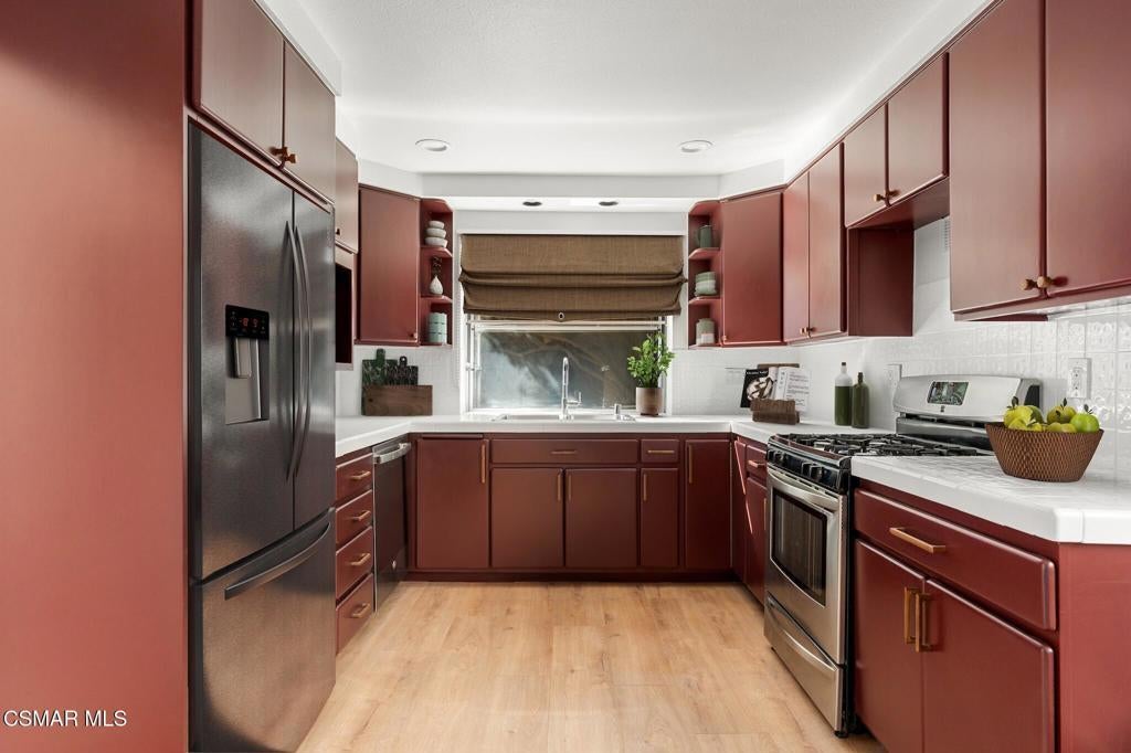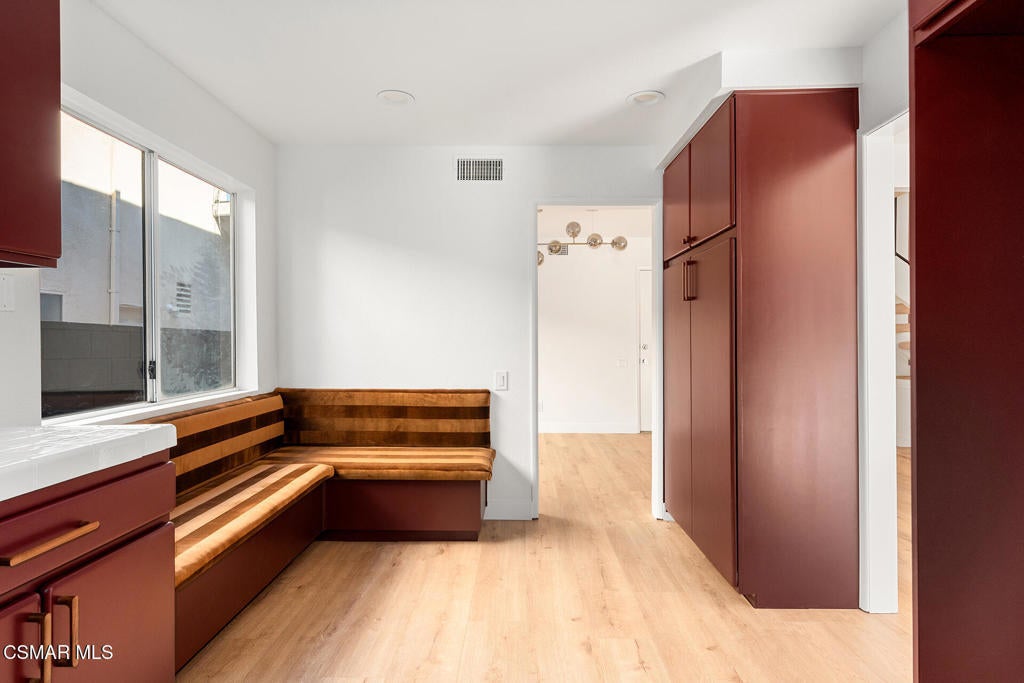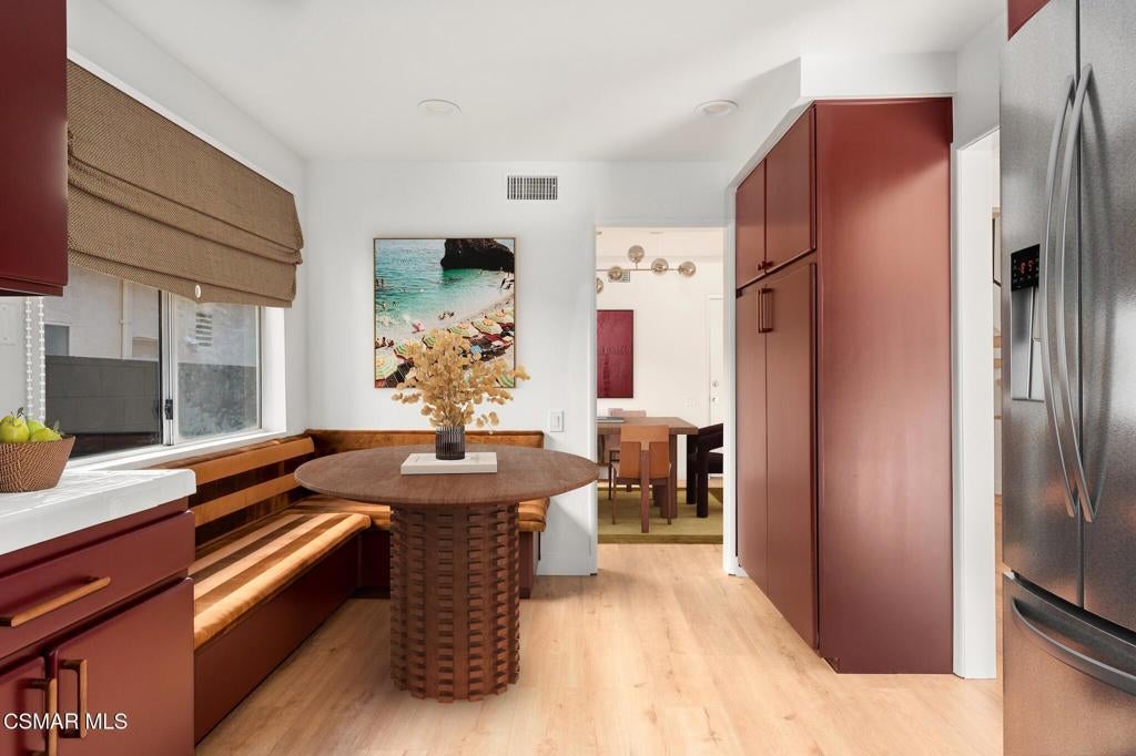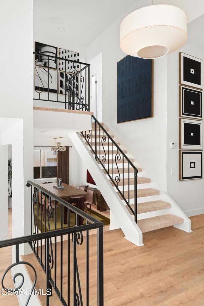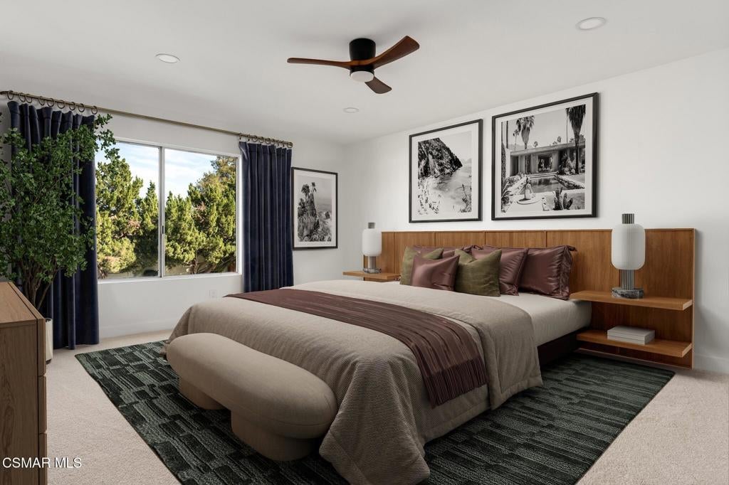 Tucked into one of Tarzana's most desirable neighborhoods, this fully transformed 4-bedroom, 3-bath home offers 2,273 square feet of thoughtfully updated living space--designed for real life, real gatherings, and the next chapter.From the moment you arrive, the deep navy mid-century exterior, chrome house numbers, and statement lighting set the tone. The double front doors open to soaring ceilings and dramatic West Elm lantern fixtures that immediately anchor the space with warmth and intention.Inside, the home unfolds with a clean, modern aesthetic layered over its natural 70's architecture. Acoustic ceilings have been smoothed. The entire interior and exterior have been freshly painted. New luxury European laminate flooring grounds the main living areas, while plush new carpet adds comfort upstairs. Modern baseboards run throughout the home, giving every room a crisp, finished feel. A brand-new roof and HVAC system bring peace of mind that goes far beyond cosmetics.The formal living room features high ceilings and a reimagined fireplace with a custom West Elm mantel--now a true focal point and an inviting place to gather. Recessed lighting brightens the space and enhances the open flow between living and dining.The kitchen blends function and personality. Freshly painted cabinetry with new wood hardware, a new sink, faucet, and dishwasher, and glazed countertops create a clean foundation. A custom-built bench upholstered in luxe fabric turns the dine-in area into the spot for weekday breakfasts, homework sessions, and casual dinners. Just beyond, the formal dining room--with its new statement fixture--is ready for holidays and celebrations.The layout offers flexibility that modern families need. A main-floor bedroom and full bath provide the perfect setup for guests, a home office, or extended family.Upstairs, you'll find the private sleeping quarters: the primary suite along with two additional bedrooms. All three bedrooms feature new carpet, modern baseboards, and high-tech ceiling fans with customizable settings and lighting temperature for personalized comfort. The result is simple, clean, and move-in ready--spaces that feel fresh now but flexible enough to evolve as life changes.All three bathrooms have been completely gutted and rebuilt with modern tile showers, updated vanities, new plumbing fixtures, and sleek sliding glass doors. The primary bath leans sophisticated with darker grout and elevated finishes. The hall bath brings a playful, youthful energy--fresh, functional, and designed with family living in mind.Step outside and the backyard delivers what so many families are looking for--usable space. A patio built for outdoor dining, a large shade tree that makes afternoons comfortable, and a versatile rock lounge area ideal for a fire pit, play space, or evening entertaining. Fresh planters and a newly painted block wall enclose the yard, creating privacy and warmth.Nearly every surface has been updated or replaced. The result is a clean, modern home that honors its mid-century roots while offering today's convenience. It's move-in ready, yet neutral enough to layer in your own art, furniture, and personality.This is the kind of home where birthday candles are blown out in the dining room, kids run between the family room and backyard, and friends linger long after dinner.In Tarzana, fully updated, with this kind of space and flow--it's not just a remodel. It's a reset.