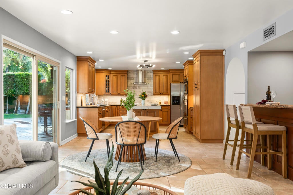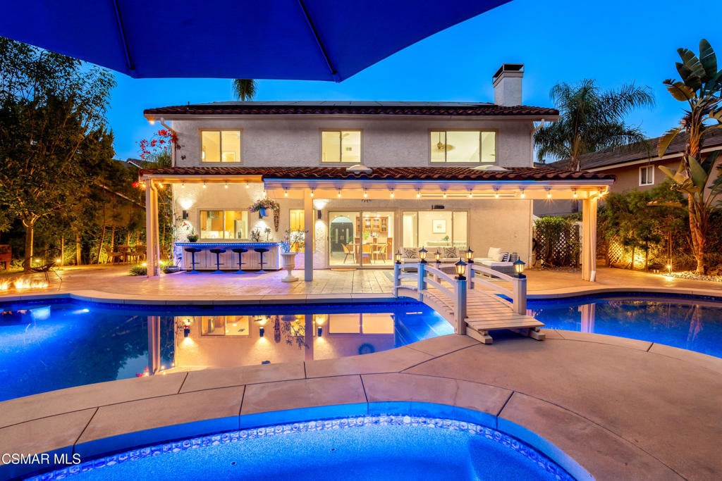 Looks can be deceiving... and this Newbury Park home proves it in the best way.From the street, it presents like a classic tract home. Step inside, and it quickly reveals itself as something entirely different. Thoughtfully upgraded, beautifully maintained, and full of unexpected moments, this home just keeps getting better the more you explore.The interior blends comfort with modern convenience. A spacious kitchen with a stunning quartzite island opens seamlessly to the family room, creating the perfect setting for everyday living and entertaining. Smart home features are integrated throughout, including a security system with smoke detectors, video doorbell, smart thermostat, wifi-enabled garage door, and a whole house water filtration system. Bathrooms have been tastefully updated, and fresh interior paint gives the home a clean, elevated feel.Upstairs, each bedroom captures serene mountain views, adding to the sense of privacy and retreat. And tucked away at the end of the hallway, a hidden bookcase door opens to a large bonus space. Whether you envision a fourth bedroom, office, studio, or game room, this flexible area adapts to your lifestyle.Then there's the backyard... and it truly steals the show.Set on a rare pie-shaped lot, the outdoor space opens up into one of the largest and most unique yards in the neighborhood. Designed for both relaxation and entertaining, it feels like your own private resort. A lagoon-style pool with an island spa and bridge creates a stunning focal point, complemented by upgraded lighting, and wifi-enabled controls. Two in-ground fire pits, an outdoor bar with honed marble counter, a dining patio with French doors, and an outdoor shower complete the experience. Mature landscaping, low voltage lighting, and mountain views create a setting that feels both peaceful and private, with ample space for future possibilities like an ADU.Additional highlights include fully paid solar, an upgraded electrical panel, Tesla charger, newer roof, and enhanced exterior finishes.This is a home that surprises you at every turn. Unique, functional, and designed for the way people actually live, it offers far more than meets the eye.