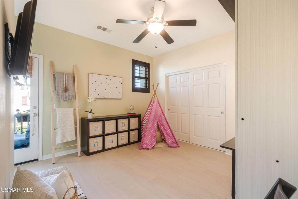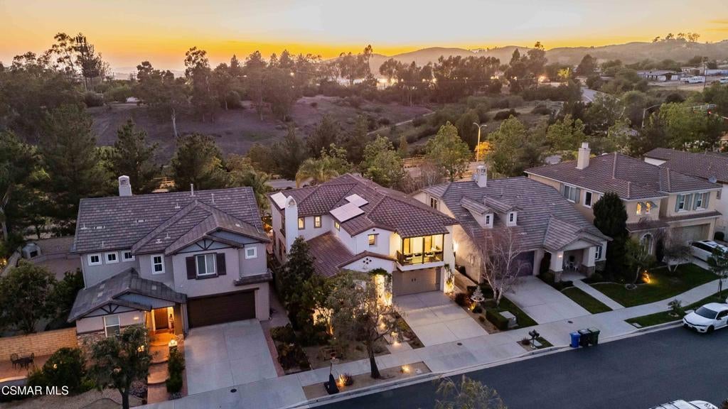 This exquisite home located in the gated Moorpark Highlands cul-de-sac community delivers enhanced privacy, breathtaking views, and a sun-drenched backyard oasis, perfect for relaxed entertaining or quiet retreats. Step inside to discover a meticulously updated residence with cutting-edge technology and downstairs office/bedroom with custom double doors. The freshly repainted exterior and new exterior light fixtures create outstanding curb appeal, while hardwood floors, and custom 4.5 inch basswood plantation shutters stained to match, deliver sophisticated warmth and seamless flow. The chef-inspired kitchen is a true showstopper, featuring stunning Quartzite countertops, an upgraded sink and faucets, elegant backsplash, a convenient pot hanger, custom light fixtures, and a reverse osmosis system servicing the sink and fridge. Prepare gourmet meals with ease using the impressive array of three GE Profile ovens (including one convection, one regular, and a 240V convection oven/microwave combo Adventium). Energy-efficient whole-house warm LED lighting, and automated bathroom light sensors enhance everyday comfort. The large primary bedroom has a sitting area which could be a gym/office/yoga retreat. The primary bath offers dual vanities, beautiful wood cabinets, walk-in closet, sunken tub, and walk-in shower. The three guest bedrooms are well appointed with custom paint/decals and the front bedrooms share a balcony! Upstairs laundry conveniently located with storage. Embracing modern sustainability and smart living, this home boasts PAID Tesla Solar for the entire house, a Tesla Powerwall in the garage, and two EV charging outlets for effortless electric vehicle ownership. Additionally, the 3-car tandem garage offers flexibility for parking or utilizing the additional space for storage, a home gym, or more! A whole-home water softener, low-flow showerheads and faucet aerators promote efficiency, while the internet-connected Rachio smart sprinkler system with climate prediction optimizes water use. Dual HVAC systems ensure zoned comfort on each floor. Seamless Alexa-enabled whole-home smart automation integrates thermostat, sprinklers, lights, door and garage door control, complemented by a Z-Wave compatible smart door lock and video doorbell. A fully monitored alarm system includes intruder alerts, integrated smoke/fire detection, camera wiring, and door sensors for peace of mind. LAN wiring throughout supports robust connectivity. Additional highlights include a custom-built stamped concrete patio, custom fire pit, and custom modern lighted stairs in the front yard. Enjoy a cozy backyard oasis with outdoor kitchen, a stainless-steel, maintenance-free patio cover, and low-maintenance landscaping, including a drought-tolerant front yard and artificial turf in the rear garden with deodorizer that is ideal for babies and pets while reducing odors for a fresher yard. An array of fruit trees and plants cover the exterior: Magnolia Trees, Champaca Tree (rare), Queen Palms, Phoenix Robolini, Meyer Lemon Tree, Orange Tree, Lime Tree, Apple Tree (varieties), Passion Fruit, Blackberries, Dragon Fruit, Blueberries (varieties), Pineapple Guava Tree, Lavender, Aloe Vera and Rosemary. This turnkey smart home combines luxurious finishes, private entertaining, and effortless automation. Community features include: hiking trails, 2 pools, playground, greenbelts, stroll or bike to Mammoth Highlands Park and more!