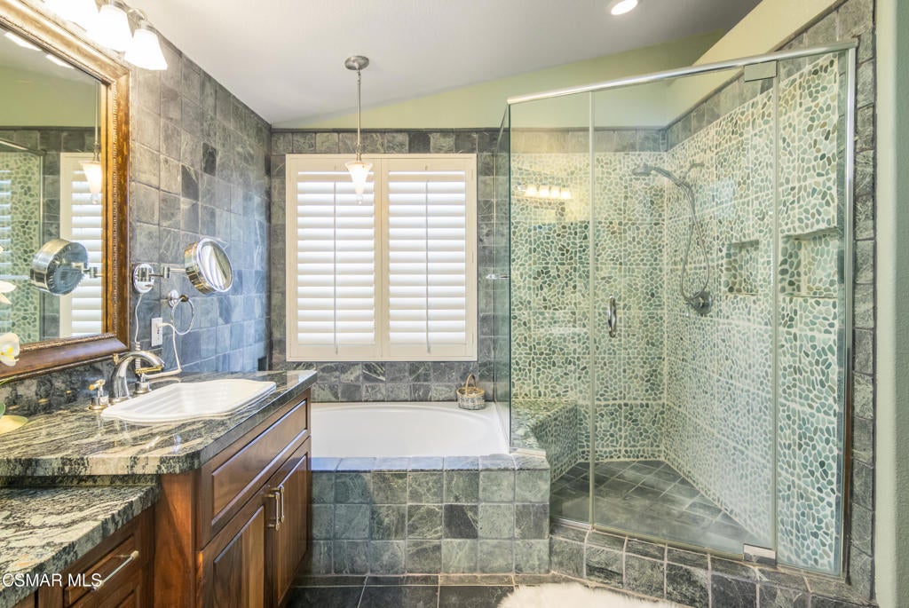 Welcome home...Prepare to be wowed by this highly desirable two-story Greystone pool home with no HOA. Breathtaking Panoramic hilltop mountain views. Large professionally landscaped home site with a sparkling pebble tech pool and spa and enough side yard space for RV parking. A very scenic and private setting featuring tropical palm trees, fruit and olive trees, and multiple colorful roses. Stamped concrete and Slate stone ribboned walkways leading up to the upgraded custom oak and glass front door complete with a gas fire pit arear and patio to enjoy beautiful sunsets and the evening breeze. Across the street, in the open space, you will see and hear the occasional seasonal waterfall and the gentle sound of cascading water, directly across from the residence. This contemporary style Mediterranean stucco home features custom paint inside and out with four bedrooms and three baths and 3 Car Garage. Upon entering the stylish chandelier and marble floored foyer, a warm and inviting living room with grand staircase and dining room with soaring 18 foot cathedral ceilings, awaits. Plantation shutters and hardwood flooring throughout the lower level. The kitchen offers a walk-in custom pantry, all newer stainless-steel appliances, granite countertops and backsplash. The kitchen overlooks lovely views of the backyard containing a Pentair heated pebble Tech pool and spa with a lagoon like backyard setting.The Kitchen is just off the dining area and opens to the family room with a gas fireplace and stone surround. The main floor also includes a guest bedroom/Den, which can be converted into a home office or an ideal mother-in-law suite if a closet was installed. Also, a guest bath features a stall shower, marble floors, granite countertop with a vessel glass sink.Just upstairs is a large Primary Suite with vaulted ceilings, large private balcony with views of the pool area and neighborhood, two walk in closets with built in shelving, beautiful rich wood cabinetry with granite countertops and separate deep, soaking tub, custom stone surround stall shower with glass enclosure along with natural slate flooring. The remaining 2 large additional upstairs bedrooms, featuring plush carpeting, rich paint tones and plantation shutters along with built-in closet organizers. Also, upstairs is a hall bath with tile floors, shower over tub combination and single sink vanity. You will love entertaining in the rear yard with family and friends. Enjoy your backyard oasis containing the private pool and spa, three tumbling spillway waterfalls into the pool, with covered patio and open seating area to enjoy. This is a fantastic location, close to schools, shopping, restaurants, parks and golf courses. There is something for the whole family to enjoy. This home exudes pride of ownership at every turn, and is a must see. This home was 'Virtually Staged' for pictures. The picture showing the kitchen with white cabinets which was Virtually painted to give potential buyers an idea of what it could look like. Call today for your private showing.