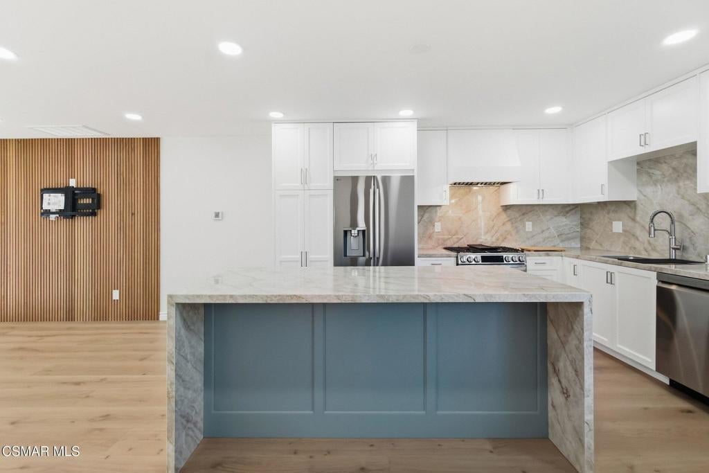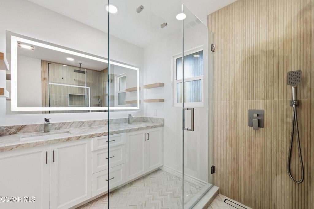Deluxe Single-Level End-Unit with additional Kitchen/ living room added in the garage! Welcome to this rare offering of two freshly renovated, single-level end-unit condo with two private entries, 2 kitchens, dual heating and air, dual laundry, and 2 bathrooms. Thoughtfully designed with spectacular open floor plans, this residences features expansive living spaces filled with natural light. The main kitchen is a showpiece, boasting a massive quartz island, all-new cabinetry, top-of-the-line appliances, and a walk-in pantry. It flows seamlessly into the spacious living room perfect for entertaining. The main bathroom is a true retreat, complete with a large double vanity, light-up mirror, frameless walk-in shower, and rain shower head with handheld wand. Two additional spacious bedrooms complete this side of the home. The second kitchen offers ample counter space, quartz countertops, a large single-basin sink, and new appliances. It opens to its own generous living area and includes a beautifully remodeled bathroom with a walk-in shower and rain shower head/wand, plus two more bedrooms and a personal stackable laundry. Additional highlights include: All-new flooring throughout Custom blinds, including automatic sliding blinds for the sliding glass doors, fresh paint, updated lighting, and modern plumbing fixtures Enjoy resort-style amenities with a community pool, clubhouse, and 9-hole golf course. All of this, just minutes from shopping, Ventura Harbor, and the beach!