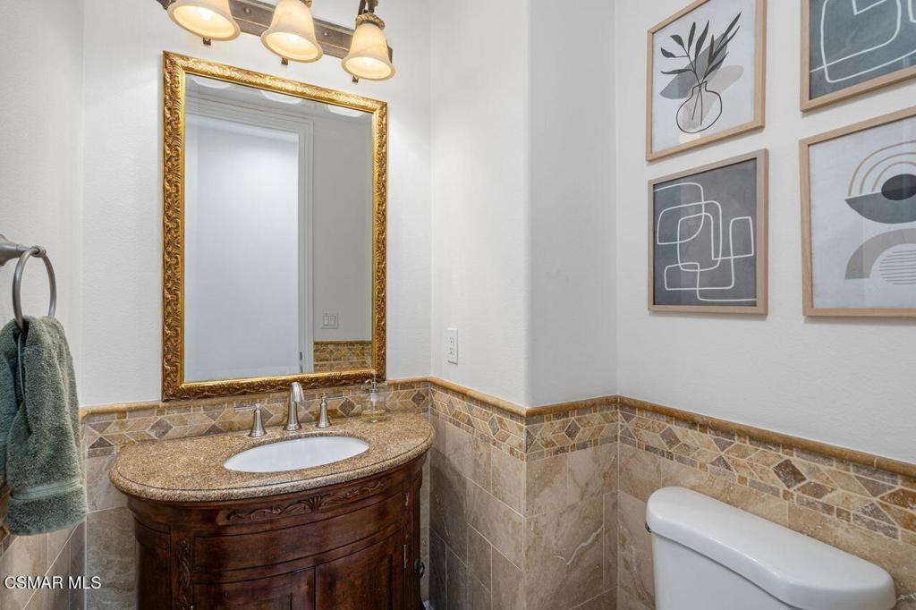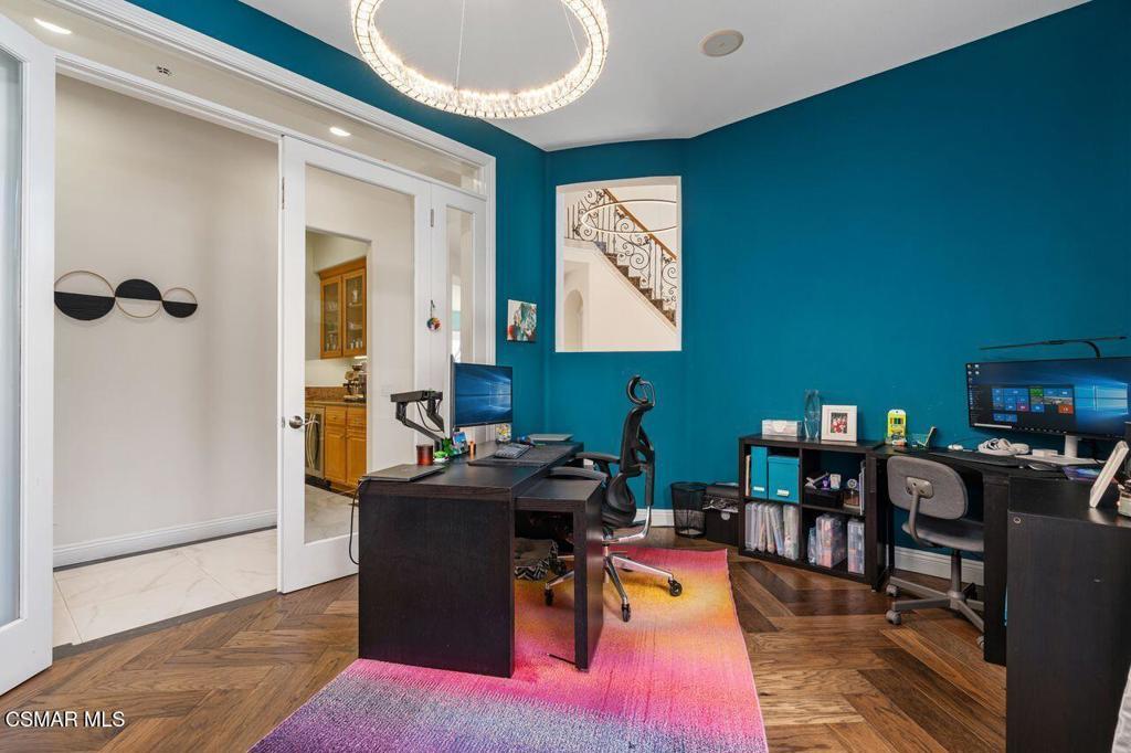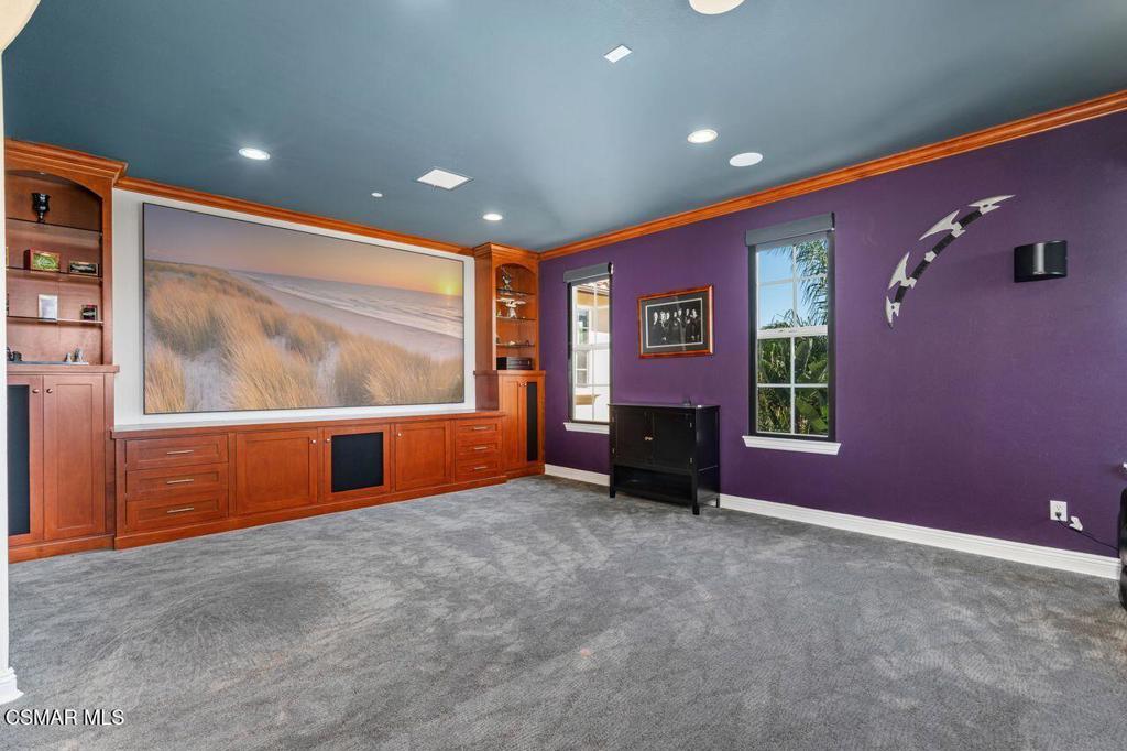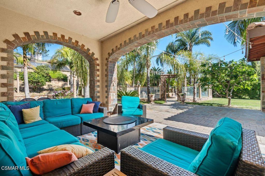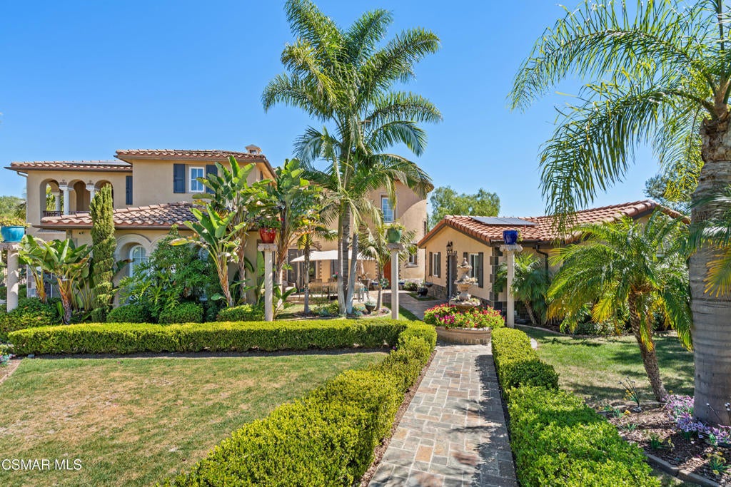 Resort-Style Mediterranean Ranch Living in the Heart of Camarillo. Experience the ease of California luxury in this beautifully appointed Mediterranean estate, where timeless architecture and relaxed indoor-outdoor living come together in a private, resort-inspired setting. From the moment you arrive, the home's clay tile rooflines, and graceful arched entry set a tone of understated elegance and warmth. Step inside to a dramatic two-story foyer, where a sweeping curved staircase with wrought-iron detailing frames the space, and intricate travertine medallion flooring makes an unforgettable first impression. Natural light pours through the home, highlighting soaring ceilings, refined finishes, and a seamless flow between formal and casual living areas designed for both entertaining and everyday comfort. At the heart of the home, the chef's kitchen blends functionality with style and features rich wood cabinetry, granite countertops, stainless steel appliances, and a generous center island perfect for gathering. Multiple living spaces offer flexibility and comfort, while a dedicated home theater/media room with custom built-ins creates the ultimate setting for movie nights and relaxed evenings in. Outdoors, the property truly shines as a private retreat. A resort-style, free-formed pool is surrounded by terracotta paver decking, and a poolside bathroom/dressing room, evoking a boutique hotel ambiance. The covered patio, framed by decorative brick, invites al fresco dining and year-round enjoyment, all set against a backdrop of mature tropical landscaping, including stately king and fan palms and meticulously manicured grounds. Private Guest House Retreat: Adding exceptional versatility, the detached guest house mirrors the main residence in both architectural charm and quality. Featuring one bedroom, one bath, in-unit laundry, and its own private patio, this self-contained space offers comfort and independence for extended family, guests, or potential rental income. With its cohesive Mediterranean styling--cream stucco exterior, clay tile accents, dark shutters, and terracotta paver details--it feels like a natural extension of the estate while maintaining its own sense of privacy. A rare offering that blends elegance, comfort, and flexibility, this Camarillo property captures the essence of refined Southern California living.