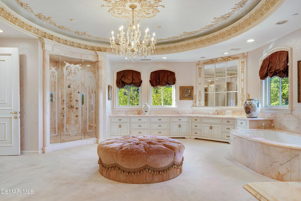 As featured in Robb Report & Los Angeles Times, Chateau Plaisance, a CASTLE nestled within the prestigious 24/7 guard gated Sherwood Country Club, spans nearly 3 private acres across 5 lots, offering breathtaking views of the spectacular Santa Monica Mountains and the renowned Jack Nicklaus Signature Golf Course. Perfected in every detail, this approx. 14,113-square-foot French-inspired masterpiece showcases unparalleled artisanship and timeless elegance.The Castle's park-like grounds are a true masterpiece, featuring formal box-hedged gardens filled with thousands of roses, lush lawns adorned with life-sized statuary, and cobblestone pathways leading to a striking 52-foot reflection pond where bronze horses appear to gallop through cascading water. A serene large infinity pool and spa with a waterfall, a koi pond, and an ornate iron gazebo overlooking the valley complete this enchanting outdoor retreat.A grand entrance welcomes you into the rotunda, where a dazzling Baccarat chandelier, hand-painted murals, and a sweeping marble staircase with a gold-leafed iron banister set the tone for the opulence within. The 22-foot-high Grand Salon & Ballroom boasts two Spanish brass and crystal chandeliers, a carved fireplace, and towering windows that frame the gardens. An elevated alcove provides the perfect stage for entertainment.The richly paneled library, complete with parquet flooring, a fireplace, and a hidden bar, offers a cozy escape, while the formal dining room, seating 20, is illuminated by two custom Waterford chandeliers. The gourmet kitchen, adorned with antiqued cabinetry, parquet flooring, four subzero refrigerators, and two oversized islands, opens to a warm and inviting family room featuring a grand fireplace, elegant window seating, and a granite-topped bar.The second floor offers a luxurious primary suite with a sitting area, fireplace, a sleek wet bar, and two lavish spa-inspired baths with oversized closets. Additional guest suites, a Carriage House apartment, and a hidden third-floor bonus space provide ample accommodations. The completed third floor features four separate rooms, providing endless possibilities for a home theater, gym, art studio, or private retreat.This Castle also includes a Pool House--a Mini Chateau with a great room, grand fireplace, kitchen, and two bathrooms, perfect for poolside entertaining. Two gated entrances lead to an elegant courtyard with an imported French fountain, while a separate guest parking area and the Grand Plaza can accommodate up to 150 guests.Gated guest parking is conveniently located near the charming greenhouse and the elegant archway leading to the Grand Plaza, designed to accommodate approximately 150 guests with ease. Chateau Plaisance Castle stands as a pinnacle of luxury, privacy, and grandeur--an estate unlike any other to ever grace the market.