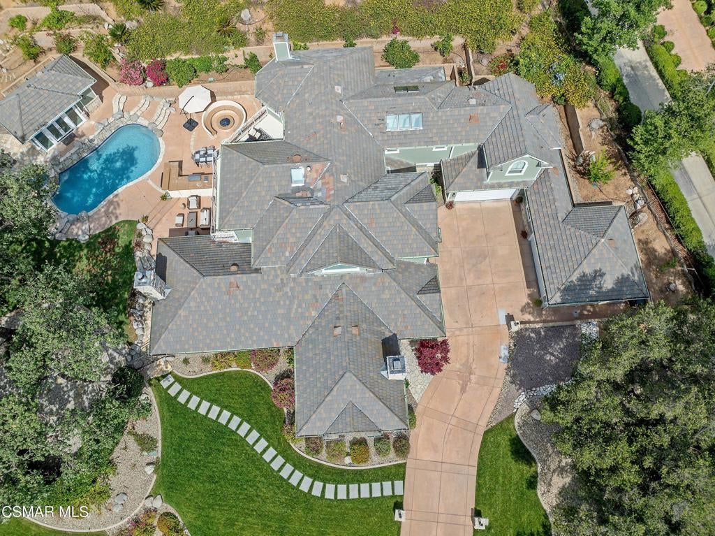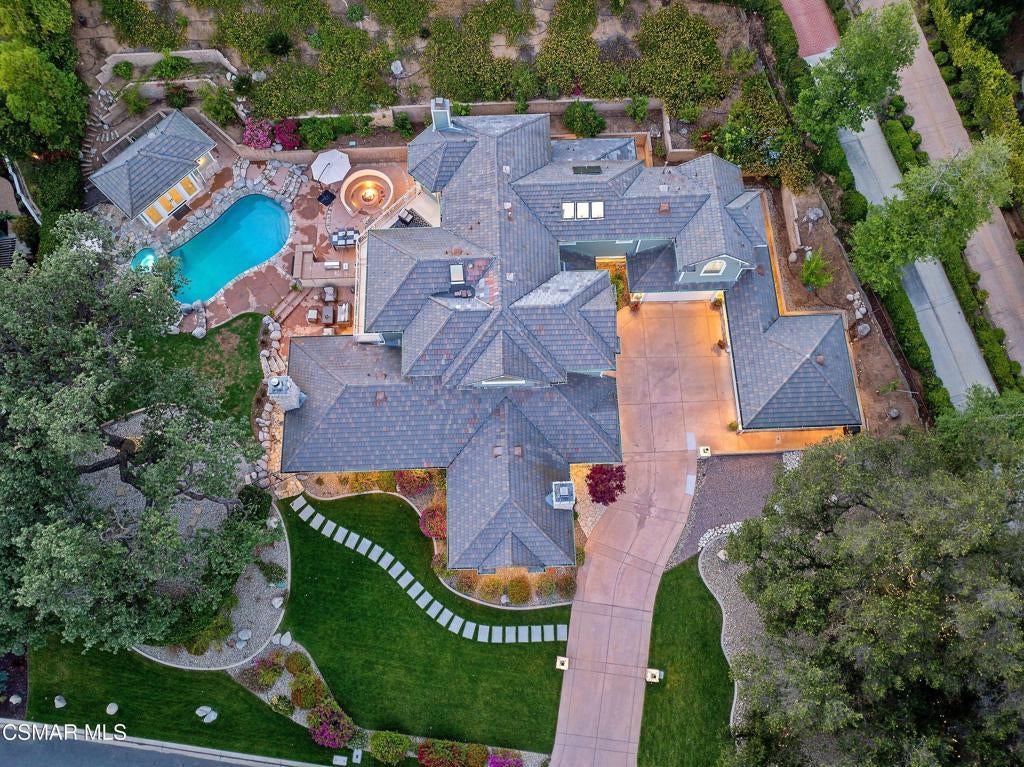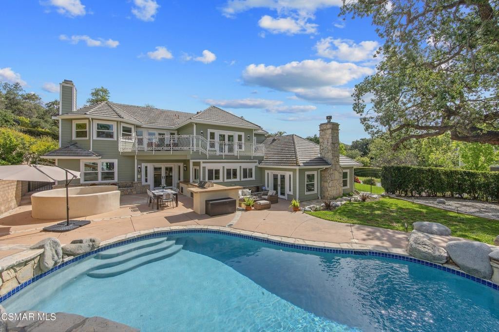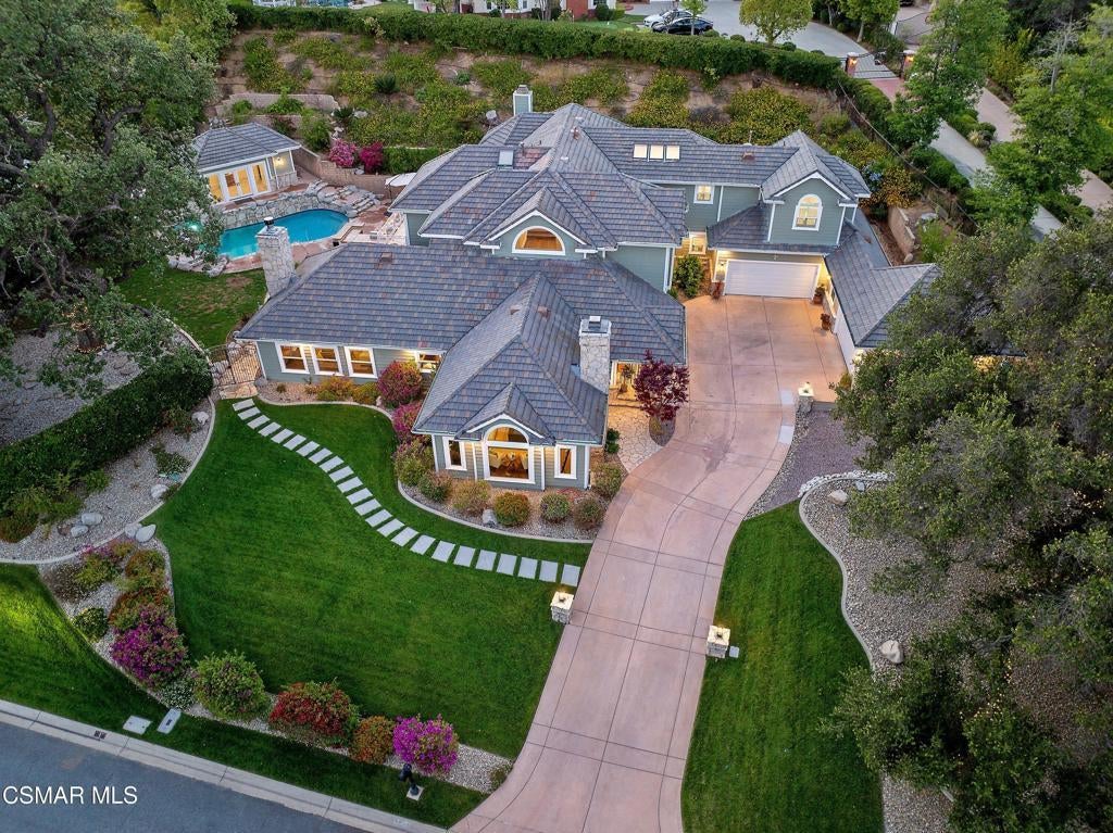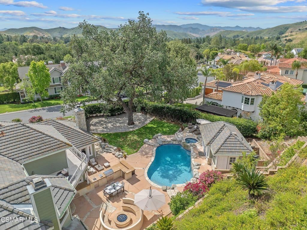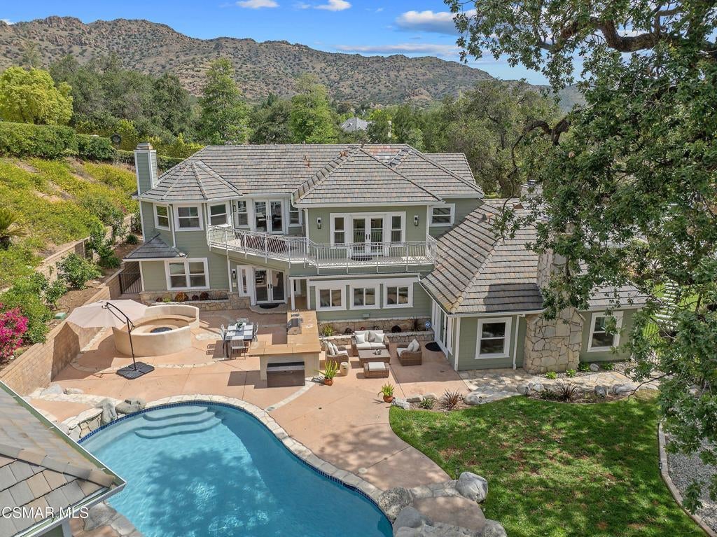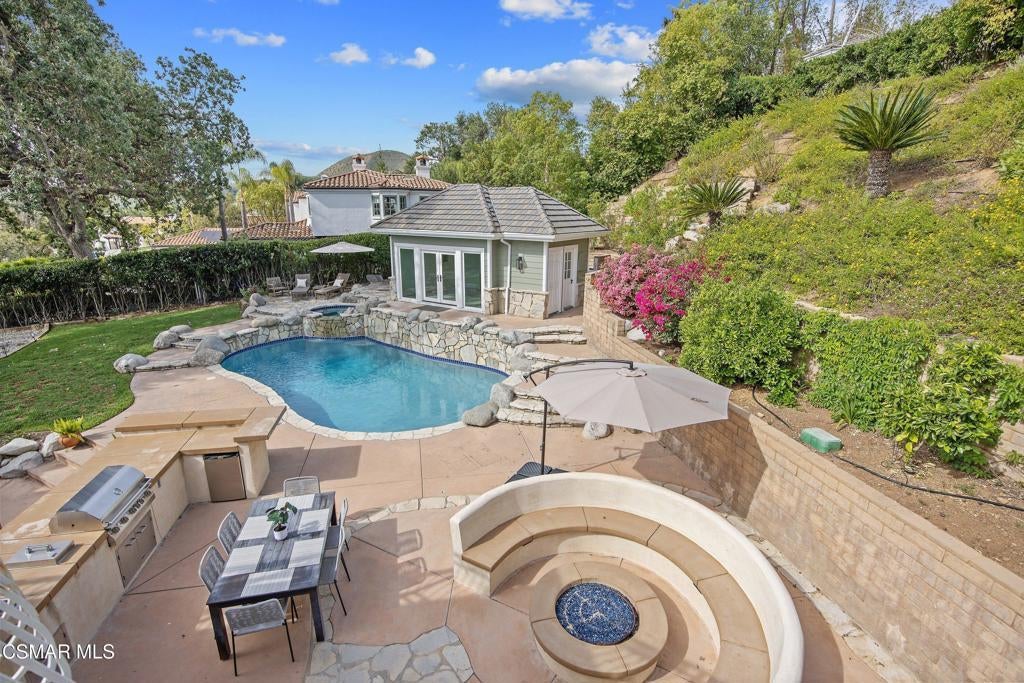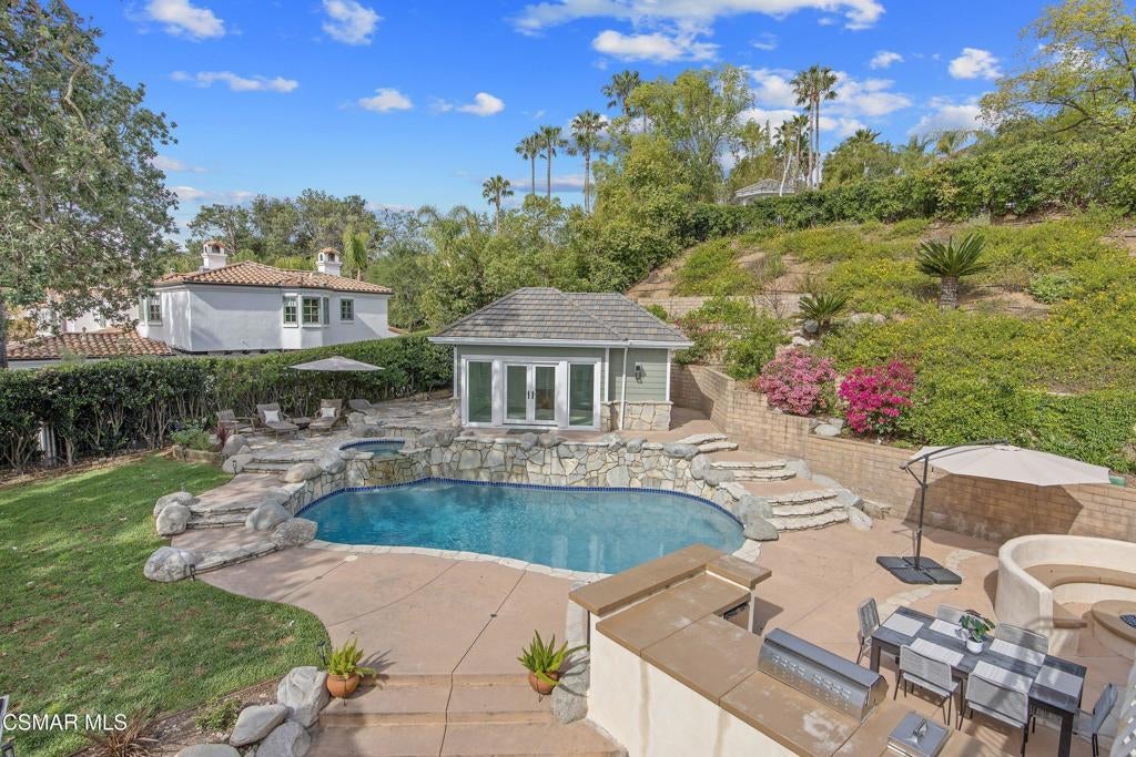 A Masterfully Reimagined North Ranch Estate. Set on a quiet three-quarter-acre lot in North Ranch's coveted Whitehawk neighborhood, 1401 Pathfinder is a study in refined luxury and thoughtful design. Spanning just under 6,300 square feet, this five-bedroom, six-bath residence w/ pool house has been completely transformed to feel elevated, effortless, and timeless.Enter through striking wrought-iron double doors and into a dramatic entry framed by a sweeping curved staircase, soaring ceilings, and natural light pouring in through custom windows. The formal living room, tucked behind pocket doors, balances sophistication and warmth with custom windows and a statement marble fireplace framed by twin custom bookcases. Throughout the home, curated architectural details- custom wainscoting and board-and-batten, newly installed hardwood floors, and elegant marble accents create cohesion and depth.Each bedroom is designed as a true retreat, featuring high ceilings, custom California Closets, and beautifully renovated ensuite baths finished with marble and custom tile. Two ensuite bedrooms on the main level offer private outdoor access, reinforcing the home's easy indoor-outdoor flow.The kitchen, redesigned in 2023, is both striking and highly functional. Wolf appliances, marble surfaces, custom cabinetry, an oversized island, and a walk-in pantry make it equally suited for everyday living and elevated entertaining. The adjoining breakfast area adds charm and practicality with traditional detailing, additional built-ins, and prep space.Anchoring the main level is an expansive great room that opens seamlessly to the kitchen and backyard. With soaring ceilings, a massive custom bar and bar area and a bold statement fireplace, it's the heart of the home--a space designed for gathering, celebrating, or unwinding in style.A downstairs office features built-in bookcases and offers the versatility to function as a den, library, or private workspace. The formal dining room has been thoughtfully reimagined as a private indoor gym, offering remarkable flexibility. This space easily accommodates large-scale formal dining, a recreation room, or a playroom, adapting effortlessly to your lifestyle.A well-appointed laundry room with sink and ample storage is conveniently located just outside the attached four-car garage, creating an efficient and practical transition space for daily living.Upstairs, three additional ensuite bedrooms await. Two open to a wraparound balcony overlooking the backyard, while the primary suite stands apart as a true sanctuary- generous in scale, offering a cozy seating area by its corner fireplace, and paired with a spa-inspired bath featuring a dual-head shower and soaking tub. Newly installed skylights shine natural light throughout.Outdoors, the property is designed for both relaxation and connection. A tropical lagoon-style pool and spa, gas fire pit with generous built-in seating, and a versatile pool house create an environment ready for hosting or peaceful evenings at home. Two 250 year-old oak trees and refreshed landscaping add privacy and serenity across the expansive grounds. Just minutes from North Ranch Country Club, premier golf, scenic trails, and everything Westlake Village has to offer, 1401 Pathfinder delivers space, privacy, and elevated living in one exceptional offering. Rarely does a home combine this level of design, scale, and setting. This is North Ranch living at its finest.