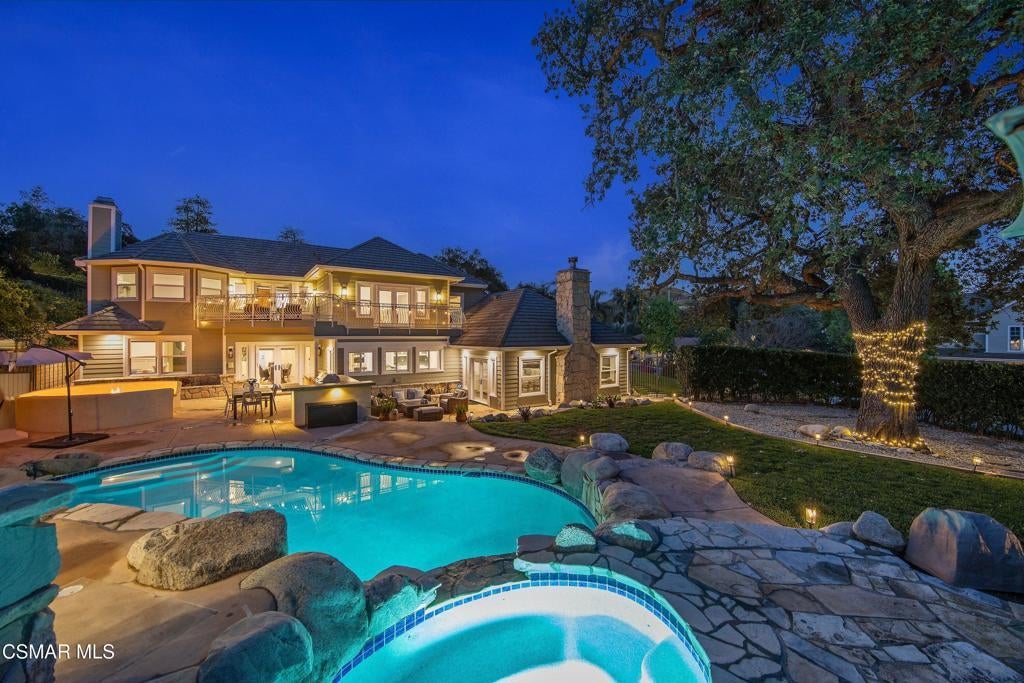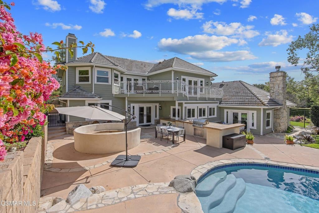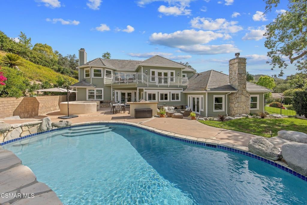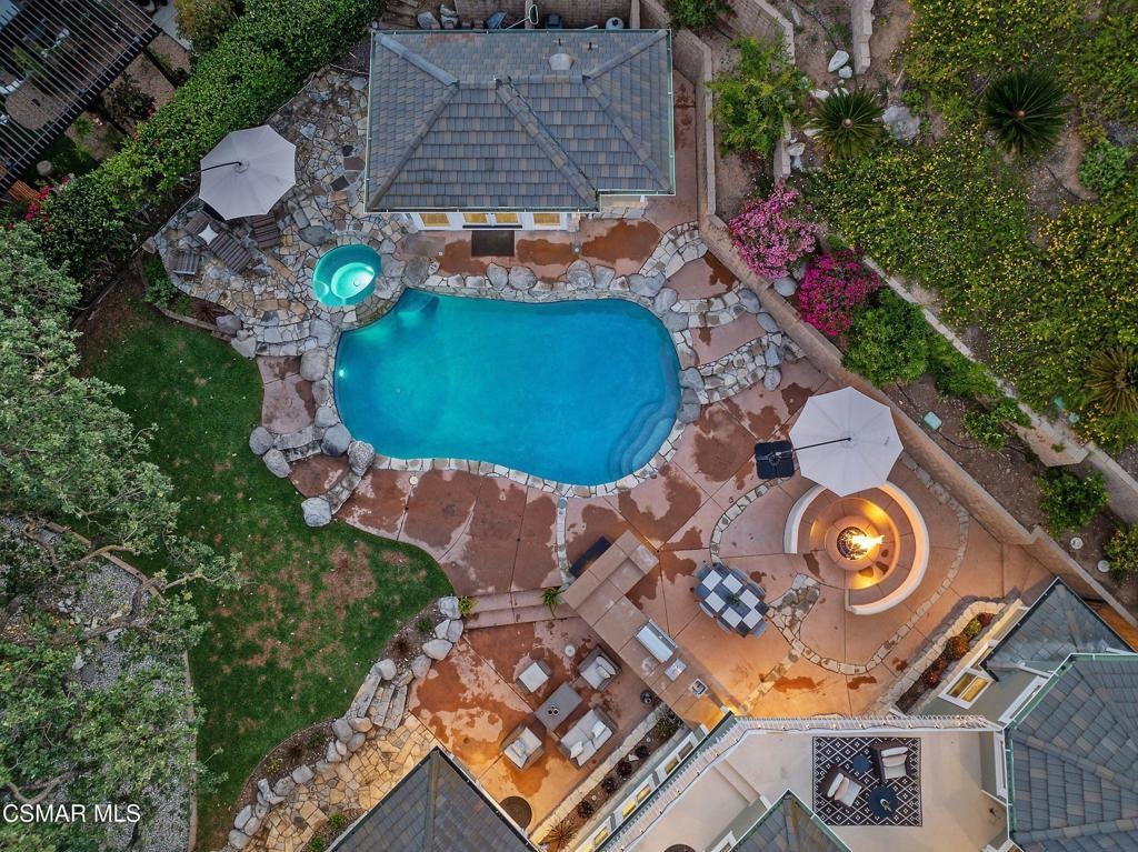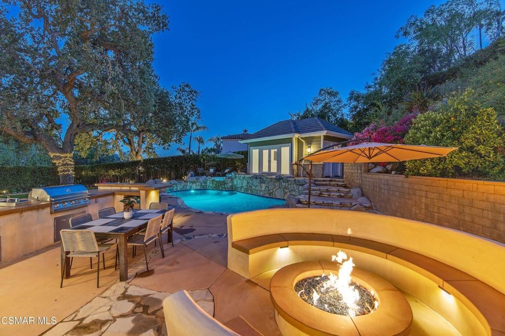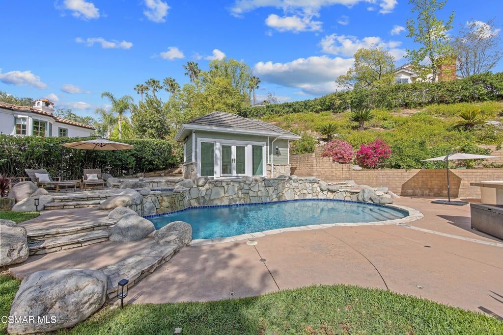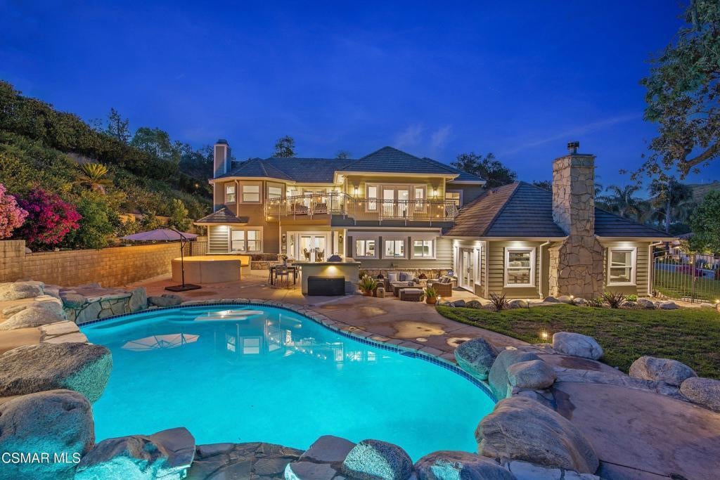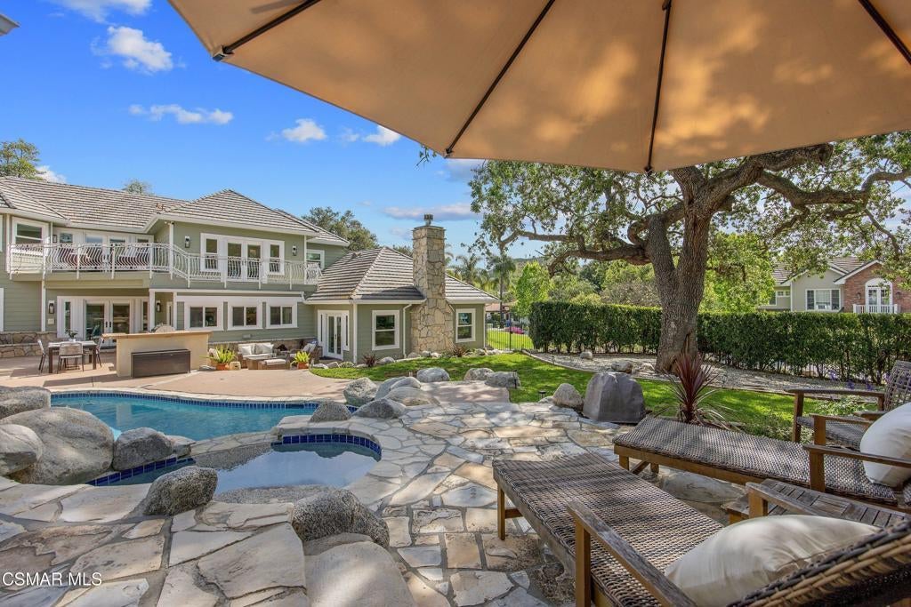 A Masterfully Reimagined North Ranch Estate. Set on a quiet three-quarter-acre lot in North Ranch's coveted Whitehawk neighborhood, 1401 Pathfinder is a study in refined luxury and thoughtful design. Spanning just under 6,300 square feet, this five-bedroom, six-bath residence w/ pool house has been completely transformed to feel elevated, effortless, and timeless.Enter through striking wrought-iron double doors and into a dramatic entry framed by a sweeping curved staircase, soaring ceilings, and natural light pouring in through custom windows. The formal living room, tucked behind pocket doors, balances sophistication and warmth with custom windows and a statement marble fireplace framed by twin custom bookcases. Throughout the home, curated architectural details- custom wainscoting and board-and-batten, newly installed hardwood floors, and elegant marble accents create cohesion and depth.Each bedroom is designed as a true retreat, featuring high ceilings, custom California Closets, and beautifully renovated ensuite baths finished with marble and custom tile. Two ensuite bedrooms on the main level offer private outdoor access, reinforcing the home's easy indoor-outdoor flow.The kitchen, redesigned in 2023, is both striking and highly functional. Wolf appliances, marble surfaces, custom cabinetry, an oversized island, and a walk-in pantry make it equally suited for everyday living and elevated entertaining. The adjoining breakfast area adds charm and practicality with traditional detailing, additional built-ins, and prep space.Anchoring the main level is an expansive great room that opens seamlessly to the kitchen and backyard. With soaring ceilings, a massive custom bar and bar area and a bold statement fireplace, it's the heart of the home--a space designed for gathering, celebrating, or unwinding in style.A downstairs office features built-in bookcases and offers the versatility to function as a den, library, or private workspace. The formal dining room has been thoughtfully reimagined as a private indoor gym, offering remarkable flexibility. This space easily accommodates large-scale formal dining, a recreation room, or a playroom, adapting effortlessly to your lifestyle.A well-appointed laundry room with sink and ample storage is conveniently located just outside the attached four-car garage, creating an efficient and practical transition space for daily living.Upstairs, three additional ensuite bedrooms await. Two open to a wraparound balcony overlooking the backyard, while the primary suite stands apart as a true sanctuary- generous in scale, offering a cozy seating area by its corner fireplace, and paired with a spa-inspired bath featuring a dual-head shower and soaking tub. Newly installed skylights shine natural light throughout.Outdoors, the property is designed for both relaxation and connection. A tropical lagoon-style pool and spa, gas fire pit with generous built-in seating, and a versatile pool house create an environment ready for hosting or peaceful evenings at home. Two 250 year-old oak trees and refreshed landscaping add privacy and serenity across the expansive grounds. Just minutes from North Ranch Country Club, premier golf, scenic trails, and everything Westlake Village has to offer, 1401 Pathfinder delivers space, privacy, and elevated living in one exceptional offering. Rarely does a home combine this level of design, scale, and setting. This is North Ranch living at its finest.