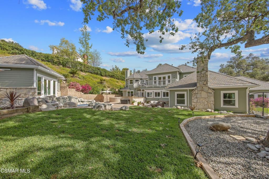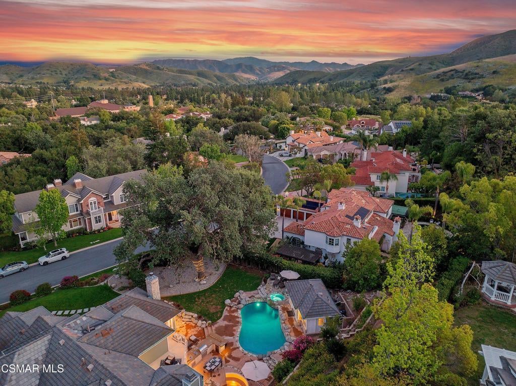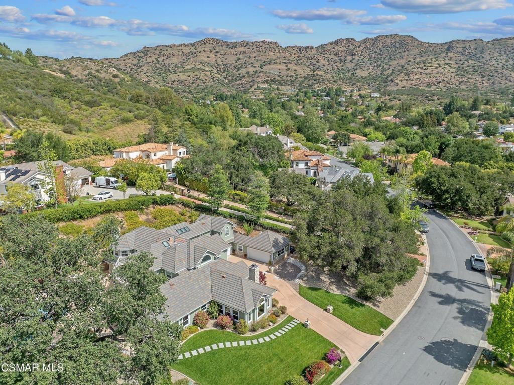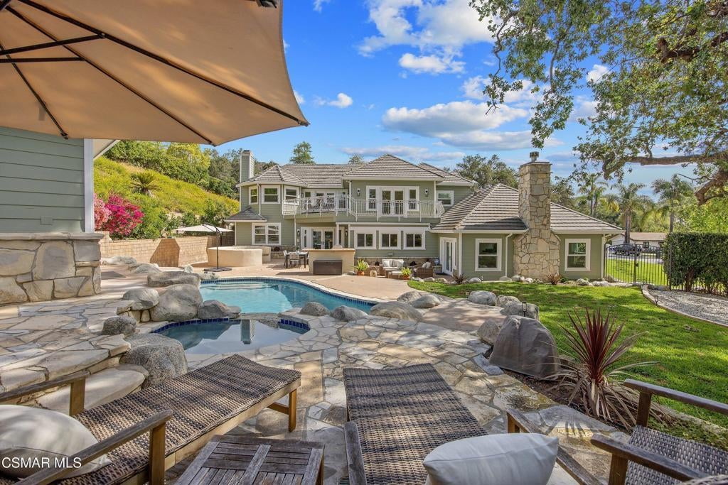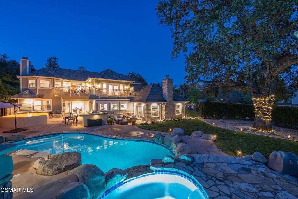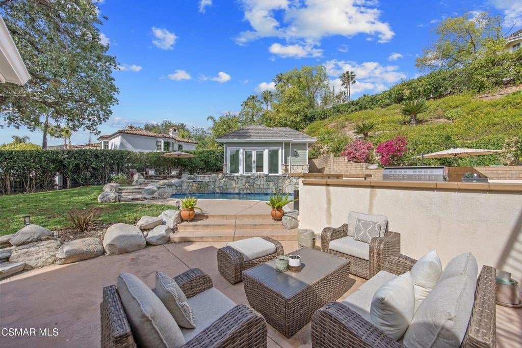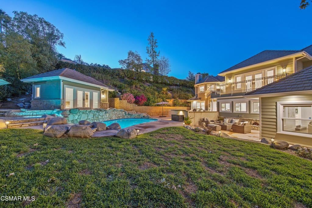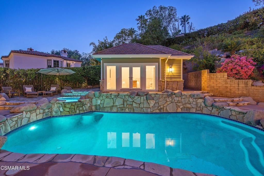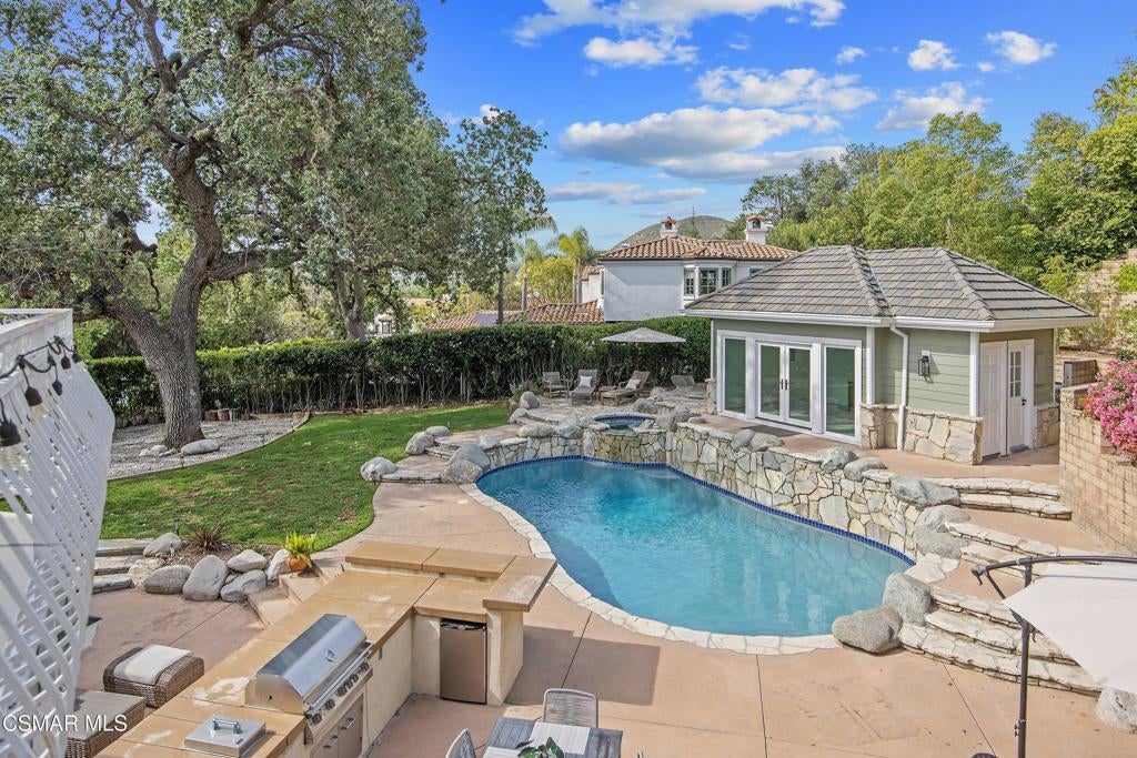 A Masterfully Reimagined North Ranch Estate. Set on a quiet three-quarter-acre lot in North Ranch's coveted Whitehawk neighborhood, 1401 Pathfinder is a study in refined luxury and thoughtful design. Spanning just under 6,300 square feet, this five-bedroom, six-bath residence w/ pool house has been completely transformed to feel elevated, effortless, and timeless.Enter through striking wrought-iron double doors and into a dramatic entry framed by a sweeping curved staircase, soaring ceilings, and natural light pouring in through custom windows. The formal living room, tucked behind pocket doors, balances sophistication and warmth with custom windows and a statement marble fireplace framed by twin custom bookcases. Throughout the home, curated architectural details- custom wainscoting and board-and-batten, newly installed hardwood floors, and elegant marble accents create cohesion and depth.Each bedroom is designed as a true retreat, featuring high ceilings, custom California Closets, and beautifully renovated ensuite baths finished with marble and custom tile. Two ensuite bedrooms on the main level offer private outdoor access, reinforcing the home's easy indoor-outdoor flow.The kitchen, redesigned in 2023, is both striking and highly functional. Wolf appliances, marble surfaces, custom cabinetry, an oversized island, and a walk-in pantry make it equally suited for everyday living and elevated entertaining. The adjoining breakfast area adds charm and practicality with traditional detailing, additional built-ins, and prep space.Anchoring the main level is an expansive great room that opens seamlessly to the kitchen and backyard. With soaring ceilings, a massive custom bar and bar area and a bold statement fireplace, it's the heart of the home--a space designed for gathering, celebrating, or unwinding in style.A downstairs office features built-in bookcases and offers the versatility to function as a den, library, or private workspace. The formal dining room has been thoughtfully reimagined as a private indoor gym, offering remarkable flexibility. This space easily accommodates large-scale formal dining, a recreation room, or a playroom, adapting effortlessly to your lifestyle.A well-appointed laundry room with sink and ample storage is conveniently located just outside the attached four-car garage, creating an efficient and practical transition space for daily living.Upstairs, three additional ensuite bedrooms await. Two open to a wraparound balcony overlooking the backyard, while the primary suite stands apart as a true sanctuary- generous in scale, offering a cozy seating area by its corner fireplace, and paired with a spa-inspired bath featuring a dual-head shower and soaking tub. Newly installed skylights shine natural light throughout.Outdoors, the property is designed for both relaxation and connection. A tropical lagoon-style pool and spa, gas fire pit with generous built-in seating, and a versatile pool house create an environment ready for hosting or peaceful evenings at home. Two 250 year-old oak trees and refreshed landscaping add privacy and serenity across the expansive grounds. Just minutes from North Ranch Country Club, premier golf, scenic trails, and everything Westlake Village has to offer, 1401 Pathfinder delivers space, privacy, and elevated living in one exceptional offering. Rarely does a home combine this level of design, scale, and setting. This is North Ranch living at its finest.