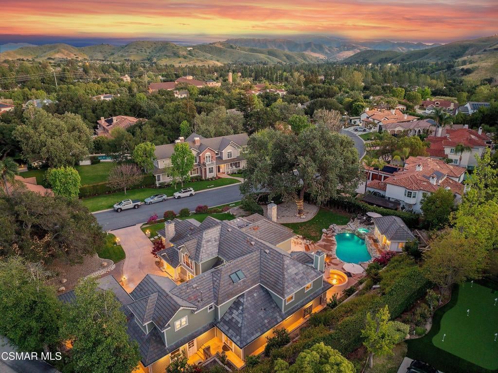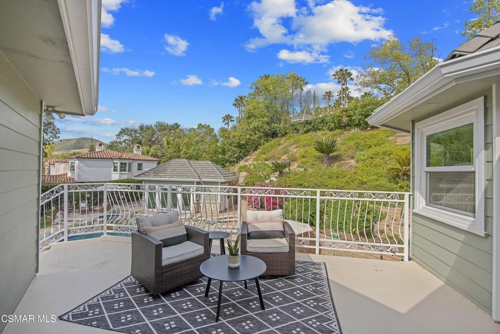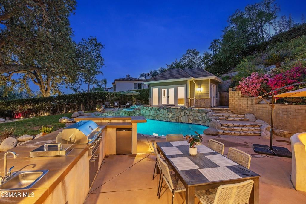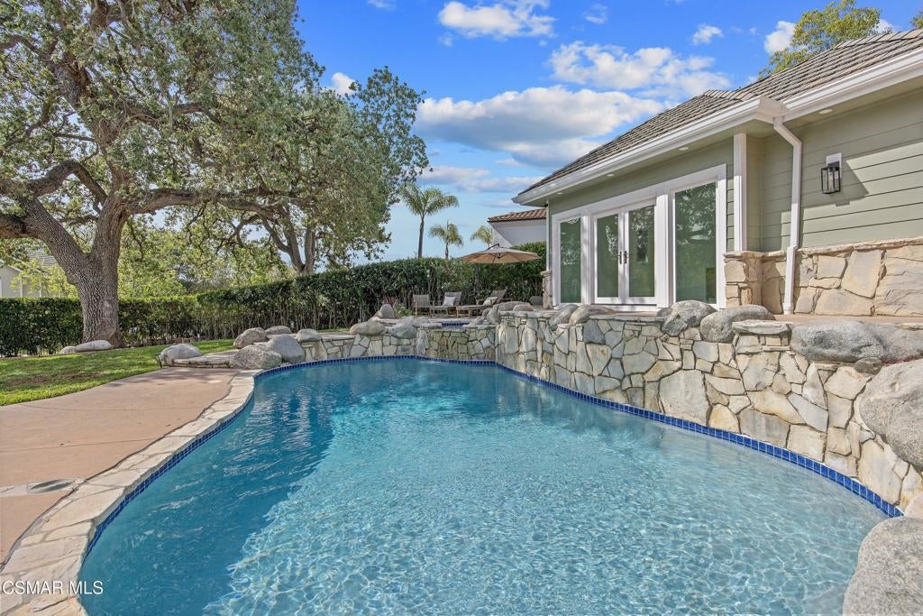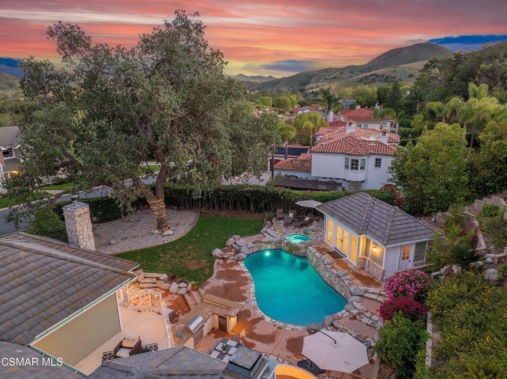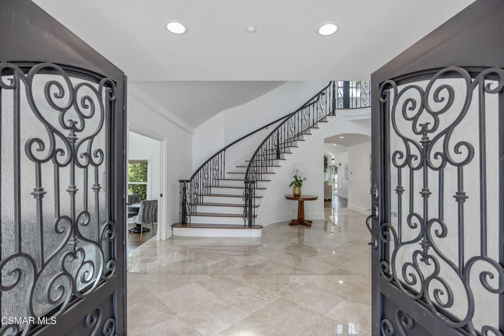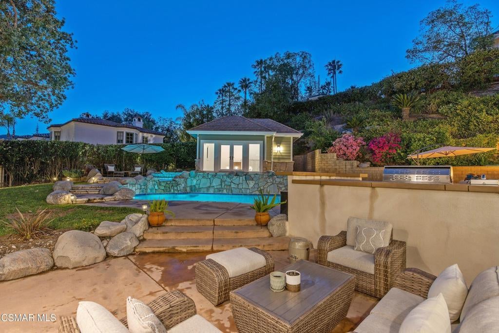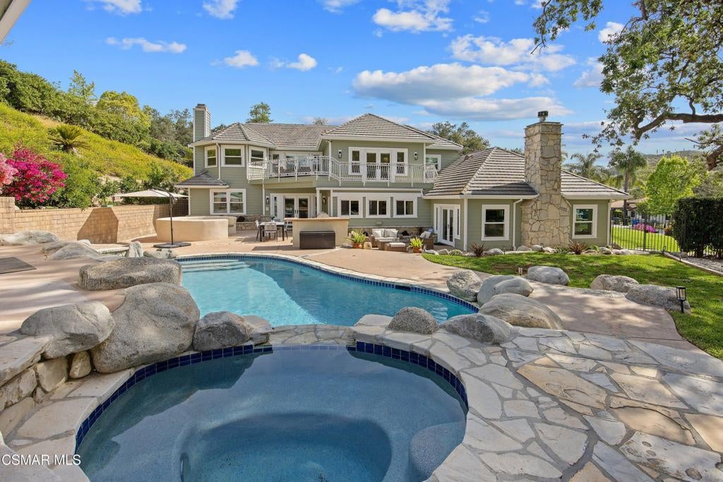 A Masterfully Reimagined North Ranch Estate. Set on a quiet three-quarter-acre lot in North Ranch's coveted Whitehawk neighborhood, 1401 Pathfinder is a study in refined luxury and thoughtful design. Spanning just under 6,300 square feet, this five-bedroom, six-bath residence w/ pool house has been completely transformed to feel elevated, effortless, and timeless.Enter through striking wrought-iron double doors and into a dramatic entry framed by a sweeping curved staircase, soaring ceilings, and natural light pouring in through custom windows. The formal living room, tucked behind pocket doors, balances sophistication and warmth with custom windows and a statement marble fireplace framed by twin custom bookcases. Throughout the home, curated architectural details- custom wainscoting and board-and-batten, newly installed hardwood floors, and elegant marble accents create cohesion and depth.Each bedroom is designed as a true retreat, featuring high ceilings, custom California Closets, and beautifully renovated ensuite baths finished with marble and custom tile. Two ensuite bedrooms on the main level offer private outdoor access, reinforcing the home's easy indoor-outdoor flow.The kitchen, redesigned in 2023, is both striking and highly functional. Wolf appliances, marble surfaces, custom cabinetry, an oversized island, and a walk-in pantry make it equally suited for everyday living and elevated entertaining. The adjoining breakfast area adds charm and practicality with traditional detailing, additional built-ins, and prep space.Anchoring the main level is an expansive great room that opens seamlessly to the kitchen and backyard. With soaring ceilings, a massive custom bar and bar area and a bold statement fireplace, it's the heart of the home--a space designed for gathering, celebrating, or unwinding in style.A downstairs office features built-in bookcases and offers the versatility to function as a den, library, or private workspace. The formal dining room has been thoughtfully reimagined as a private indoor gym, offering remarkable flexibility. This space easily accommodates large-scale formal dining, a recreation room, or a playroom, adapting effortlessly to your lifestyle.A well-appointed laundry room with sink and ample storage is conveniently located just outside the attached four-car garage, creating an efficient and practical transition space for daily living.Upstairs, three additional ensuite bedrooms await. Two open to a wraparound balcony overlooking the backyard, while the primary suite stands apart as a true sanctuary- generous in scale, offering a cozy seating area by its corner fireplace, and paired with a spa-inspired bath featuring a dual-head shower and soaking tub. Newly installed skylights shine natural light throughout.Outdoors, the property is designed for both relaxation and connection. A tropical lagoon-style pool and spa, gas fire pit with generous built-in seating, and a versatile pool house create an environment ready for hosting or peaceful evenings at home. Two 250 year-old oak trees and refreshed landscaping add privacy and serenity across the expansive grounds. Just minutes from North Ranch Country Club, premier golf, scenic trails, and everything Westlake Village has to offer, 1401 Pathfinder delivers space, privacy, and elevated living in one exceptional offering. Rarely does a home combine this level of design, scale, and setting. This is North Ranch living at its finest.